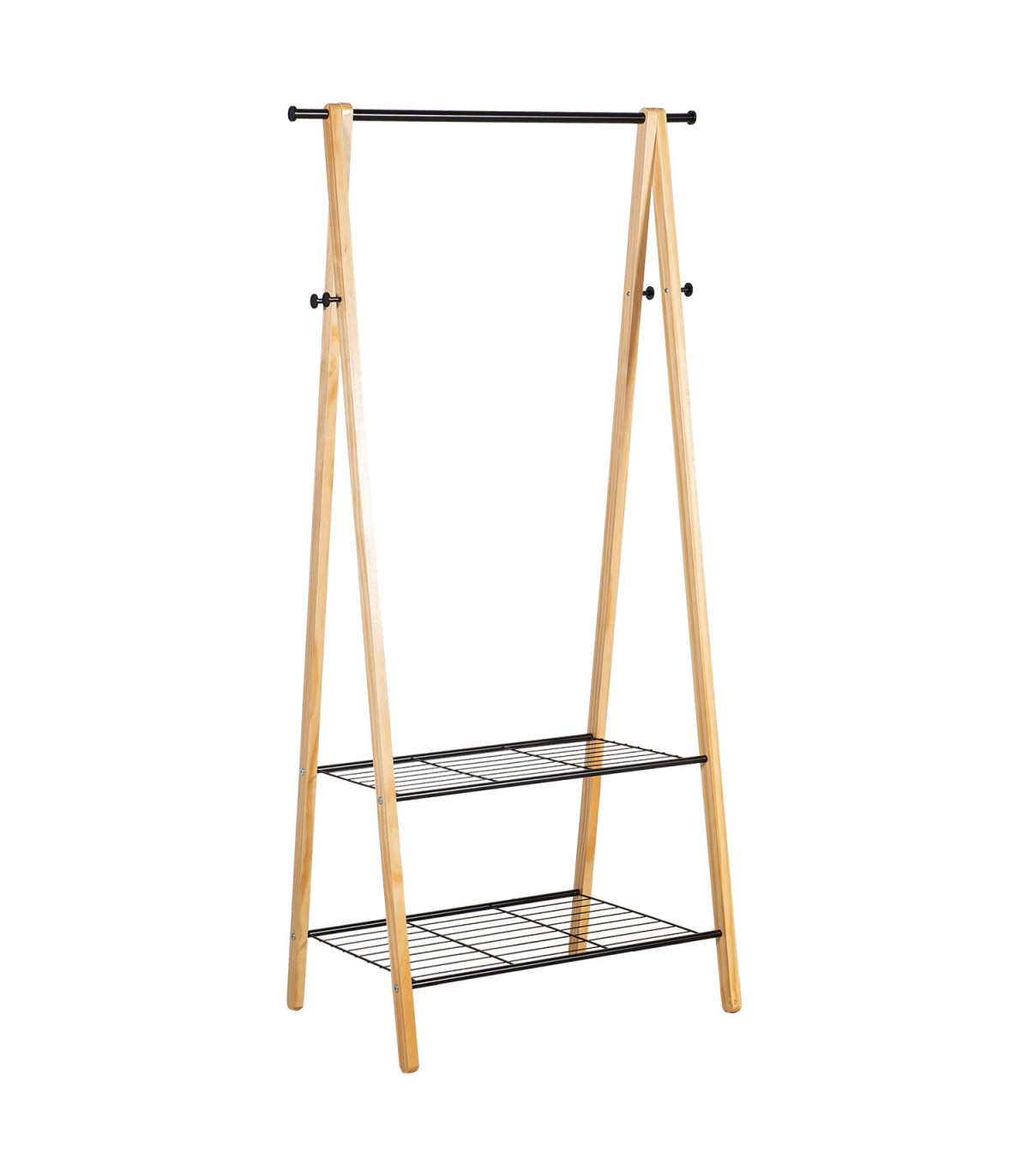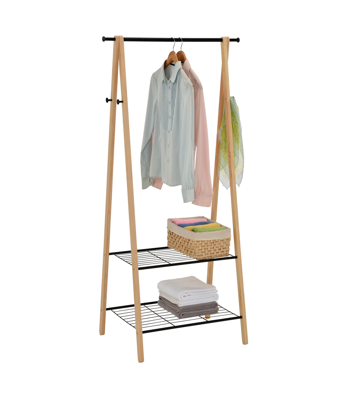 Stange FOREST 2-riiuli ja 4-nagiga 79x45xH155cm, materjal: männipuit/teras, värvus: naturaalne/must. Kaalupiirang: stange 10kg, riiulid 8kg.