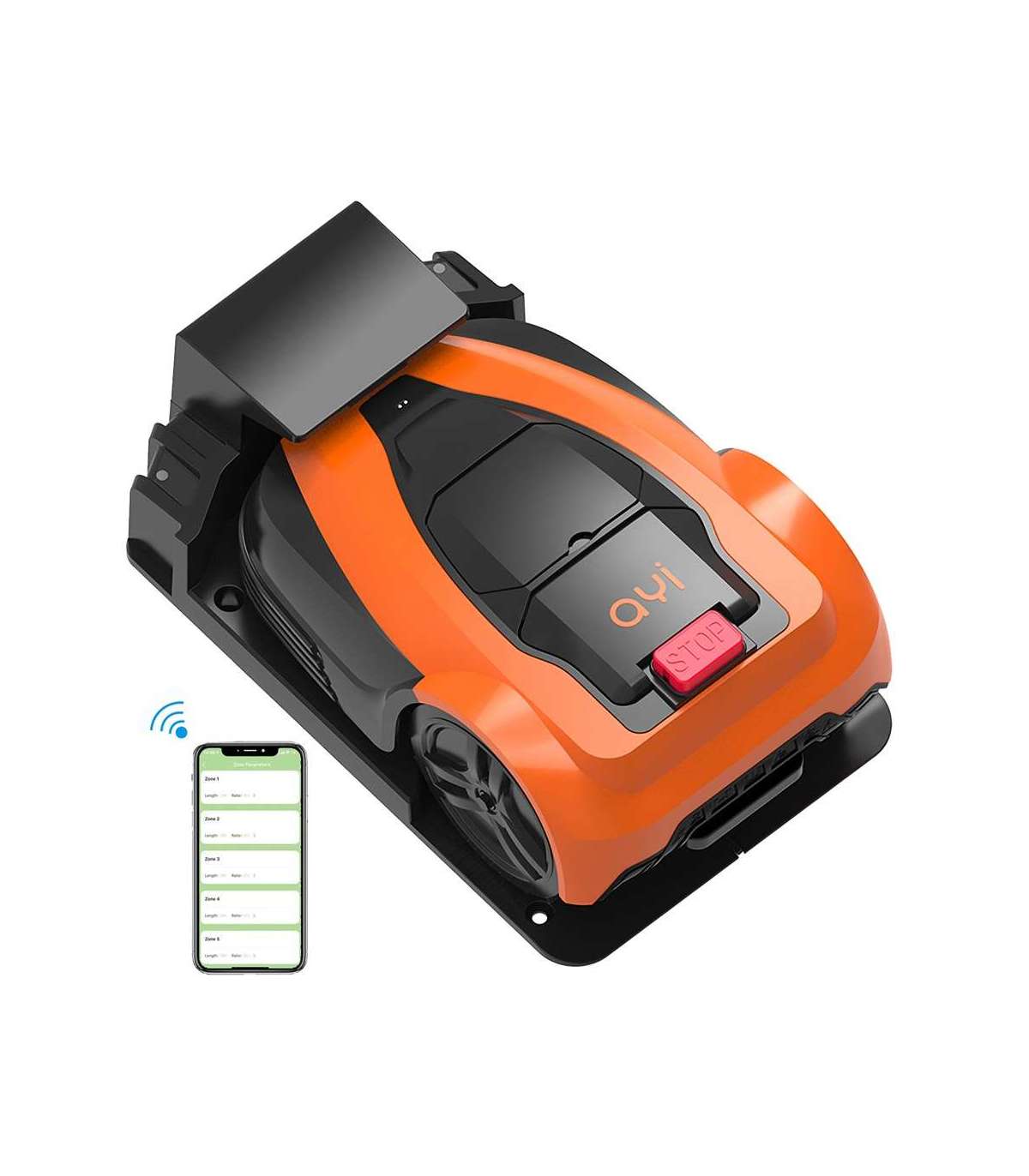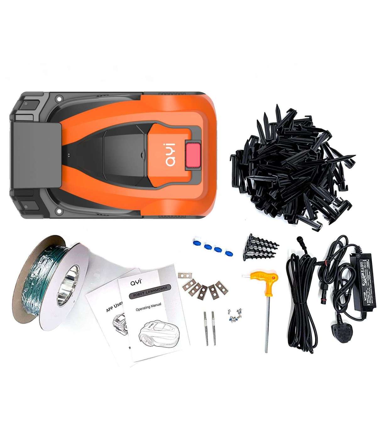 AYI | Lawn Mower | A1 1400i | Mowing Area 1400 m² | WiFi APP Yes (Android; iOs) | Working time 120 min | Brushless Motor | Maximum Incline 37 % | Speed 22 m/min | Waterproof IPX4 | 68 dB | 5200 mAh | 180 m boundary wire; 180 pcs. staples; 10 x Cutting Blade Screws; 2 x Distance Gauges; 1 x Charging Station, 4 x Nails For Fixing Charging Station; 1 x Allen Key; 1x 5 m Extension Cord