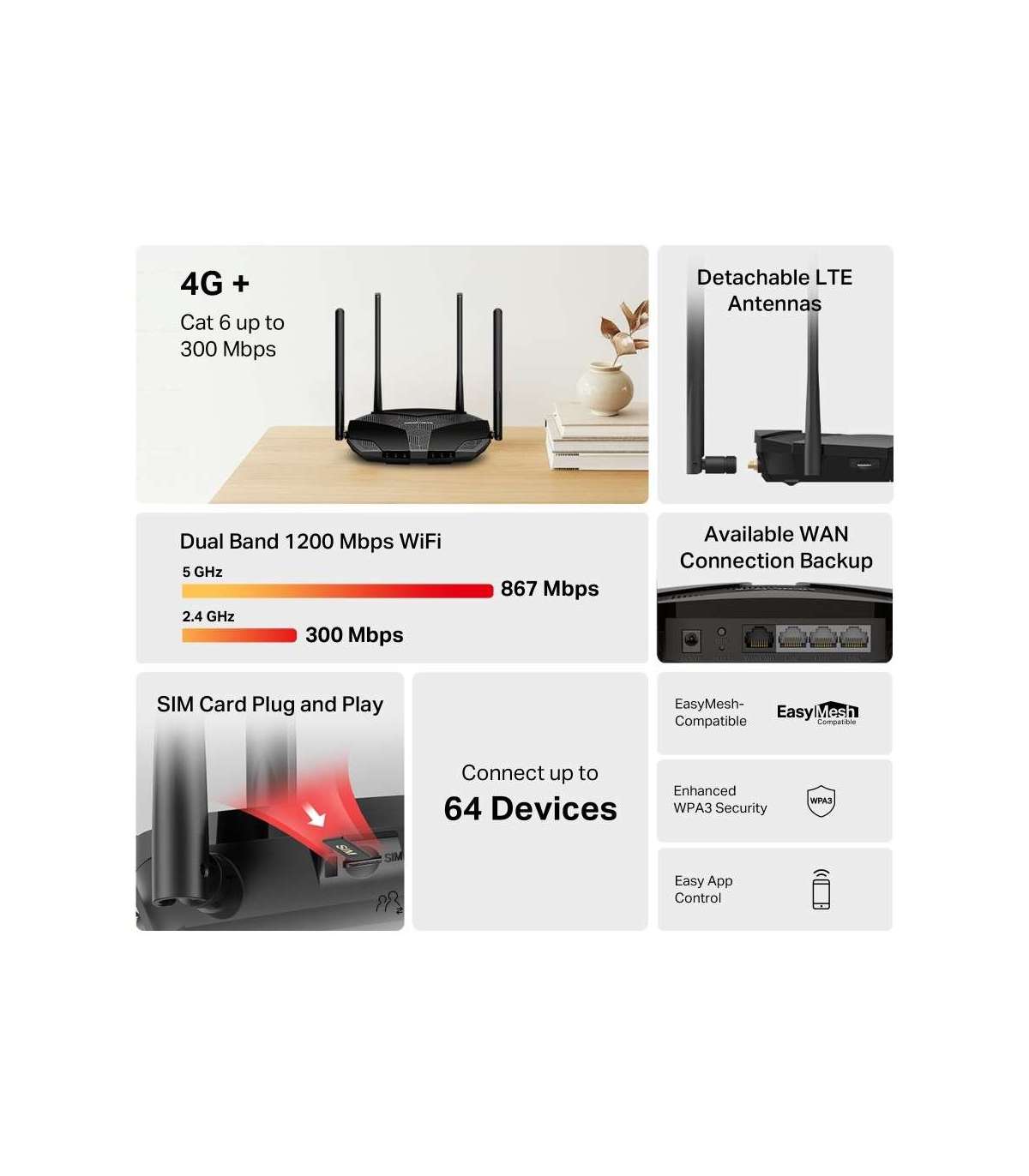 - 4G+ Cat6 AC1200 Wireless Dual Band Gigabit Router