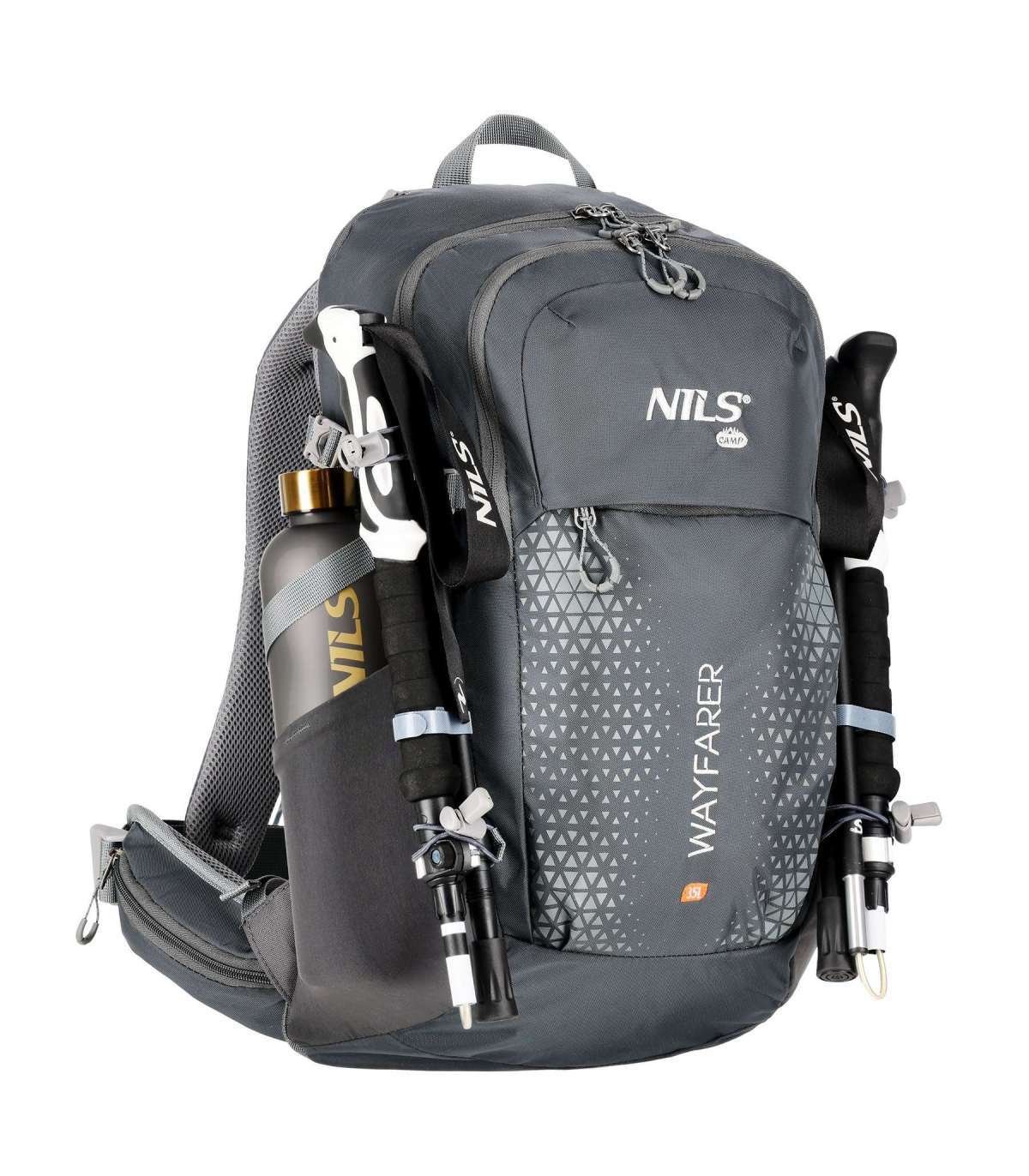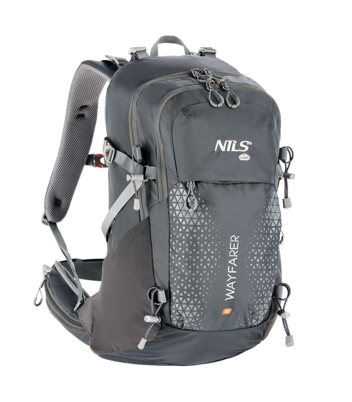 NC1925 BACKPACK TOURIST GRAY WAYFARER 35L NILS CAMPNILS CAMP presents the NC1925 Wayfarer Black 35L Hiking Backpack, which is an excellent choice for anyone who values functionality and comfort on long trips.Capacity and thoughtful organizationThe Wayfarer backpack offers a capacity of 35 liters, allowing you to pack plenty of gear, supplies and clothing. Equipped with two main zippered compartments with separate dividers, it facilitates organization and provides easy access to contents.Advanced features for comfort and convenienceThe backpack is equipped with a number of compartments and pockets that facilitate efficient space management. It uses an advanced "Air Flow System" ventilation system that effectively separates the main compartment from the user's back, ensuring continuous airflow, which significantly improves carrying comfort, especially on warm days. In addition, the back panel's removable frame, which helps relieve pressure on the spine, is easy to remove, which proves very practical when cleaning the backpack.Water protectionThe backpack is made of advanced materials that protect against light rain, and an additional rain cover provides protection against stronger precipitation. The quick and easy installation of the cover ensures that your belongings stay dry even during unforeseen weather changes.Safety and additional featuresThere is an integrated rescue whistle on the chest strap buckle for added safety in emergency situations. The backpack also offers an additional panel of handles for mounting accessories such as trekking poles. Two side mesh pockets and zippered pockets on the waist belt allow you to store items you want to keep close at hand, such as your phone.Specification:Material: 80% Nylon, 20% Polyester, steelCapacity: 35lDimensionsHeight: 60cmWidth: 35cmDepth: 22cmChest strap adjustable: up to 34cmAdjustable hip belt: up to 75cmWeight: 900gNumber of zipper pockets: 6Number of compartments: 2Side mesh pockets: 2Rain coverTie-down straps for additional gearSafety whistleTank holder: yesRemovable, breathable ventilation panel with frame: yesRemarks:Not for commercial use24 months warrantyImporter: Abisal Ltd. | Poland | 41-807 Zabrze | Pyskowicka Street 17 | e-mail: abisal@abisal.plAbisal Ltd.. declares that the products sold by the company are safe and meet the requirements contained in the Act on General Product Safety of December 12, 2003. (Journal of Laws of December 31, 2003)