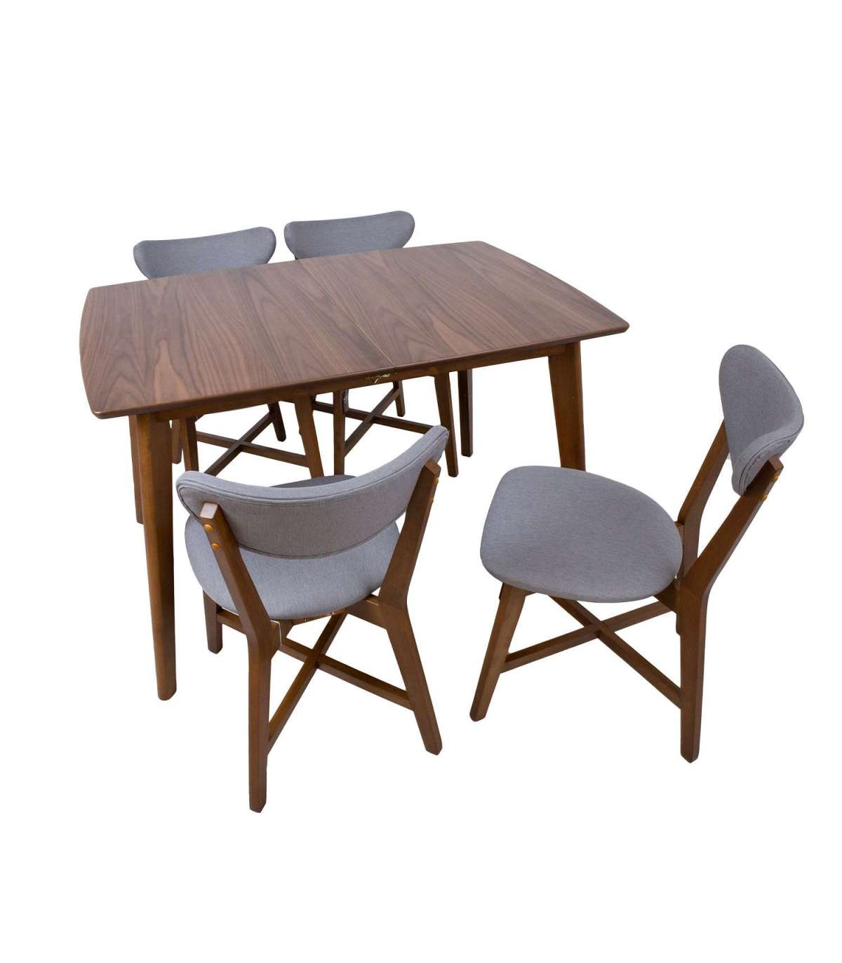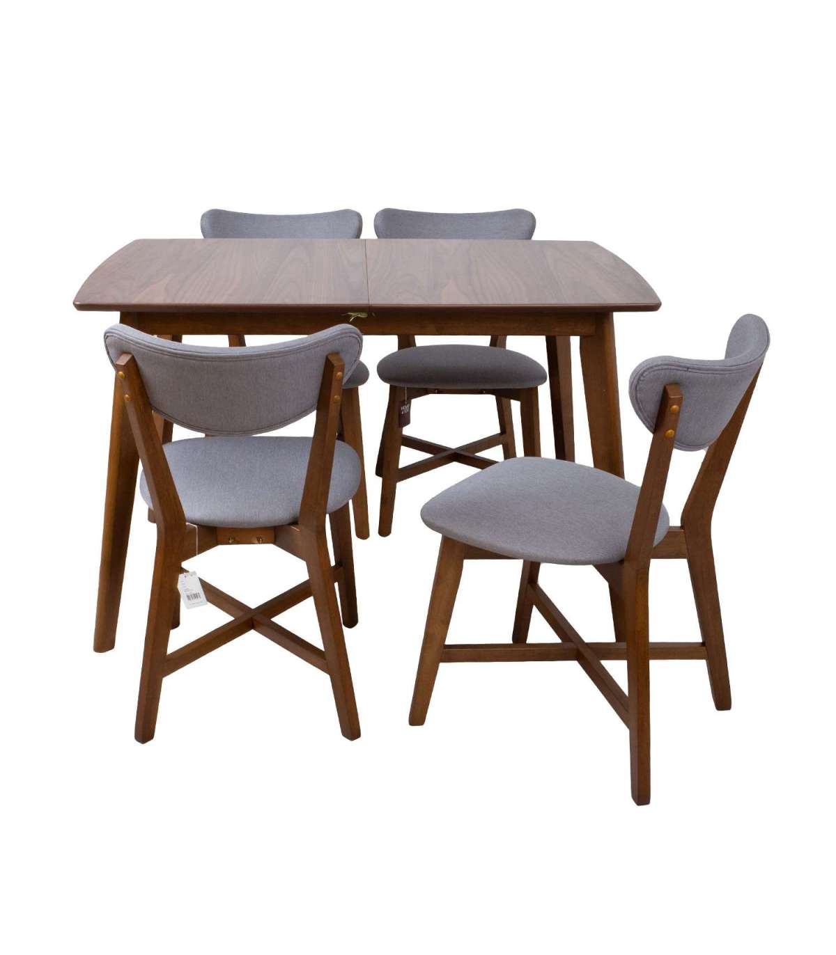 Söögilauakomplekt JESPER 4-tooliga. Lauaplaat: MDF naturaalse pähklispooniga. Laua jalad ja raam on valmistatud kummipuust. Laud on viimistletud pähkli toonis lakiga. Laud on keskelt pikendatav, 40cm lai keskelt kokku klapitav pikendusosa asub lauaplaadi all. Laua mõõdud on 120/160x80xH76cm. Tooli kergelt polsterdatud iste on kaetud halli polüesterkangaga. Tooli jalad ja raam on valmistatud kummipuust ja viimistletud pähkli toonis lakiga. Tooli üldmõõdud on 44x56x79,5cm. Istme kõrgus 45,5cm. Kaalupiirang 100kg.