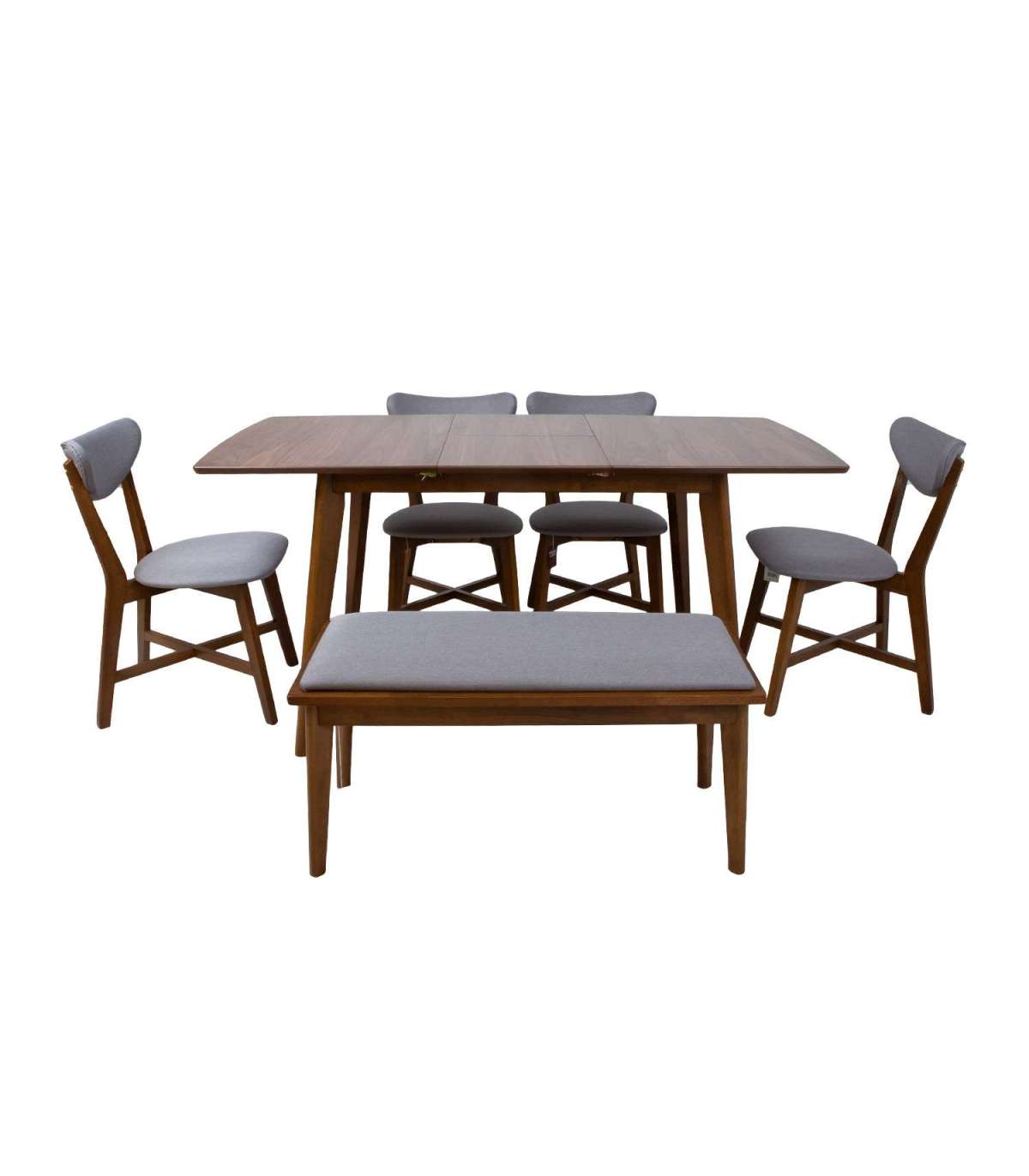 Söögilauakomplekt JESPER 4-tooli ja pingiga. Lauaplaat: MDF naturaalse pähklispooniga. Laua jalad ja raam on valmistatud kummipuust. Laud on viimistletud pähkli toonis lakiga. Laud on keskelt pikendatav, 40cm lai keskelt kokku klapitav pikendusosa asub lauaplaadi all. Laua mõõdud on 120/160x80xH76cm. Tooli kergelt polsterdatud iste on kaetud halli polüesterkangaga. Tooli jalad ja raam on valmistatud kummipuust ja viimistletud pähkli toonis lakiga. Tooli üldmõõdud on 44x56x79,5cm. Istme kõrgus 45,5cm. Kaalupiirang 100kg. Pingi kergelt polsterdatud iste on kaetud halli polüesterkangaga. Pingi jalad ja raam on valmistatud kummipuust ja viimistletud pähkli toonis lakiga. Pingi mõõdud on 92x40xH45cm.
