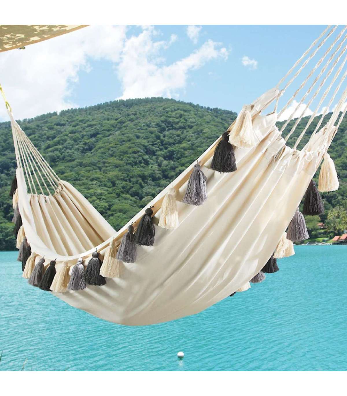 Rippkiik TASSELS loodusvalge. Rippkiik on valmistatud käsitööna El Salvadori meistrite poolt, hoides au sees iidset kultuuri ja traditsioonilisi töövõtteid. Puuvillane kangas on kootud käsitelgedel. Kiige ääri kaunistavad hallid ja valged pilkupüüdvad tutid. Polüesternöörid tagavad kiige parema vastupidavuse ja tugevuse. Kiige võib paigaldada kahe puu või posti vahele. Samuti on võimalik kiige üles riputamiseks kasutada kandejalga. Kinnituspunktide kaugus üksteisest peab olema vähemalt 25-30cm pikem kiige üldpikkusest. Rippkiige mõõdud on 127x230/320cm ning maksimaalne kandevõime on 120kg. HOOLDUS: toote eluea pikendamiseks kaitske seda ilmastikuolude eest. Kanga ja nööride vastupidavus väheneb UV-kiirguse ja liigniiskuse mõjul ning värvid tuhmuvad. Võimalusel pange rippkiik alati peale kasutamist hoiule kuiva ja hea ventilatsiooniga ruumi. Enne hoiule panekut laske kiigel täielikult ära kuivada. Kiike võib pesta käsitsi kuni 40° vees. Kasutage ainult leebeid pesuvahendeid.