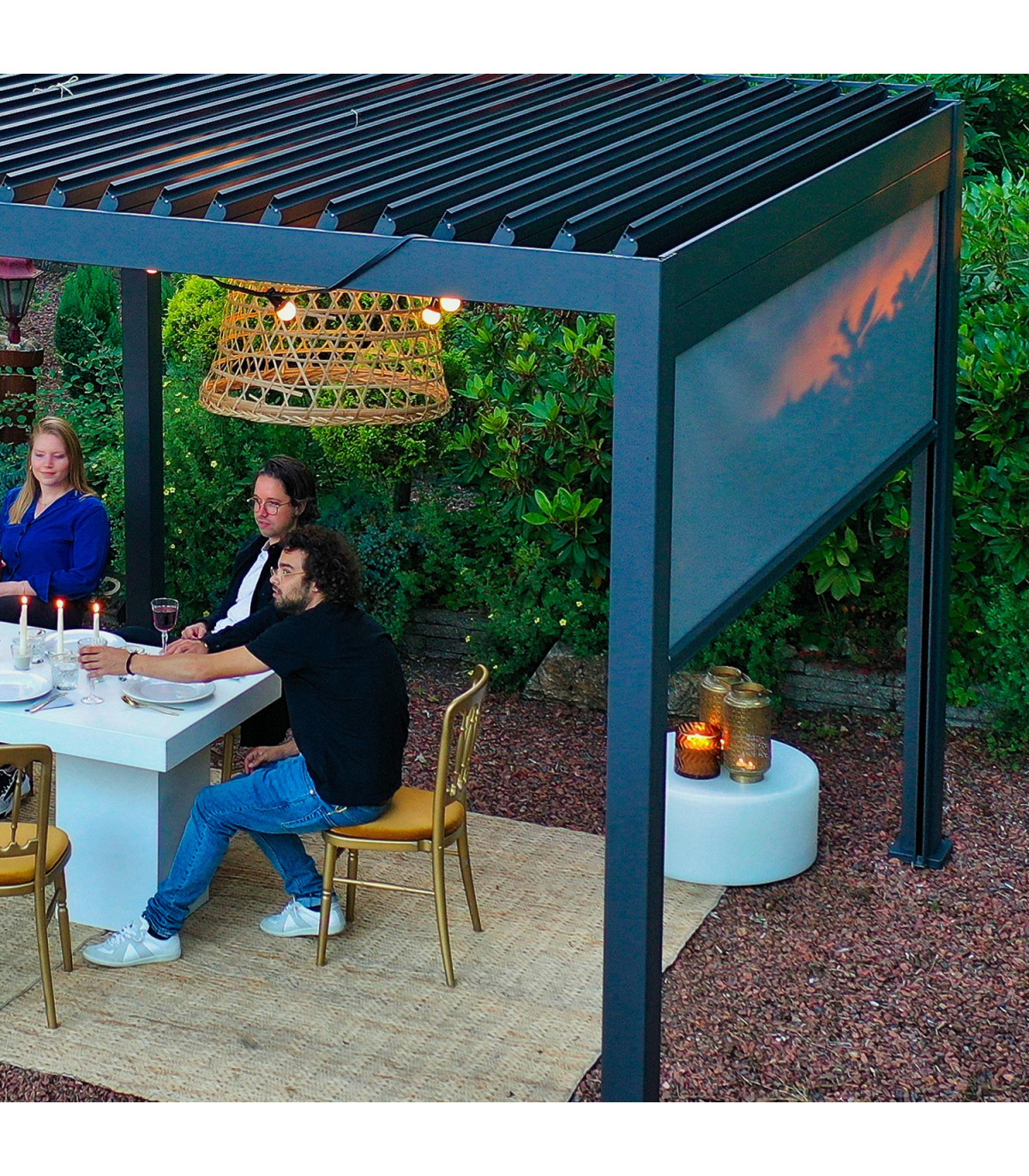 Ruloosein on mugav ja elegantne lahendus, et muuta varikatus MIRADOR-111 kiiresti ilmastikuoludele vastavaks. Õhukesest textilene võrgust sein pakub nii varju, kui privaatsust ja kaitseb hästi sääskede eest.