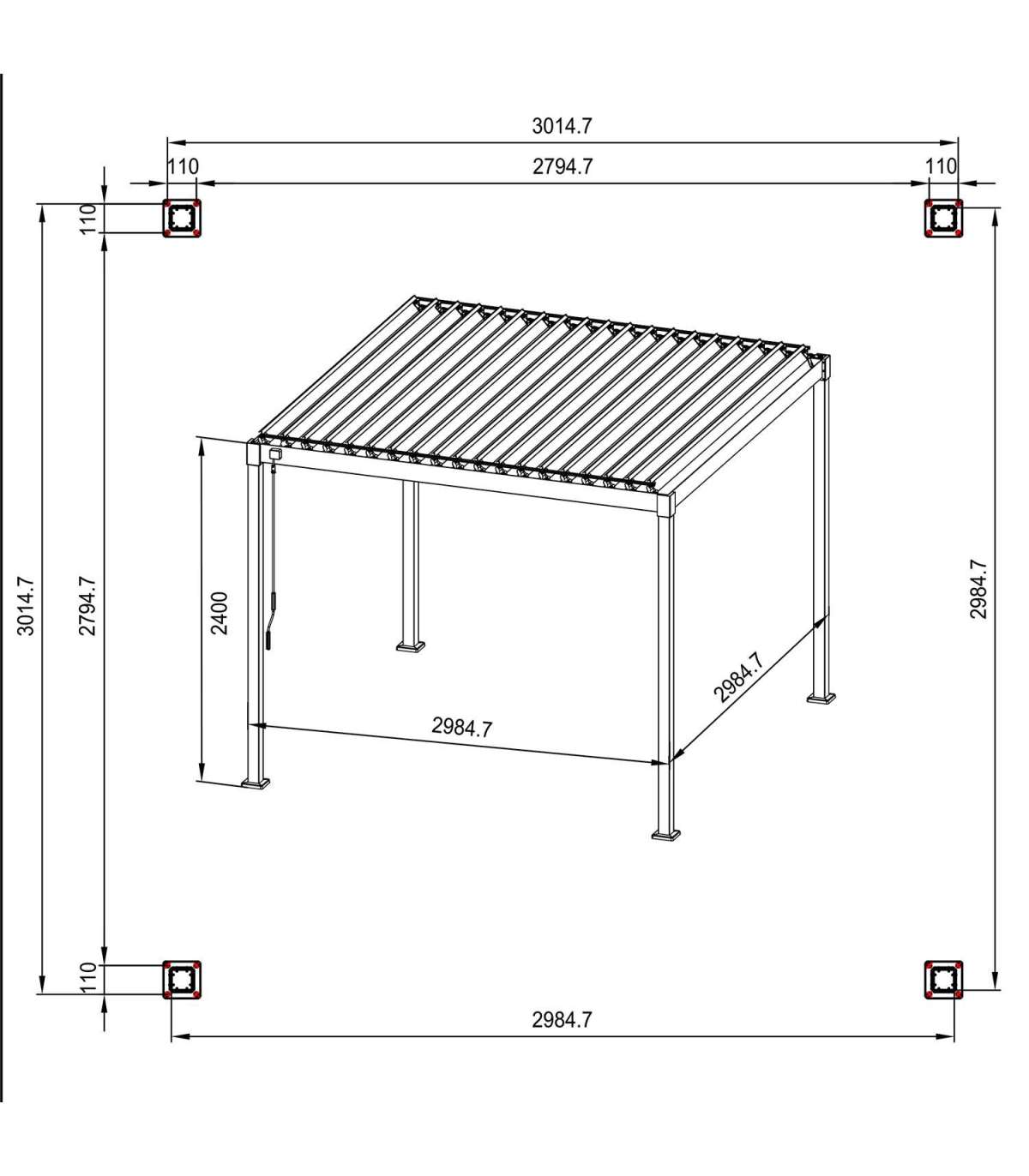 Varikatuse täpsed mõõdud on 2984,7x2984,7x2400mm.