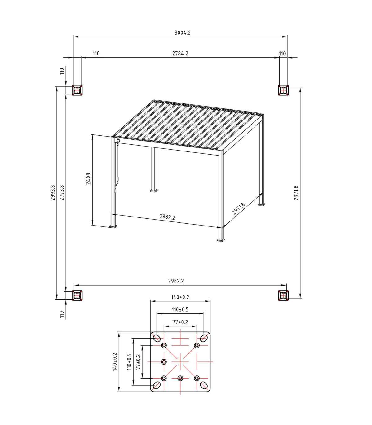 Varikatuse täpsed mõõdud on 2982,2x2971,8x2408mm.