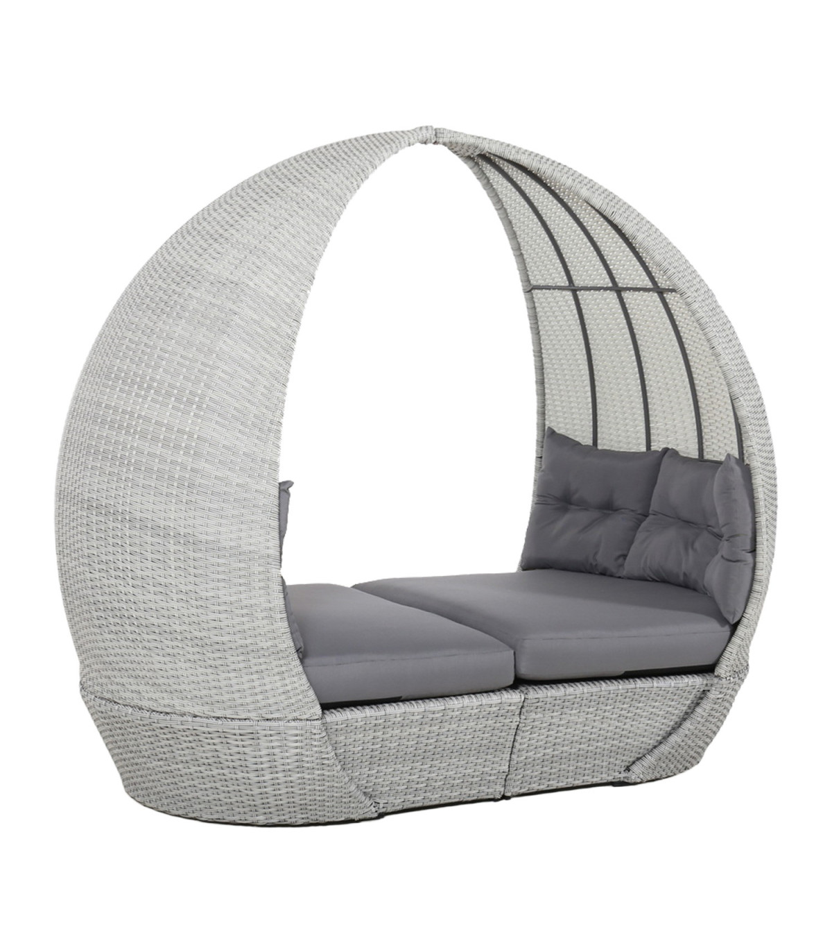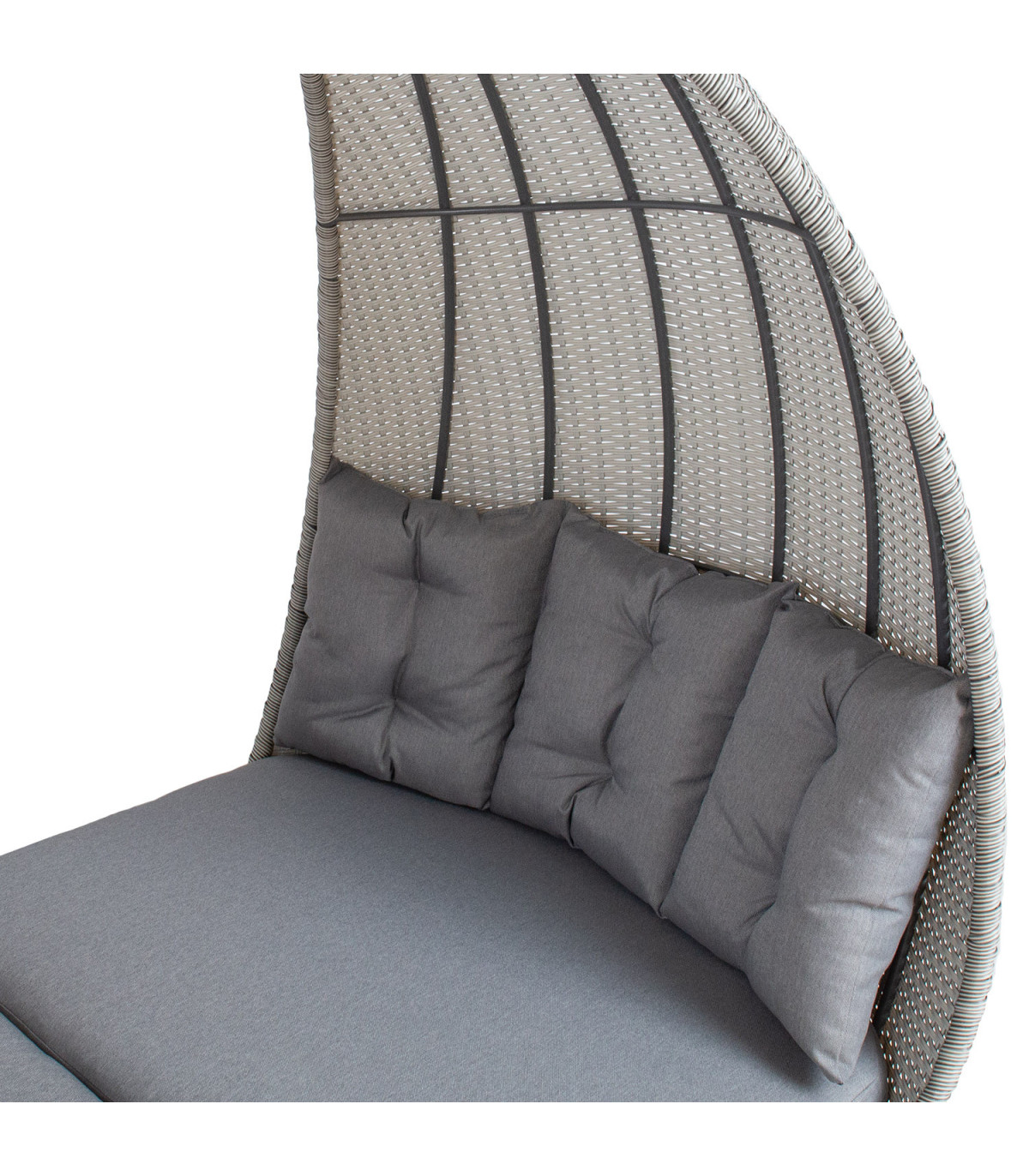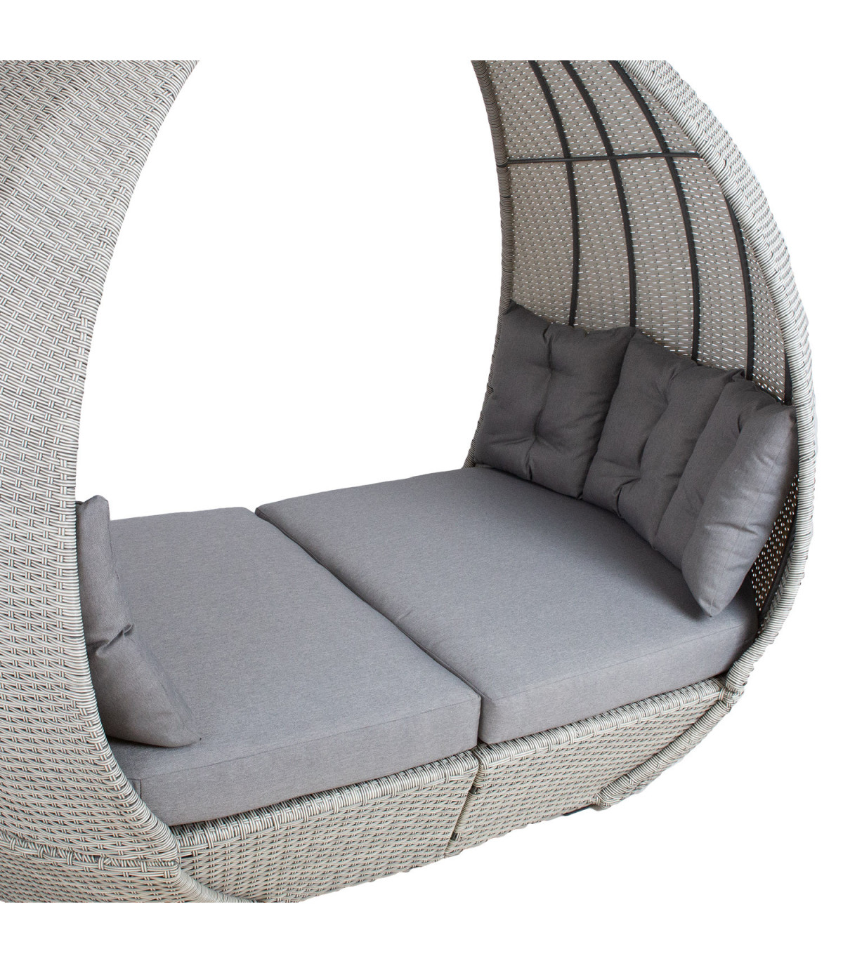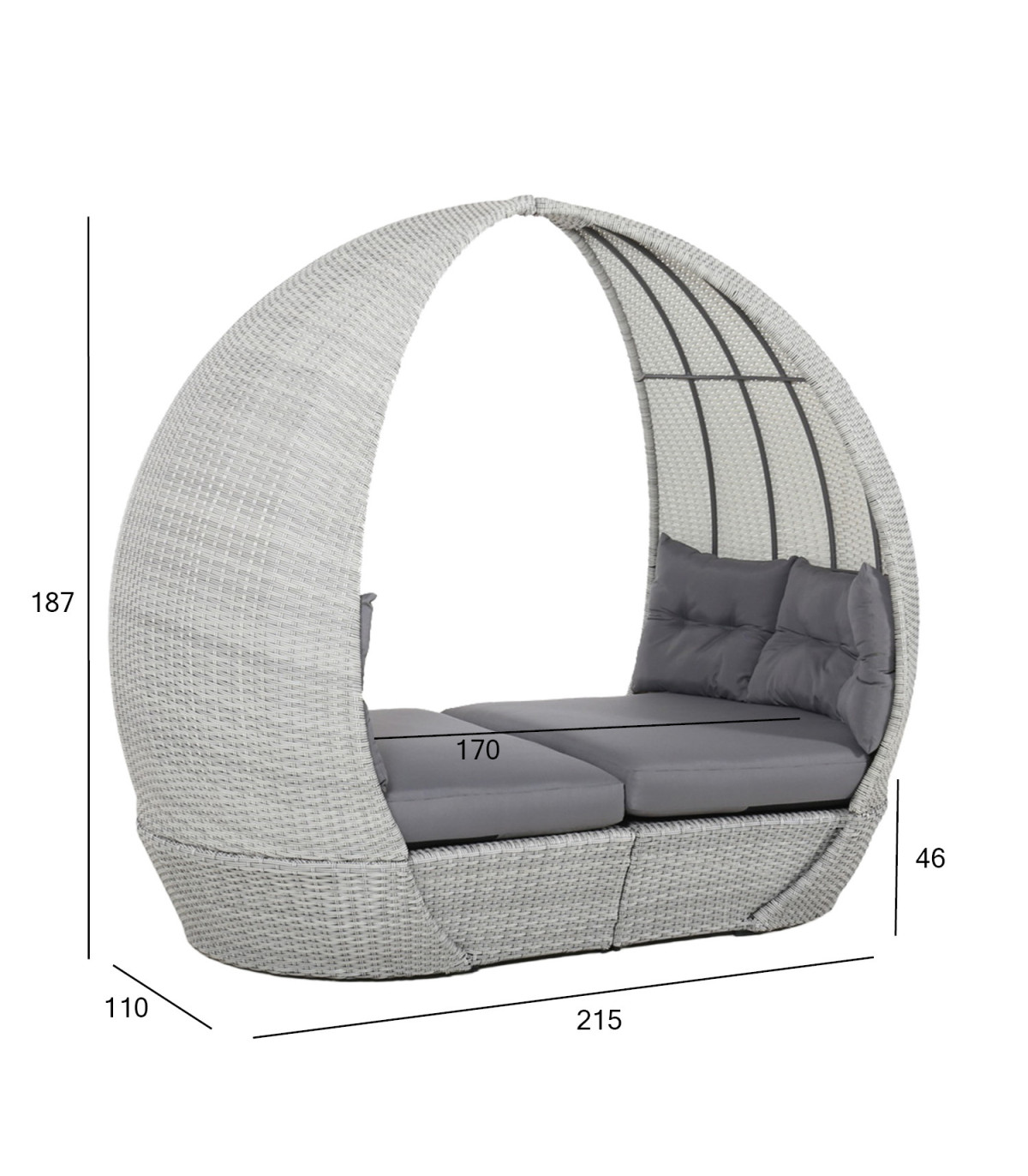 Lebola ASCOT 215x110xH187cm, hall. Lebola alumiiniumraam on kaetud halli plastikpunutisega. Istme mõõdud on 136/200x110cm, istme kõrgus koos padjaga on 46cm. Kaarjas istmepadi koosneb kahest poolest. Istmepadja mõõdud on 68/100x110xH13cm - 2tk. Seljatoepadja mõõdud on 118x50x8cm - 2tk. Padjakatted on valmistatud hallist olefin kangast. Toode on muutlikes ilmastikutingimustes vastupidav ja väga lihtsalt hooldatav, kaitset ilmastikutingimuste eest vajavad ainult padjad. HOIUSTAMINE: suvehooaja lõppedes soovitame aiamööblit hoiustada siseruumides. Puhastage ja kuivatage mööbel enne hoiule panekut. Kasutage hoiustamiseks jahedat, kuiva ning hea ventilatsiooniga ruumi.