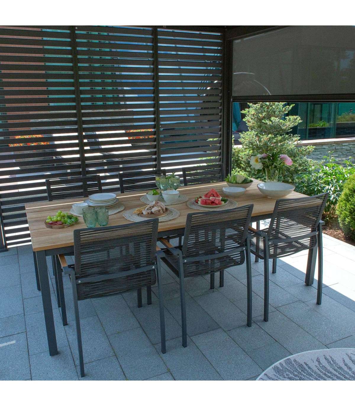 Söögilauakomplekt MONTANA laud ja 8 tooli. Laua mõõdud on 220x100xH76cm. Lauaplaat on valmistatud A-klassi tiikpuust. Peenlihvitud pind on täielikult naturaalne oma looduslikus ilus ning seda ei ole õlitatud ega muul viisil keemiliselt töödeldud. Laua jalad ja alusraam on valmistatud roostevabast terasest ja viimistletud halli pulbervärviga. A-klassi tiikpuu on täiuslik looduslik materjal luksusliku õuemööbli valmistamiseks. Puidu süü on tihe ja ühtlane ning kauni sametise läikega, värvus on kuldse nisu-ja meetoonides. Tänu suurele looduslike õlide sisaldusele on tiikpuu väga vastupidav niiskuse ning puidukahjurite suhtes. Tiikpuu talub väga hästi erinevaid ilmastikutingimusi ja säilitab oma suurepärase välimuse ja parimad omadused pikkadeks aastateks. Päikesevalguse ja niiskuse mõjul muutub laua pind aja jooksul kaunilt hõbehalliks. Selline värvimuutus on loomulik ning ei mõjuta puidu kvaliteeti. Eksklusiivne tiikpuust laud sobib hästi ka siseruumides kasutamiseks. Tooli roostevabast terasest raam on viimistletud halli pulbervärviga. Iste ja seljatugi on kaetud nöörpunutisega. Käetugesid kaunistavad naturaalsest tiikpuust liistud. Toolid on virnastatavad ning nende hoiustamine on lihtne ja ruumi säästev. Tooli üldmõõdud on 60x61xH90cm, istme kõrgus 45cm, istme laius 48cm, istme sügavus 48cm, seljatoe kõrgus 48cm, käetoe kõrgus maast 65cm. Kaalupiirang 120kg. Toode on muutlikes ilmastikutingimustes vastupidav ja lihtsalt hooldatav. Välitingimustes kasutatava mööbli eluea pikendamiseks soovitame kasutada välimööbli katteid. HOIUSTAMINE: suvehooaja lõppedes soovitame aiamööblit hoiustada siseruumides. Puhastage ja kuivatage mööbel enne hoiule panekut. Kasutage hoiustamiseks kuiva ning hea ventilatsiooniga ruumi.