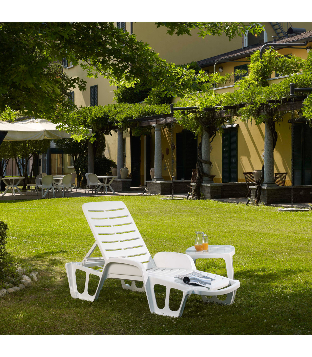 Lamamistool FISSO 71x192xH45cm, valge plastik. Lamamistooli reguleeritava seljatoe saab panna horisontaalsesse asendisse või valida sobiv kaldenurk nelja positsiooni vahel. Toolid on virnastatavad. Kaalupiirang 100kg. Materjal: polüpropüleen (PP). HOOLDUS: plastikmööbel ei vaja erilist hooldust. Puhastage pinnad regulaarselt vee ja lahja pesuvahendi lahusega. Ärge kasutage pleegitavaid või abrasiivseid puhastusvahendeid. HOIUSTAMINE: suvehooaja lõppedes soovitame aiamööblit hoiustada siseruumides. Puhastage ja kuivatage mööbel enne hoiule panekut. Kasutage hoiustamiseks kuiva ning hea ventilatsiooniga ruumi.