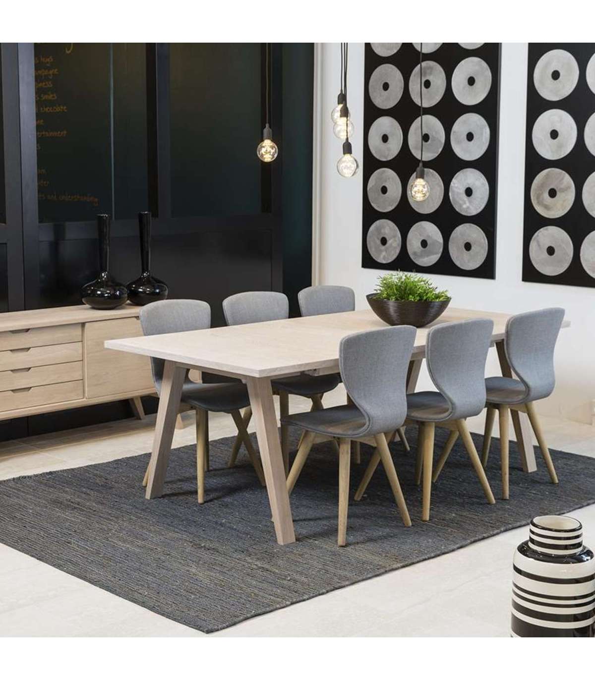 Söögilaud esindab klassikalist Skandinaavia disaini kaasaegses võtmes. Sale profiil annab disainile moodsa ilme. Lauaplaat on valge pigmendiga õlitatud tammespoonist. Seda täiendavad tugevad, nurgelised tammepuidust jalad. Lauda saab pikendada tänu kahele pikendusplaadile. Mõõdud on 210/310x100xH74cm.