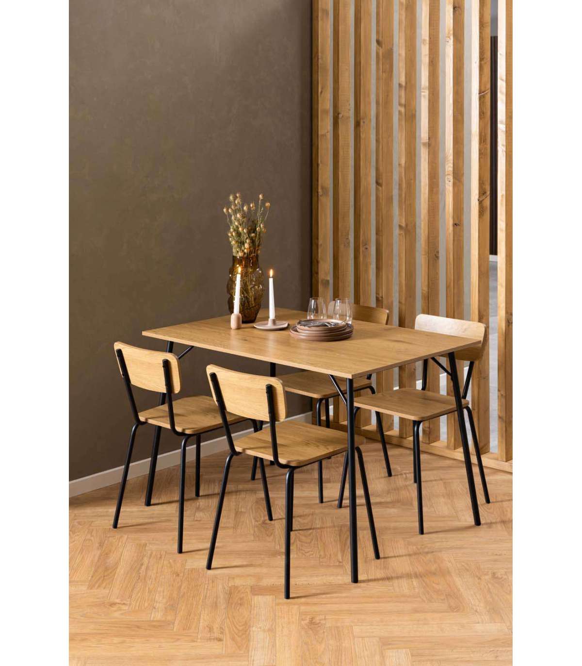 Selged jooned ja materjalide valik muudab laua sobivaks nii kaasaegsetesse kui ka traditsioonilistesse ruumidesse. Tammepuidu välimusega kandiline söögilaud asetseb peenetel mustadel metalljalgadel. Moodne kombinatsioon mõjub samas ka veidi rustikaalselt. Mõõdud on 120x80xH75cm. HOOLDUS: Üldiselt vajavad kõik melamiinpinnad minimaalset hooldust. Kasutage seebiveest kuivaks väänatud lappi ja pühkige pind kuivaks. Vältige küürimispulbri või nailonkäsnade kasutamist, kuna need pleegivad või kriimustavad laminaati. Alus: Kasutage igapäevaseks puhastamiseks seebiveest kuivaks väänatud lappi. Rooste vältimiseks pühkige pind kuivaks. Ärge hõõruge pinda kõvade esemetega.
