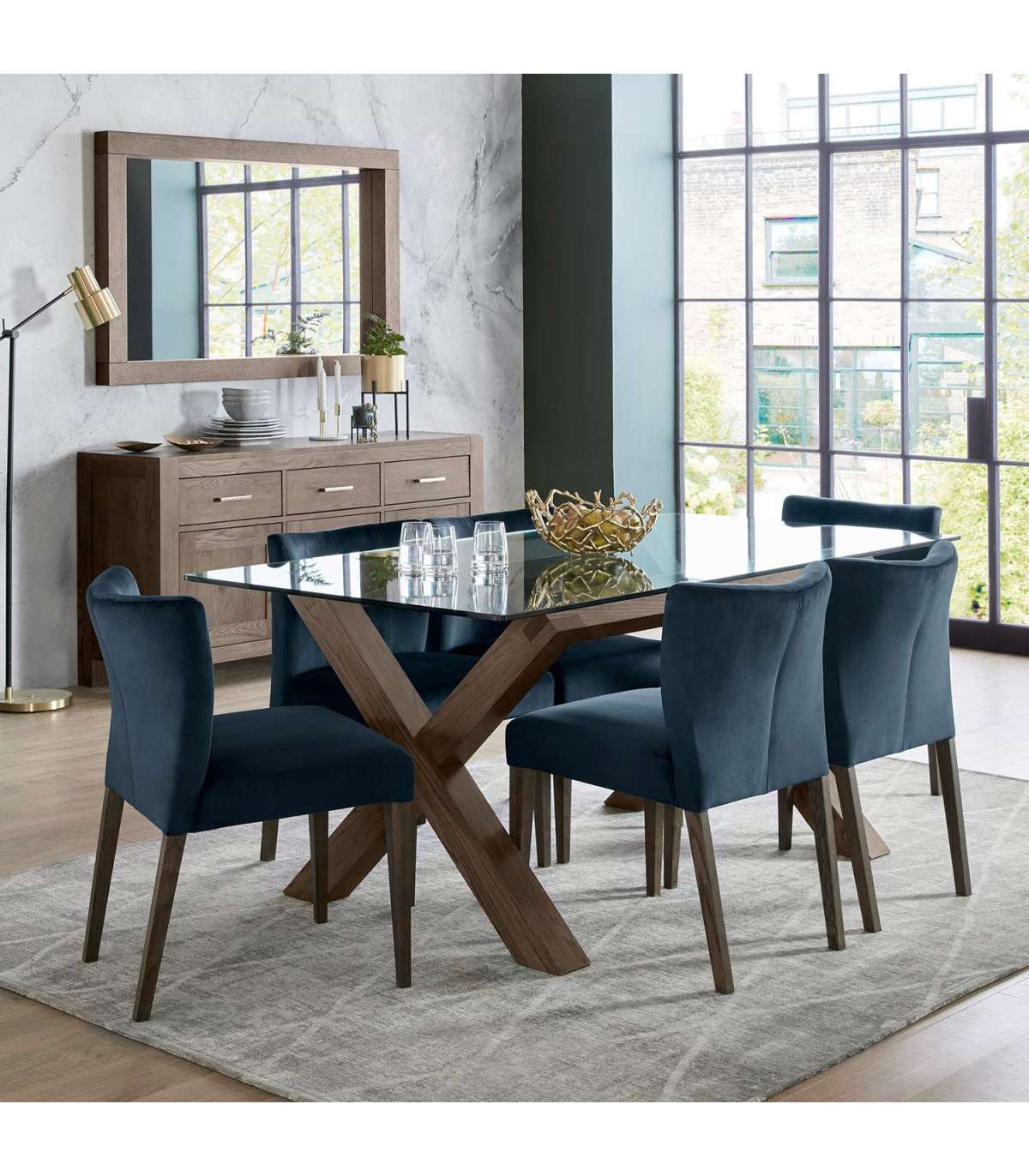 Söögilaud TURIN 180x90xH75cm. Lauaplaat: läbipaistev karastatud klaas. Jalad on valmistatud täistammepuidust ja viimistletud suitsutamme toonis puiduõliga.