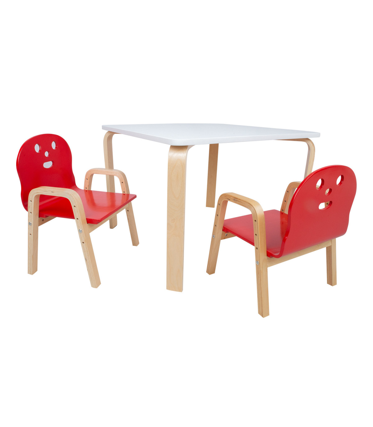 Lastekomplekt HAPPY laud ja 2 tooli, valge/punane. Laua mõõdud on 75x75xH50cm. Materjal: paplivineer kasespooniga. Lauaplaat on värvitud valgeks. Painutatud vineerist jalad on viimistletud naturaalse lakiga. Tool HAPPY kasvab koos teie lapsega! Istme kõrgust on võimalik tõsta neli korda vastavalt lapse kasvule - 21/25,5/30/34,5cm. Tooli üldmõõdud on 39x36xH46,5/51/55,5/60cm. Istme laius 33cm, istme sügavus 31cm, seljatoe kõrgus 27cm, käetoe kõrgus maast 36cm. Materjal: painutatud paplivineer kasespooniga. Iste on värvitud punaseks, jalad ja raam on viimistletud naturaalse lakiga. Kaalupiirang 40kg.
