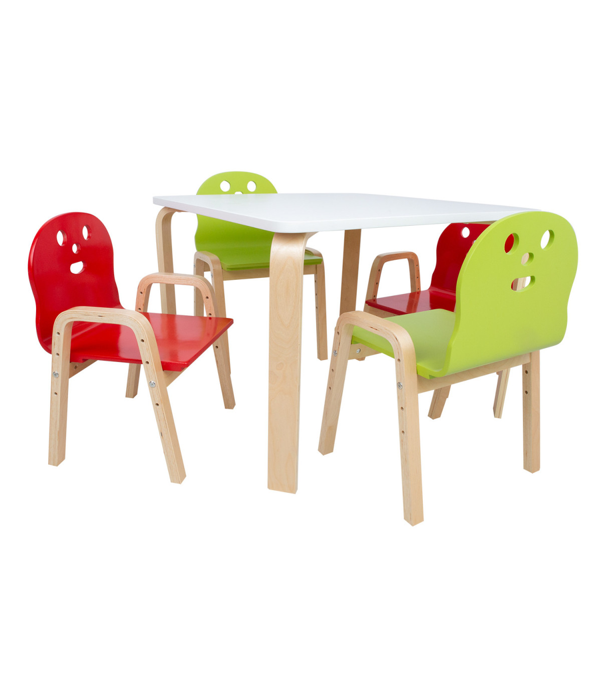 Lastekomplekt HAPPY laud ja 2 tooli, valge/punane/roheline. Laua mõõdud on 75x75xH50cm. Materjal: paplivineer kasespooniga. Lauaplaat on värvitud valgeks. Painutatud vineerist jalad on viimistletud naturaalse lakiga. Tool HAPPY kasvab koos teie lapsega! Istme kõrgust on võimalik tõsta neli korda vastavalt lapse kasvule - 21/25,5/30/34,5cm. Tooli üldmõõdud on 39x36xH46,5/51/55,5/60cm. Istme laius 33cm, istme sügavus 31cm, seljatoe kõrgus 27cm, käetoe kõrgus maast 36cm. Materjal: painutatud paplivineer kasespooniga. Istmed on värvitud punaseks ja roheliseks, jalad ja raam on viimistletud naturaalse lakiga. Kaalupiirang 40kg.