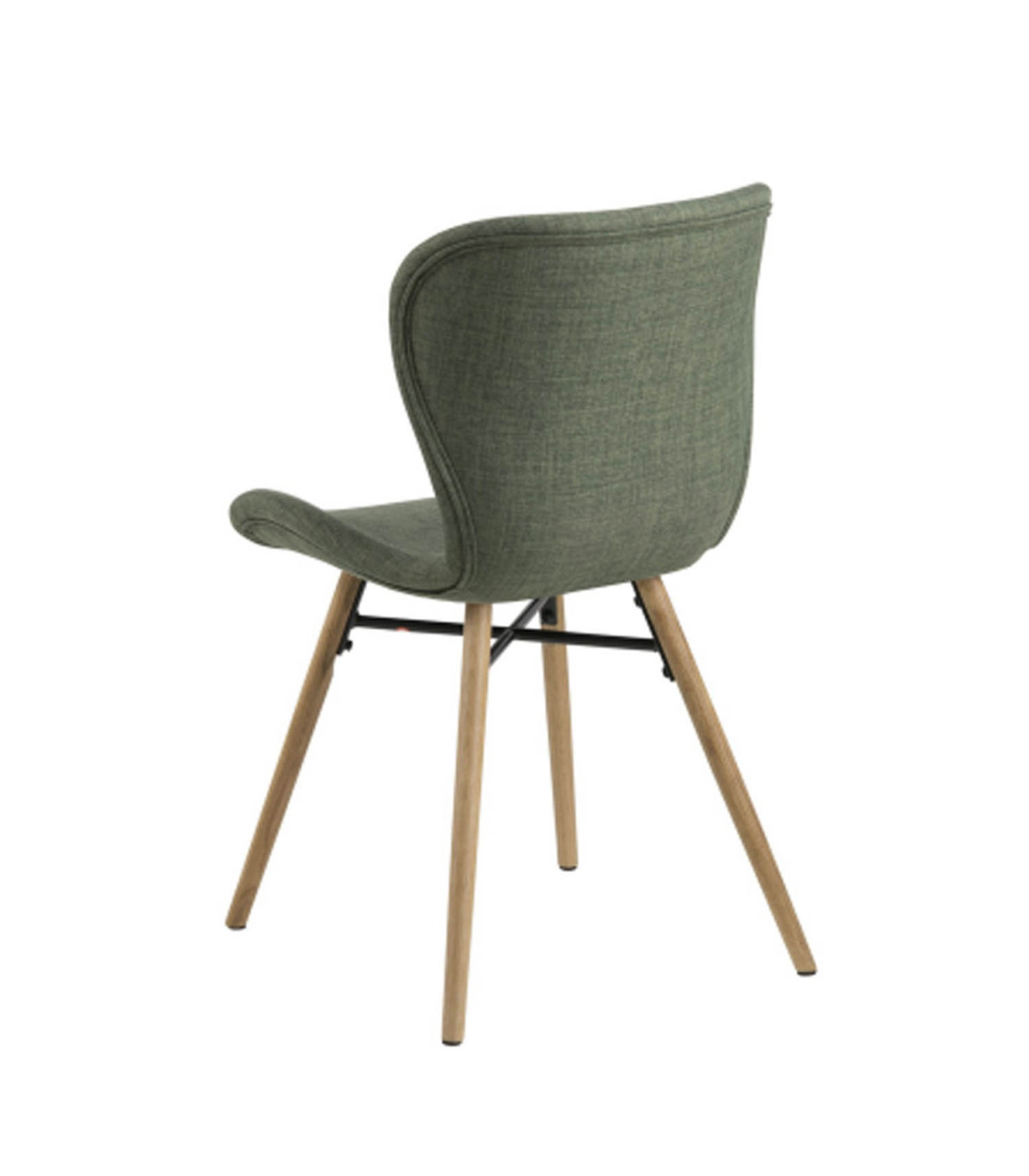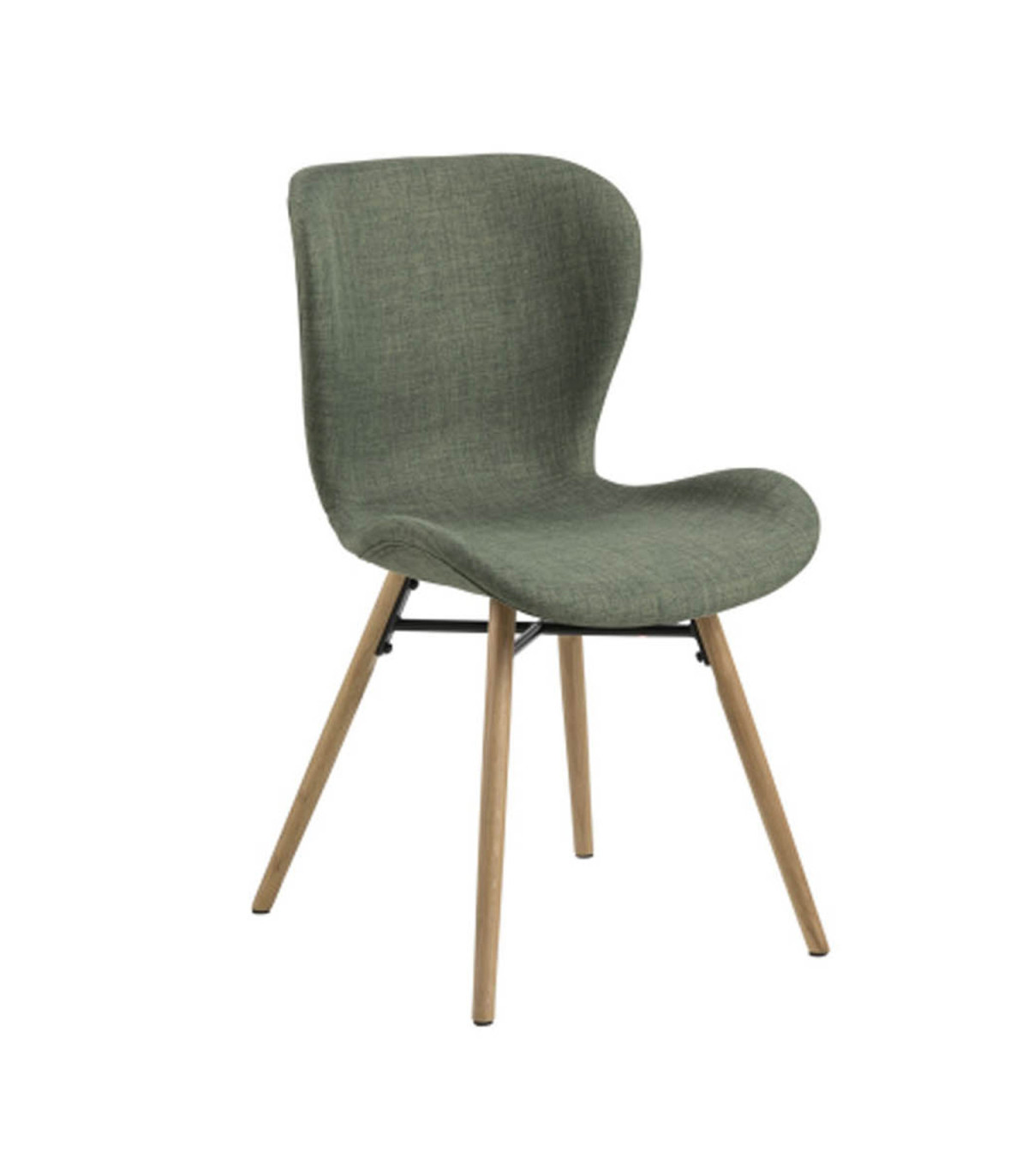 Tool BATILDA 47x56xH82,5cm. Toolil on orgaanilise kujuga iste koos mugava seljatoega. Tool on kaetud pehme kangaga, mis sobib ideaalselt õlitatud tammejalgadega. Elemendid koos annavad toolile elegantse välimuse. Iste ja seljatugi: kangas, värvus: roheline, jalad: tamm, viimistlus: õlitatud. Must metallist tugirist. Kaalupiirang: 110kg.
