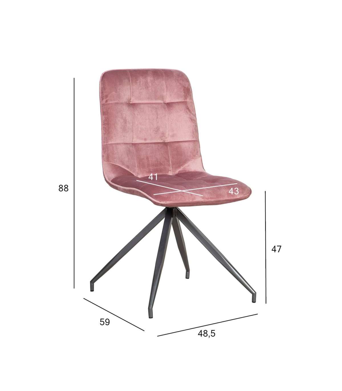 Tool RIMINI roosa. Mugava vormiga plastikust iste on kergelt polsterdatud ja üleni roosa sametkangaga kaetud. Toolil on 4-haruline metalljalg. Kaalupiirang 100kg. Tooli mõõdud on 48,5x59xH88cm.