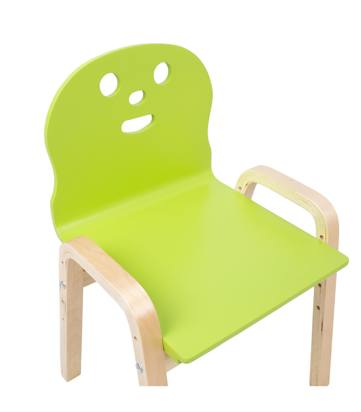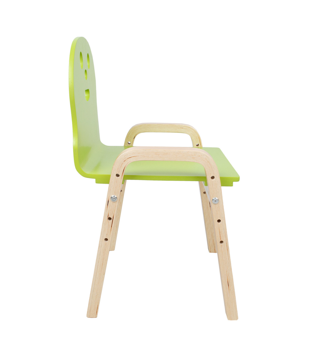 Lastetool HAPPY, roheline. Tool HAPPY kasvab koos teie lapsega! Istme kõrgust on võimalik tõsta neli korda vastavalt lapse kasvule - 21/25,5/30/34,5cm. Tooli üldmõõdud on 39x36xH46,5/51/55,5/60cm. Istme laius 33cm, istme sügavus 31cm, seljatoe kõrgus 27cm, käetoe kõrgus maast 36cm. Materjal: painutatud paplivineer kasespooniga. Iste on värvitud roheliseks, jalad ja raam on viimistletud naturaalse lakiga. Kaalupiirang 40kg.