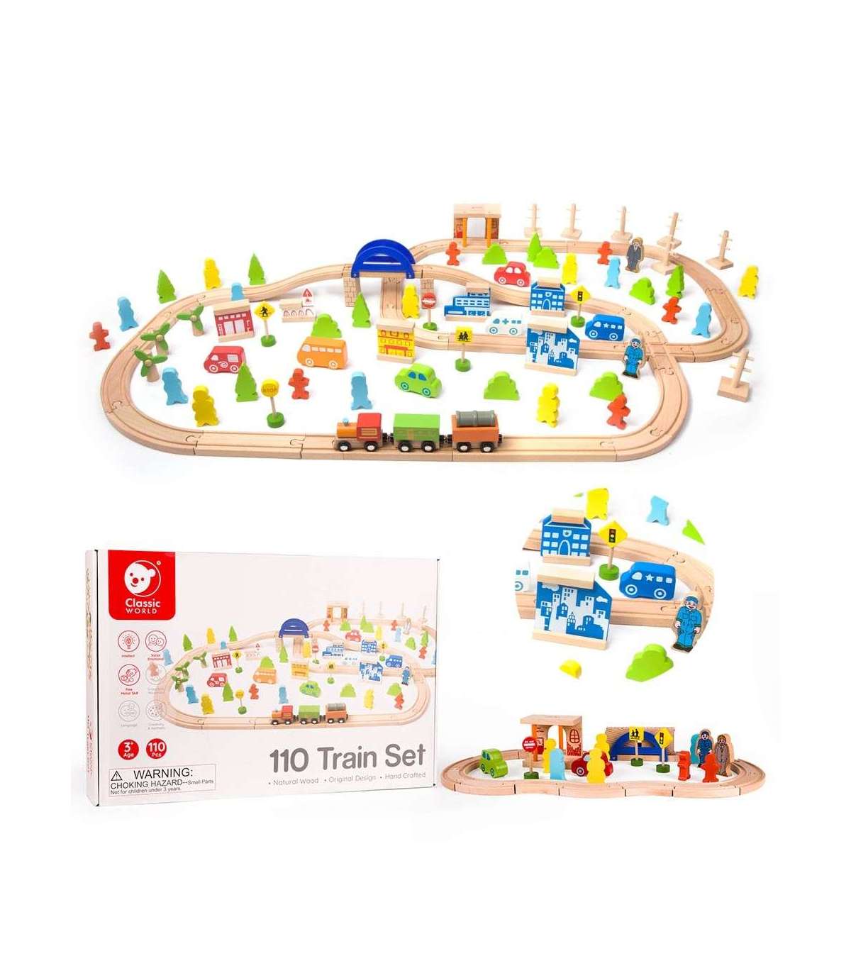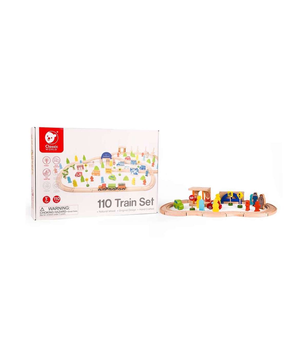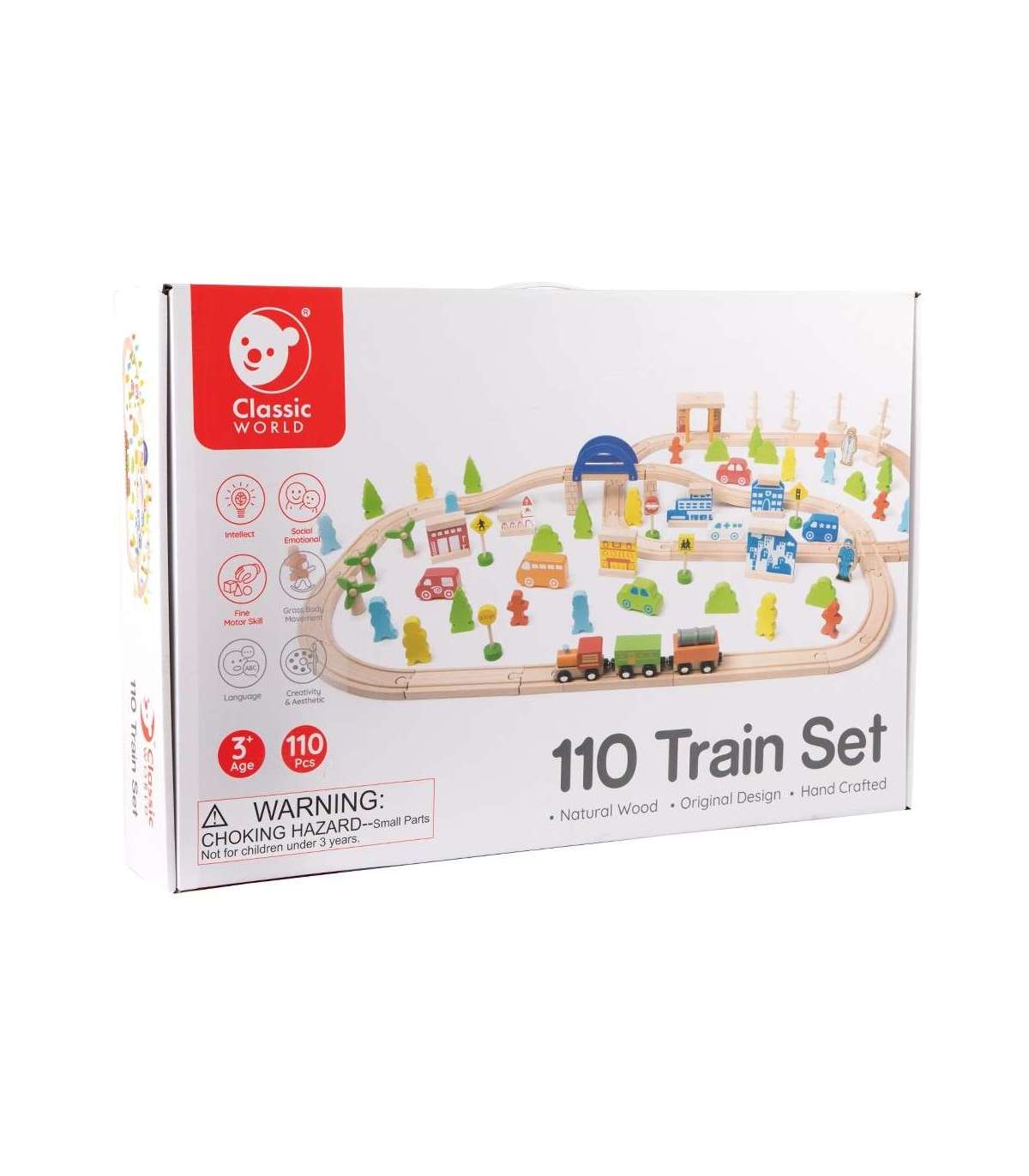 CLASSIC WORLD puidust rongikomplekt koos rööbastee, rongi ja figuuridega, 110 osa.