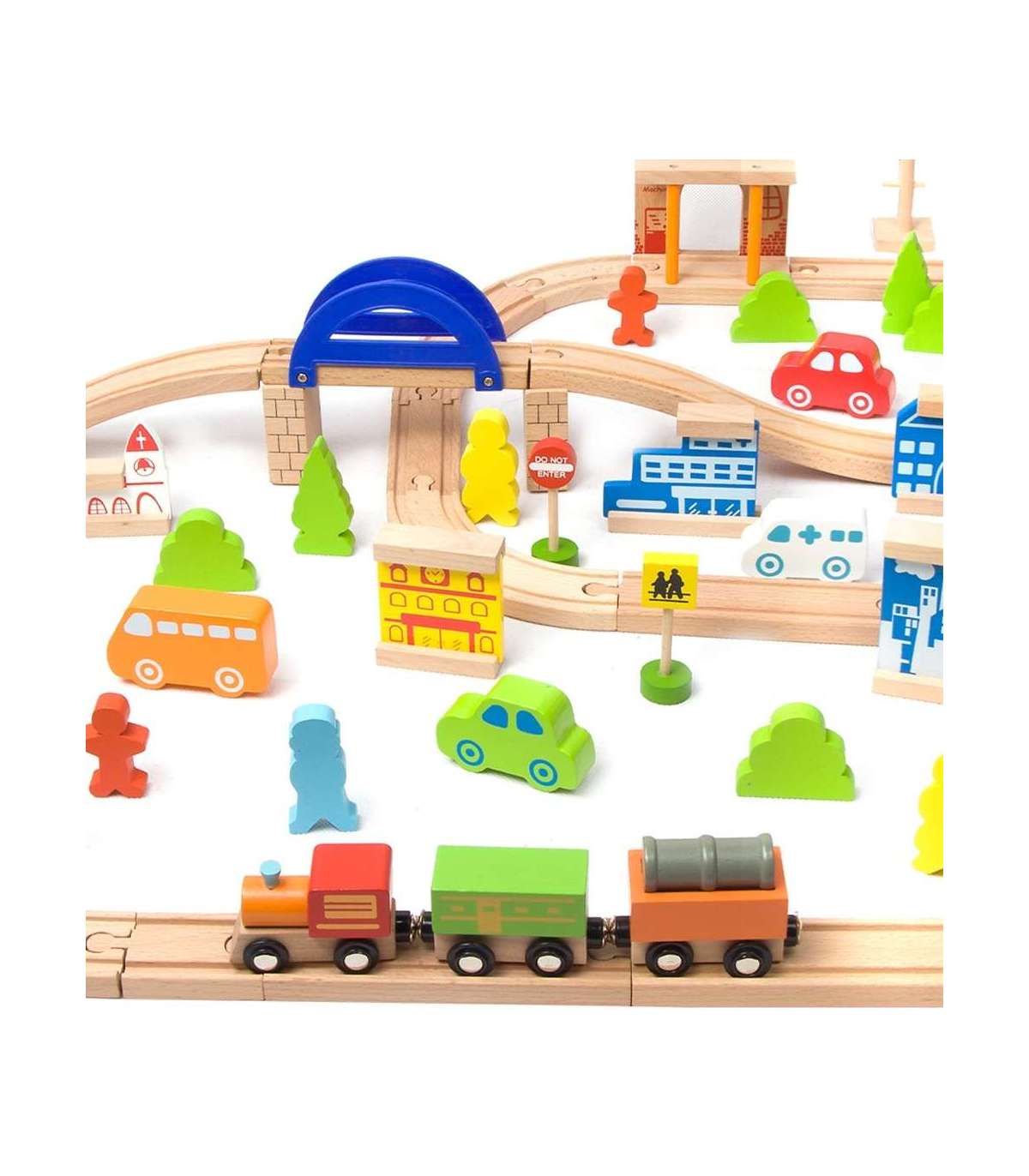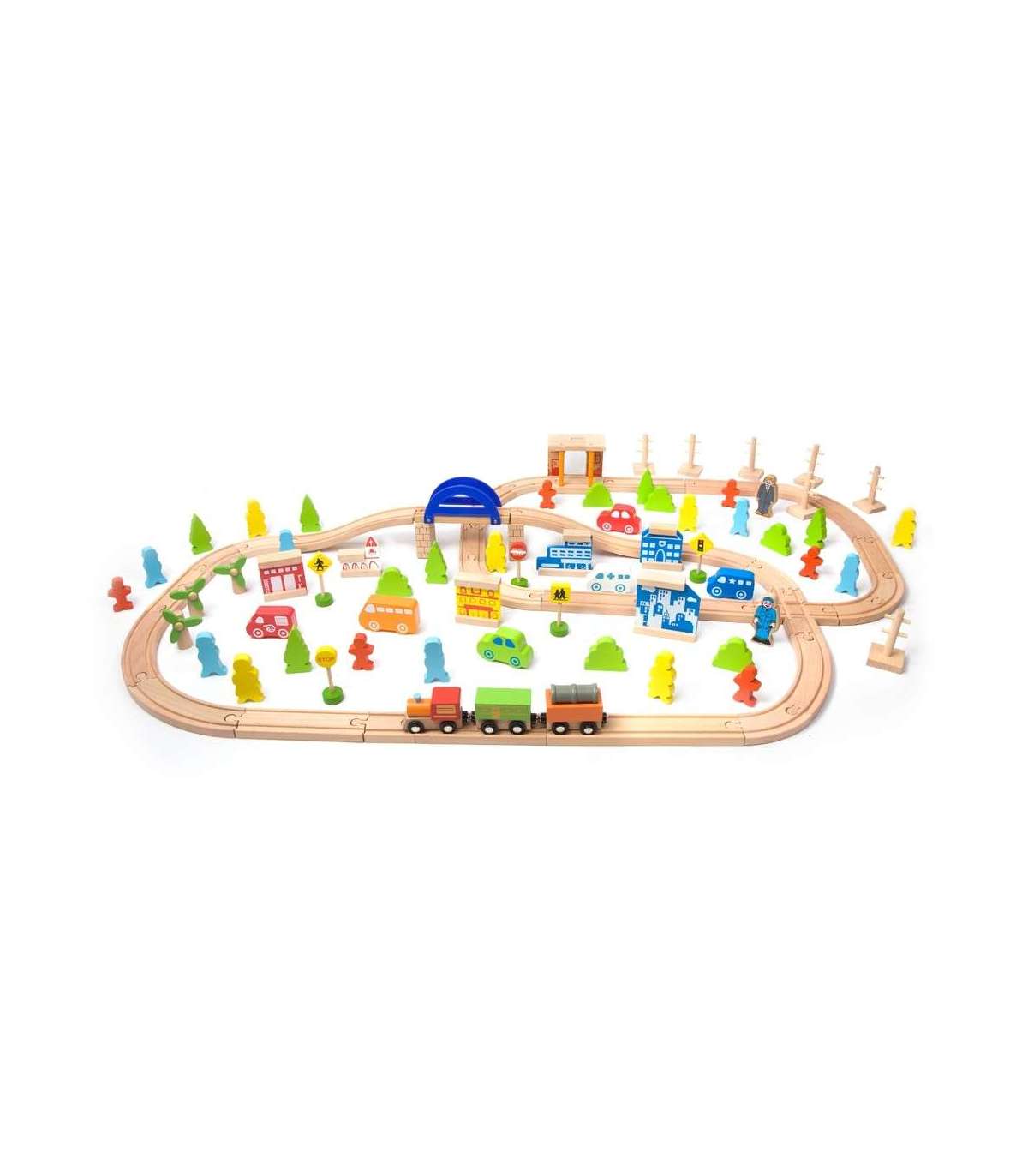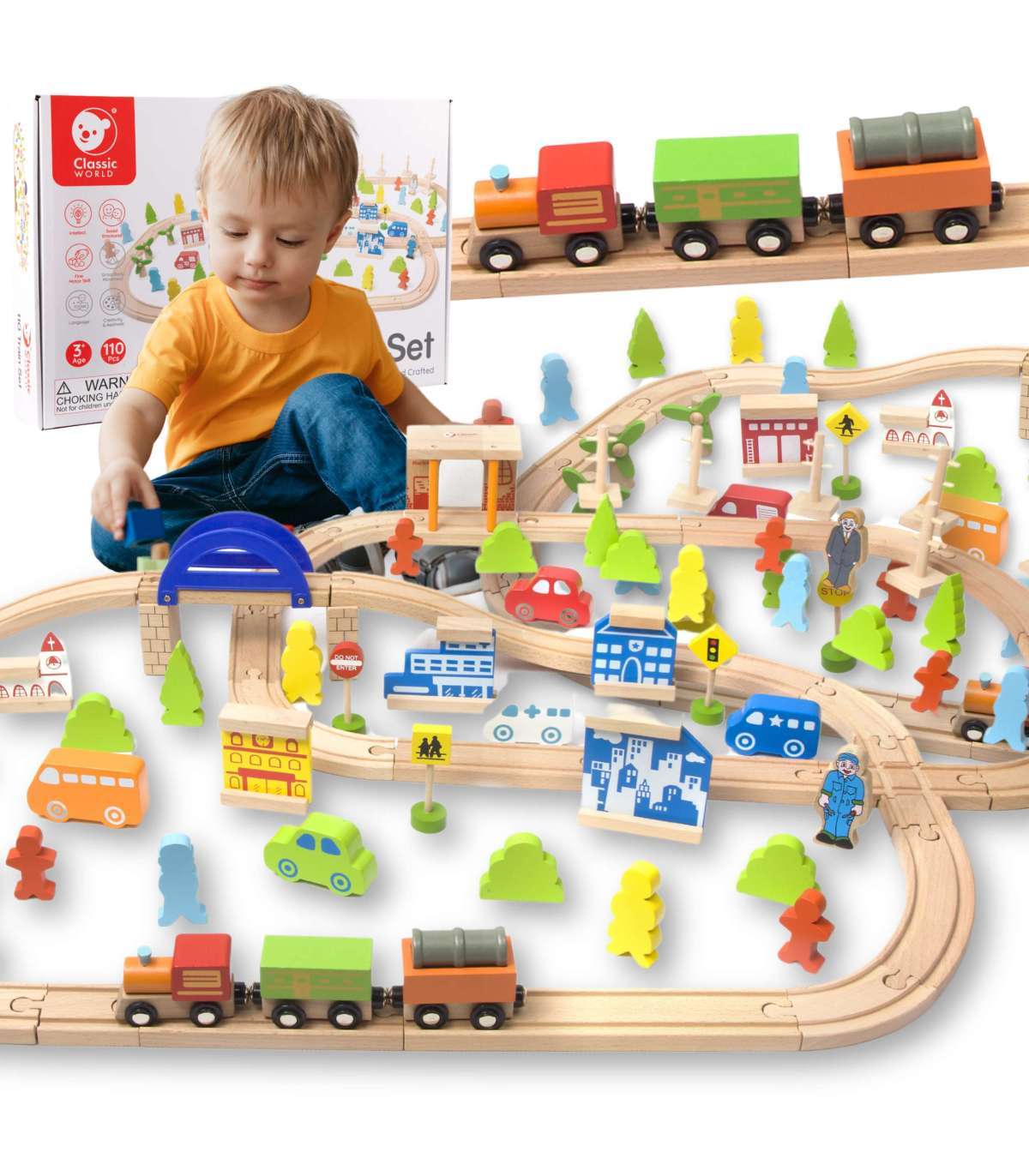 Suurepärane komplekt firmalt Classic World. Puidust rongikomplekt, mille saab kokku panna 110 osaga, on suurepärane kingitus iga lapse jaoks, kes armastab mängida sõidukitega ja makettidega.