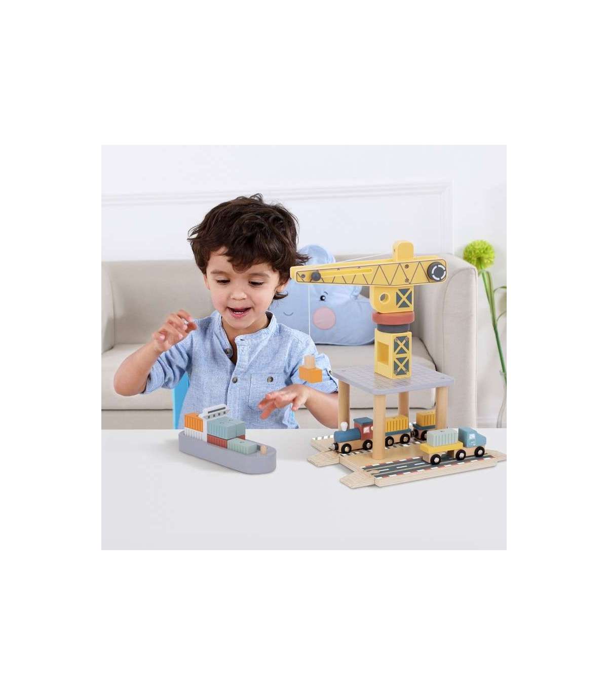 Avasta põnev transporti ja logistikat täis maailm puidust sadamakomplektiga firmalt Tooky Toy! See hoolikalt valmistatud mänguasi viib lapsed otse sadama saginasse, kus nad saavad laadida ja lossida kontejnereid suure pöörleva kraana abil ning transportida kaupu rongi, veoautode ja laevaga. Komplekt paistab silma värvikuse, vastupidavuse ja detailide hoolikuse poolest, pakkudes tunde loomingulist mängu, mis ei muutu kunagi igavaks.