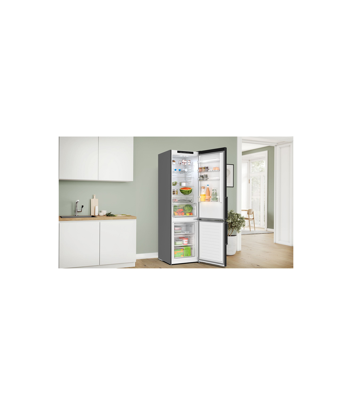 Erinevalt paljudest külmikutest saab Bosch KGN39VXCT mudelit paigutada otse vastu seina – uksed ja sahtlid avanevad vabalt. Ideaalne väiksemasse kööki või sisseehitatud välimusega lahendusse.