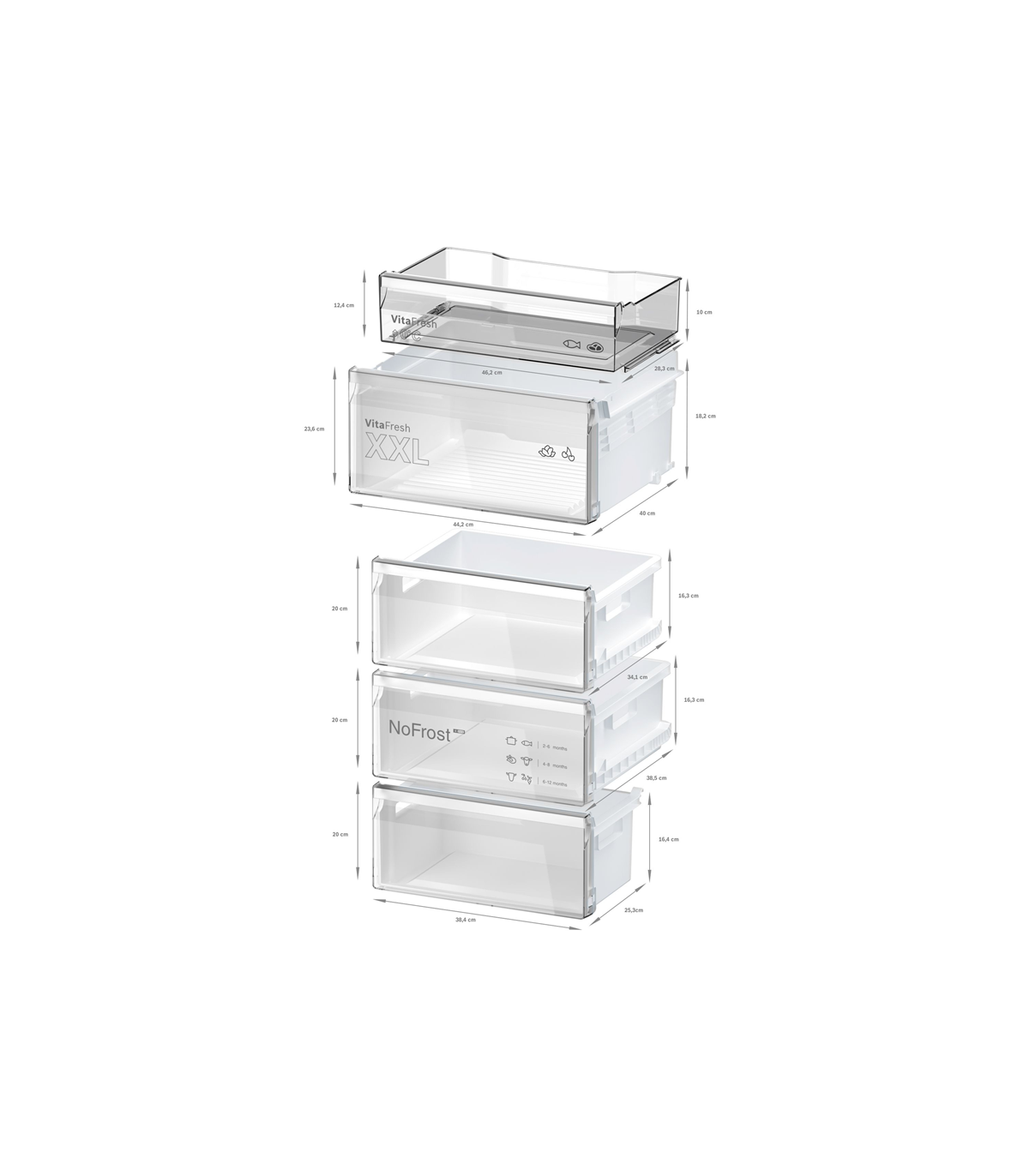 Boschi VitaFresh XXL <0°C> sahtlid loovad värskete toitude jaoks ideaalse keskkonna. Liha ja kala saab hoida madalamal temperatuuril, puuviljad ja köögiviljad püsivad mahlased ja krõmpsud kauem.