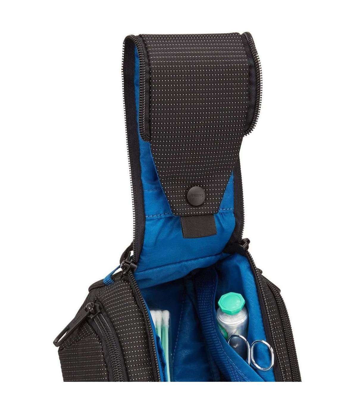 - Easily access main compartment with wide mouth opening; Organize small items in internal mesh slip pockets; Contain spills in two water-resistant pockets; Easily grab and go with convenient handle