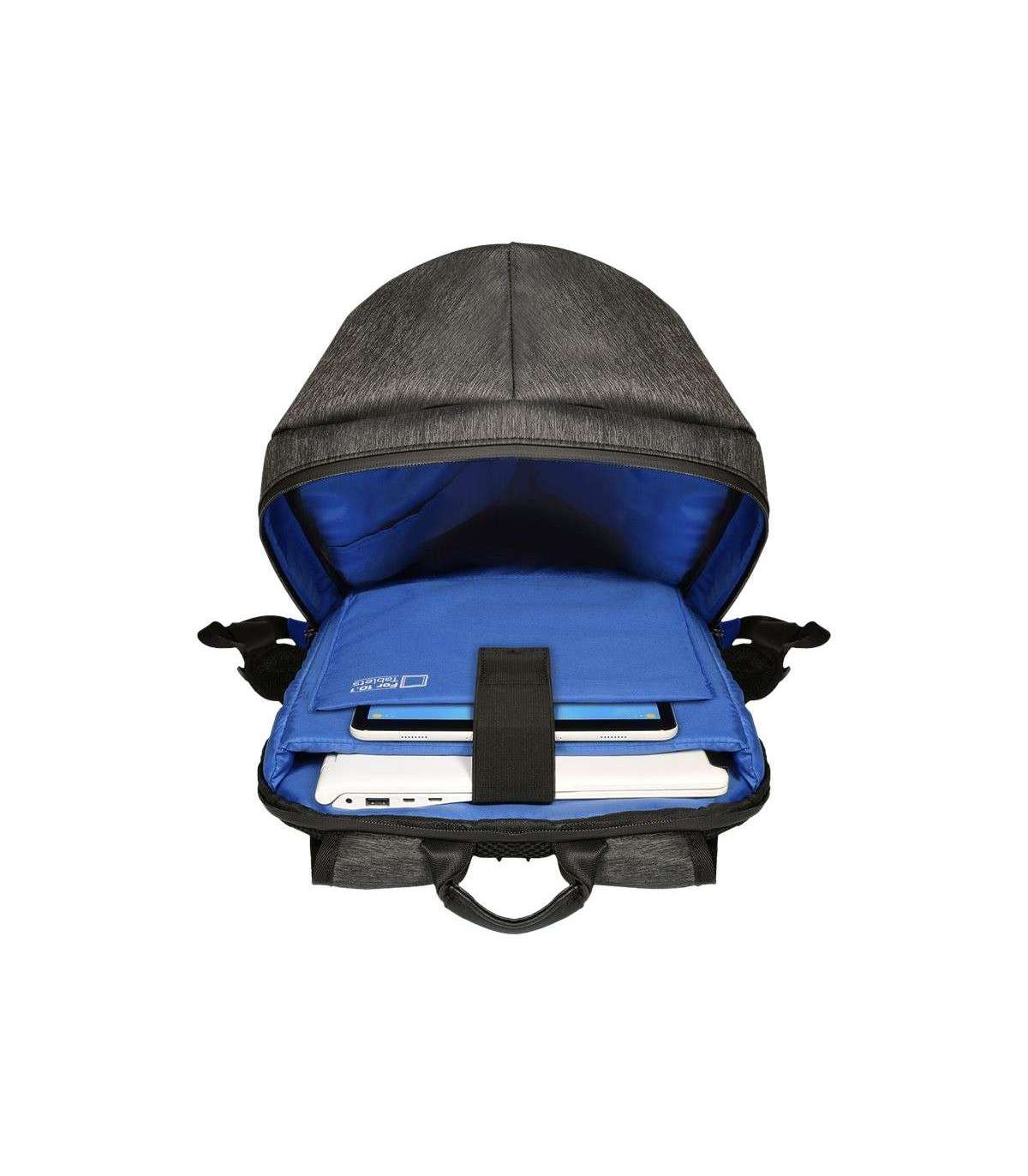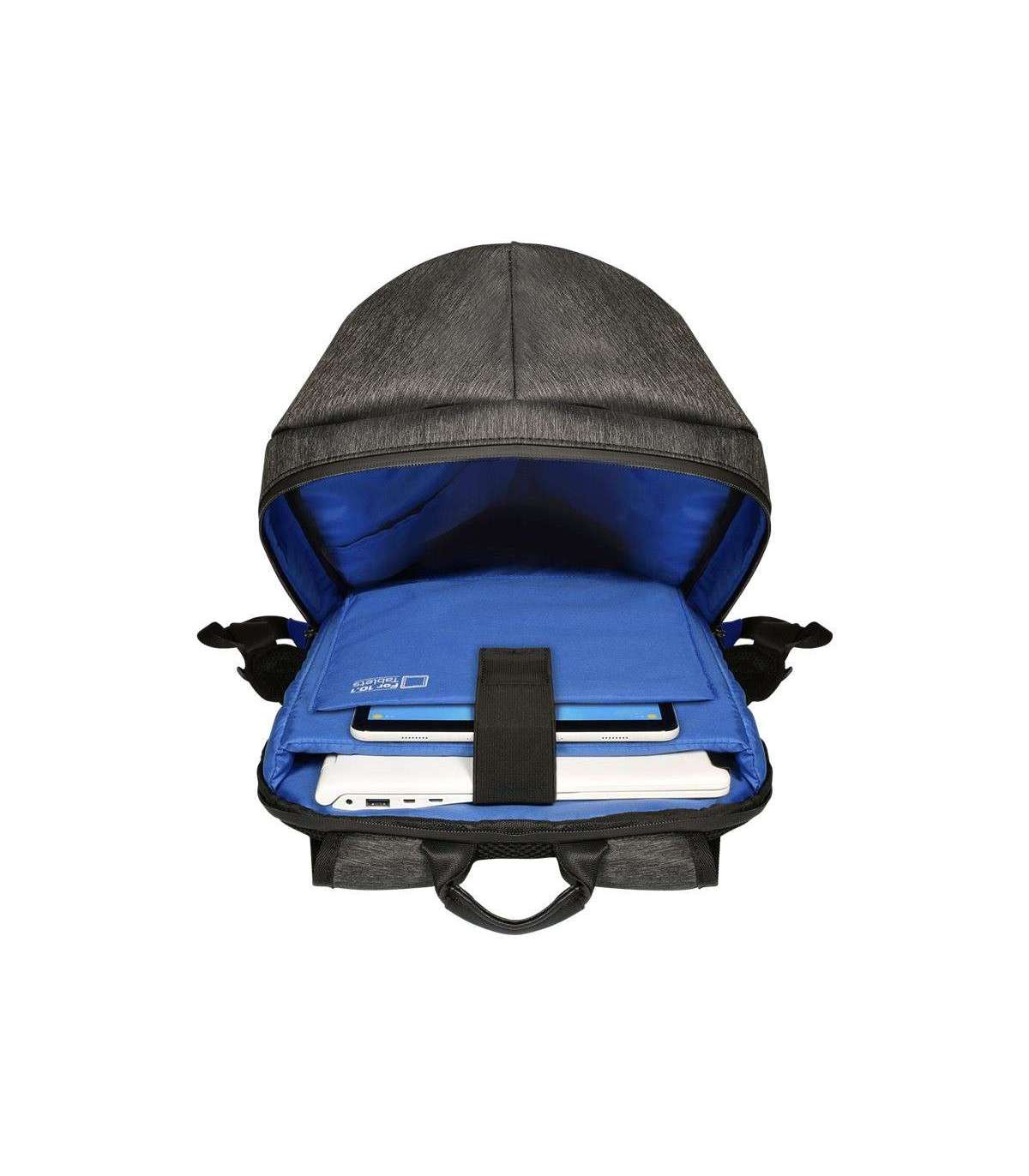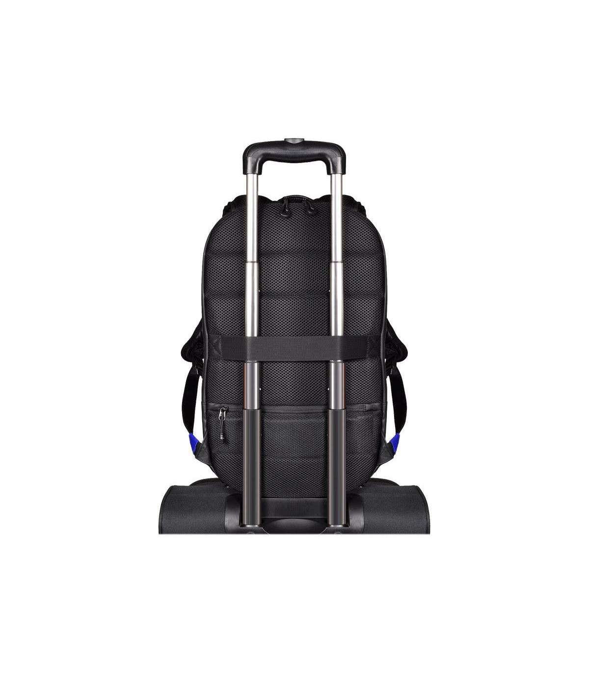 - Integrated USB port to charge your devices anywhere; Dedicated padded laptop 15.6'' & tablet up to 10'' compartments; Made with water-repellent polyester; Waterproof zippers; Adjustable lap belt; Trolley strap for rolling luggage handle