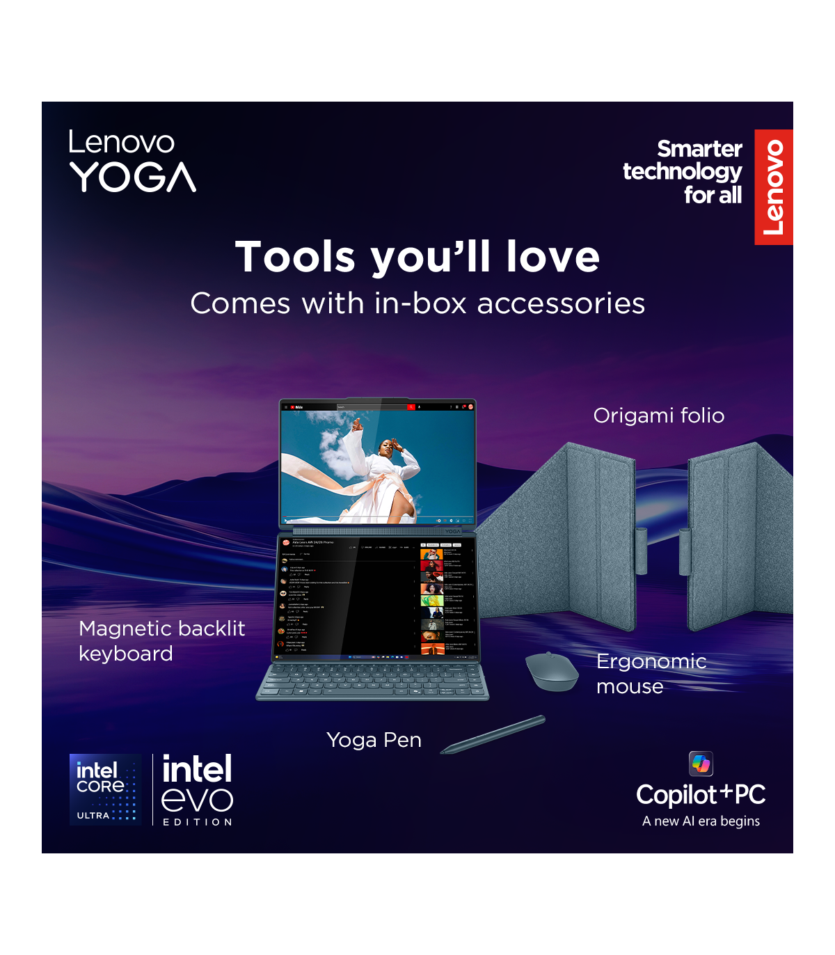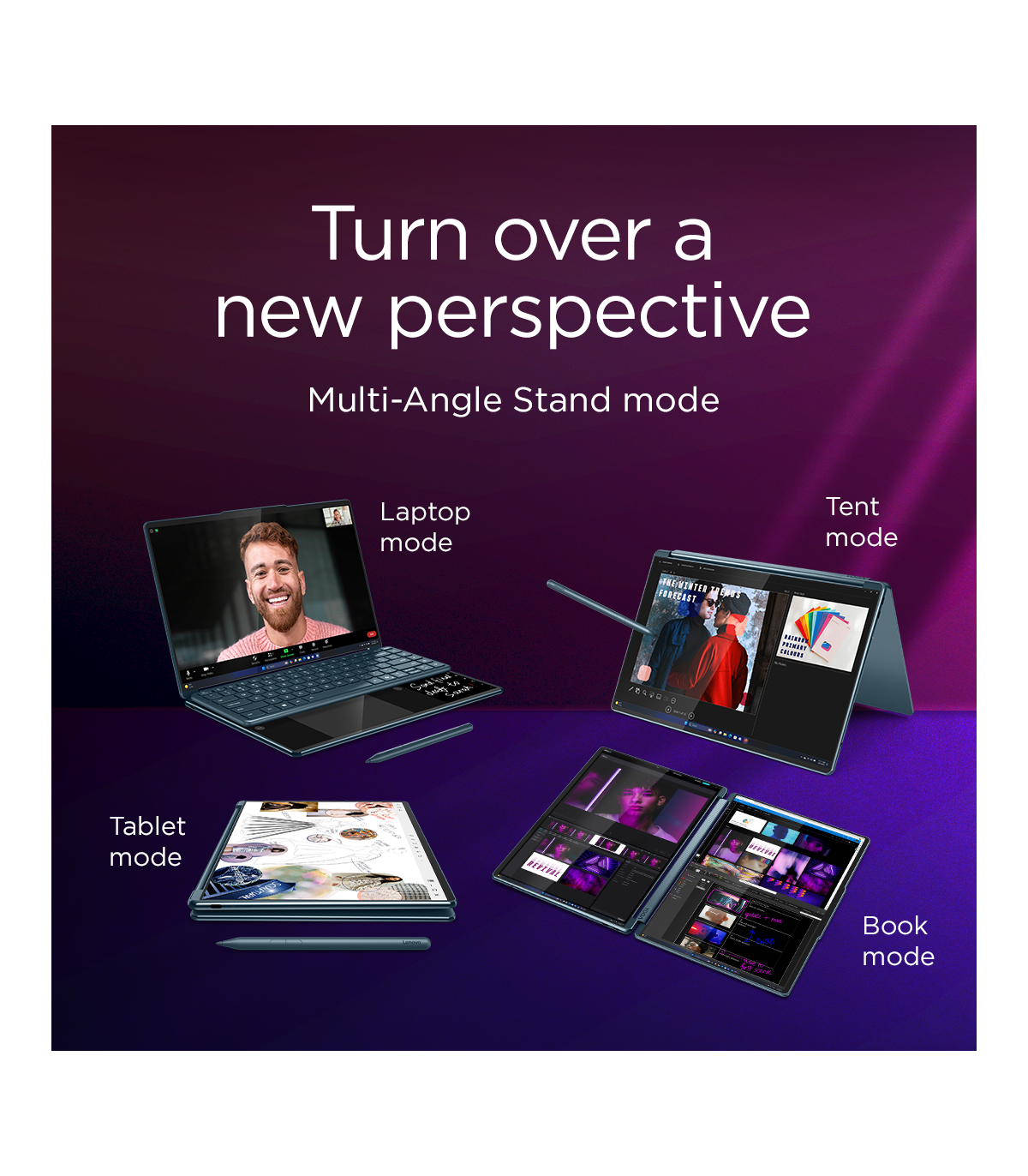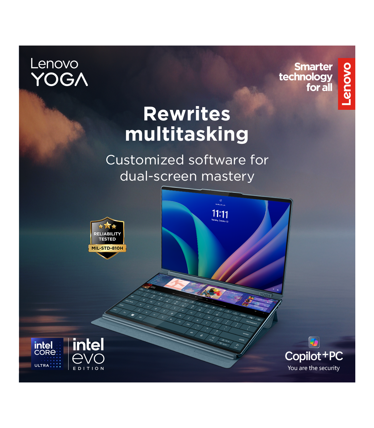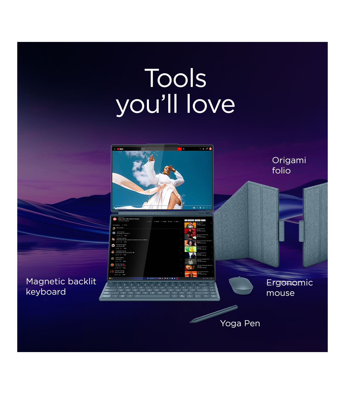 Lenovo Yoga Book 9 14IAH10 | Tidal Teal | 2x14 " | OLED | Touchscreen | 2.8K WQXGA+ | 2880 x 1800 pixels | Intel Core Ultra 7 | 255H | 32 GB | Soldered LPDDR5x | Solid-state drive capacity 1000 GB | Intel Arc 140T GPU | Windows 11 Pro | 802.11be | Bluetooth version 5.4 | Keyboard language English | Keyboard backlit | Warranty 24 month(s) | Battery warranty 12 month(s)