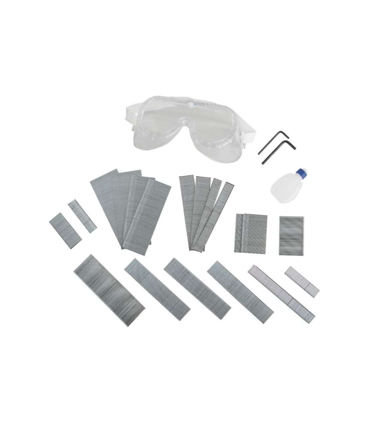 Komplekt sisaldab: 1000 x naela, naeluti, 1000 klambrit, kuuskant võti, kaitseprillid ja tööriistaõli