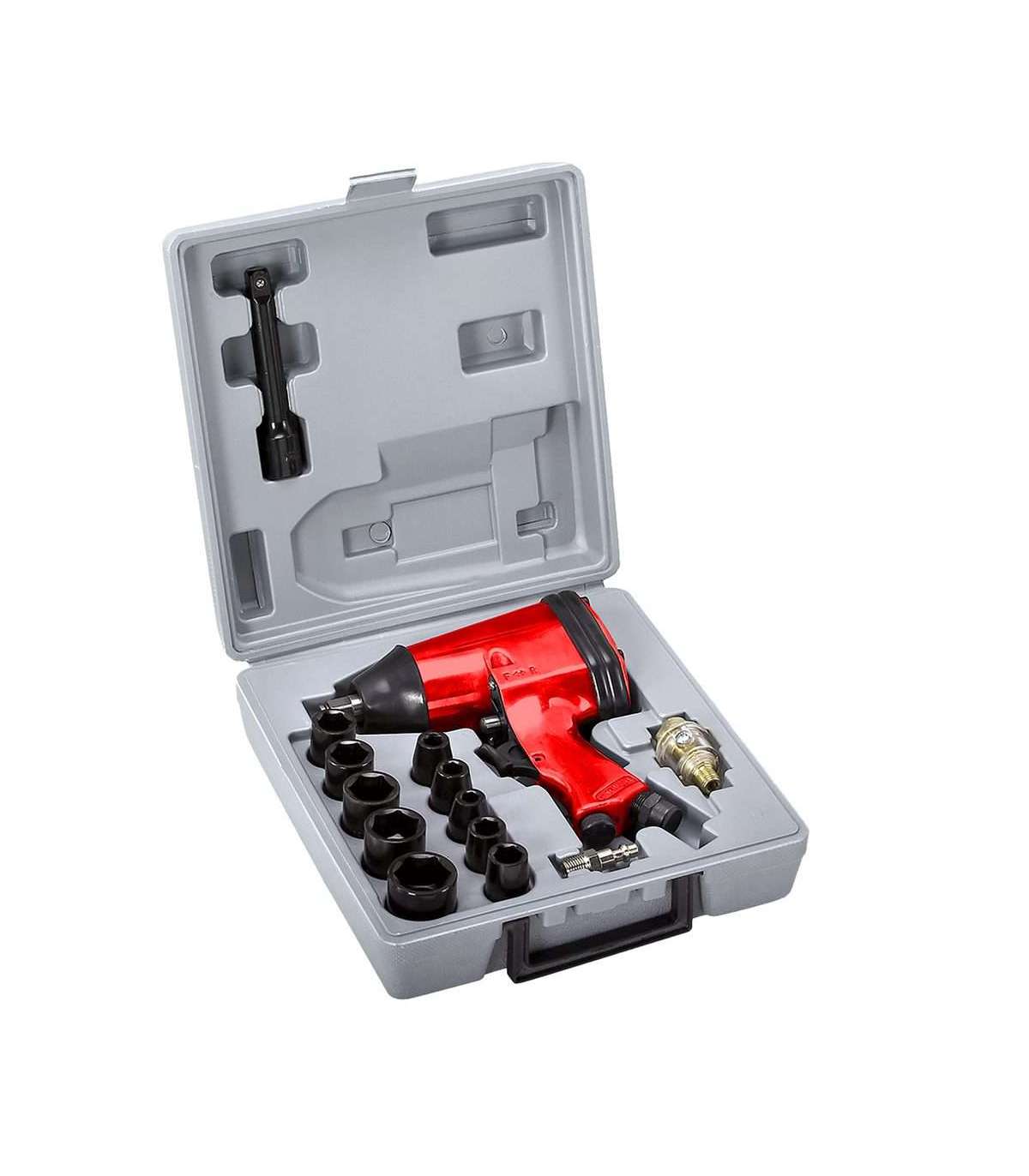 Pneumaatiline löökmutrivõtmete komplekt. 310 Nm. 10 tk kinnitusi (9, 10, 11, 13, 14, 17, 19, 22, 24, 27 mm). Kuuskantvõti ja muud tarvikud.