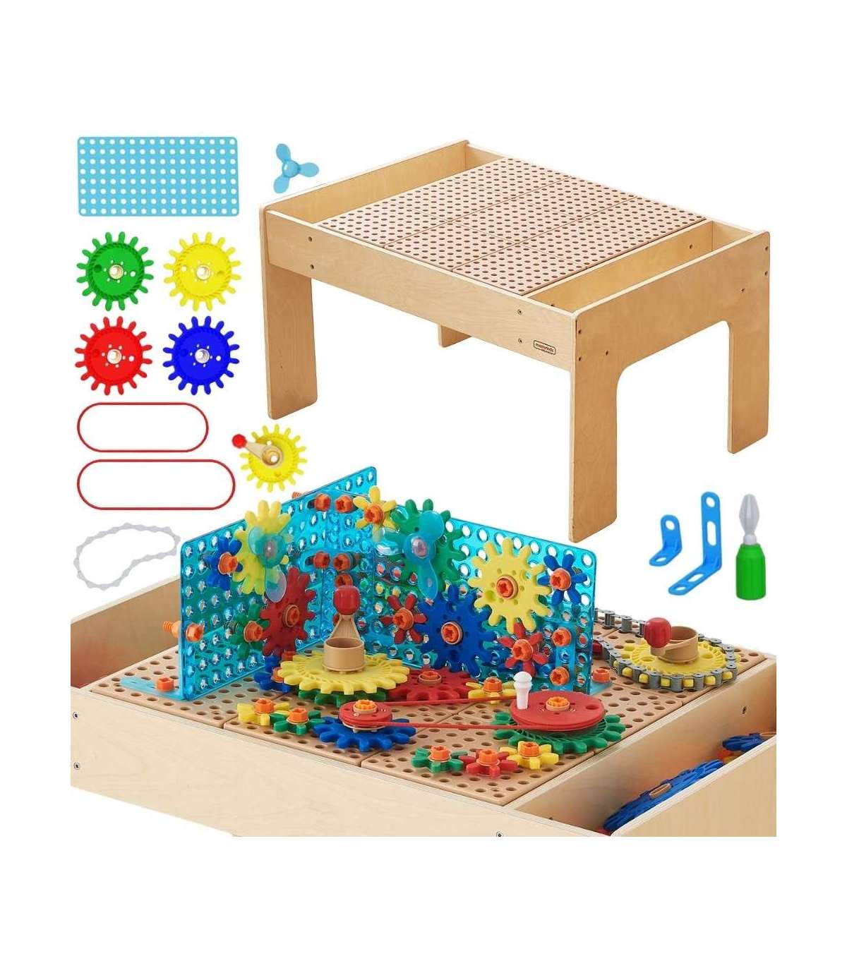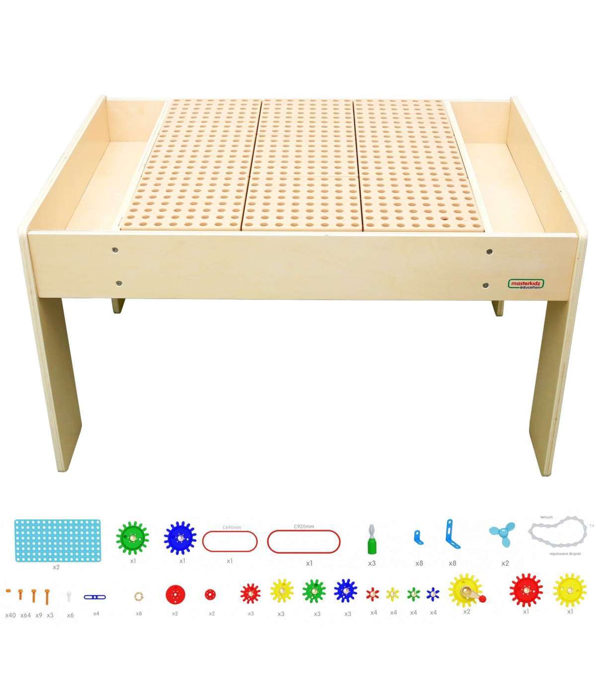 Drewniany stół STEM marki Masterkidz to idealny dodatek do każdej klasy przedszkolnej lub podstawowej, stół STEM jest wyposażony w panele STEM kompatybilne z szerokim asortymentem akcesoriów STEM. Dzięki niskiej poziomej powierzchni dzieci mogą pracować siedząc lub stojąc, samodzielnie lub w grupach. Stoły są solidne i wystarczająco duże, aby dzieci mogły tworzyć rozbudowane projekty lub rozwiązania. Wbudowane tacki po obu stronach stołu umożliwiają łatwe przechowywanie elementów. Zestaw zawiera szeroki wybór elementów, które zachęcają dzieci do budowania i tworzenia własnych urządzeń mechanicznych oraz ścianki umożliwiające rozszerzanie mechanizmów w 3 wymiarach.