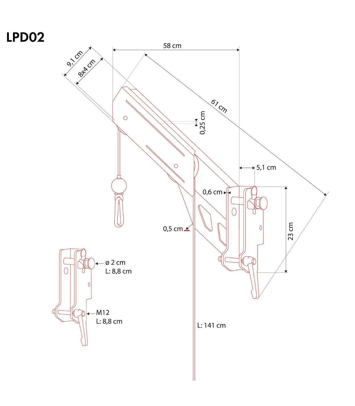 LPD02 TOP LIFT FOR MACHINES AND ATLASES HMSThe LPD02 overhead lift, has been designed to increase the versatility of training on atlases and machines. It gives the user the ability to use the lift at a different height and angle, giving more options to work on different muscle areas and making it easier to customise exercises.Designed for better resultsThe LPD02 lift allows you to perform exercises at a new angle and height, enabling you to engage different muscle groups in a more targeted way. This functionality promotes better training efficiency and allows an extra dimension to be added to standard exercises. This allows the user to fine-tune their training for even better results.Complement to the atlasThe LPD02 is the ideal accessory for those who want to get the most out of their training equipment. It will work well in both home and professional gyms, allowing you to expand the training options available and effectively develop strength and capacity. It's a robust and versatile solution that brings a new quality to everyday strength training.Note: For the avoidance of doubt, please refer to our technical drawing.Specification:Overall length: 61 cmWidth: 9.1 cmPin diameter: 2 cmPin length: 8.8 cmAdapted for 50 x 50 mm frameDevice compatible with Cyklop 1, Cyklop 2 and Cyklop 4 atlasesCord length: 141 cm Maximum load: 120 kgWeight: 5.9 kgRemarks:1-year warrantyImporter: Abisal Ltd. | Poland | 41-807 Zabrze | Pyskowicka Street 17 | e-mail: abisal@abisal.plAbisal Ltd.. declares that the products sold by the company are safe and meet the requirements contained in the Act on General Product Safety of December 12, 2003. (Journal of Laws of December 31, 2003)