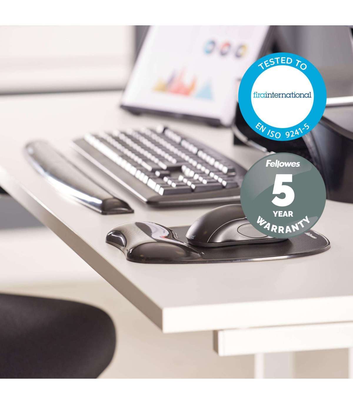 This self adjusting gel wrist rest allows personalised comfort as the keyboard support has the ability to conform to your wrist, which helps relieve pressure and fatigue whilst typing. With the easy clean surface, the innovative design allows you to wipe the keyboard wrist rest clean with a damp cloth, making it perfect for all environments. Typing on a keyboard or using your mouse for hours at a time, can cause pain and discomfort to your wrists which is why a wrist support is necessary for a healthier workspace. To prevent frustration in the workplace or at home, we have incorporated a non-skid rubber backing to the keyboard wrist support which keeps it in place and prevents it from slipping around. Fellowes understand that bad working habits cause many of us physical health problems and fatigue. By using this knowledge we have created a comprehensive range of ergonomic solutions like this innovatively designed products that help you enjoy a more comfortable and productive workspace.