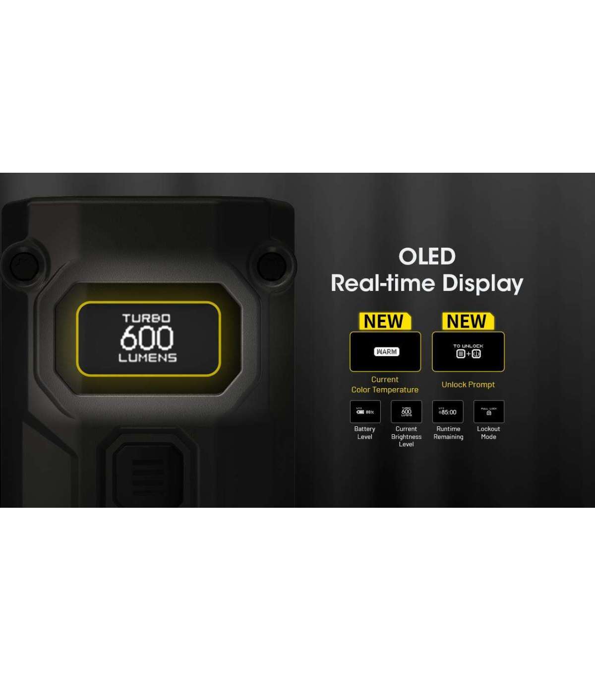 OLED Display: Provides real-time information on brightness level, battery percentage, and estimated runtime.