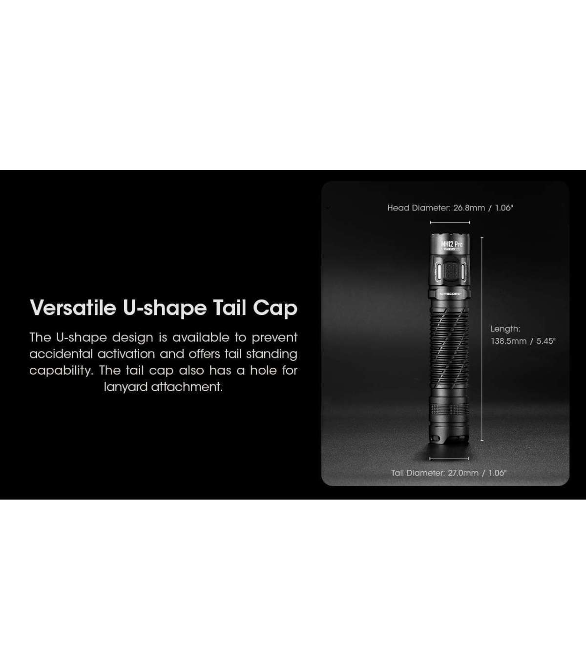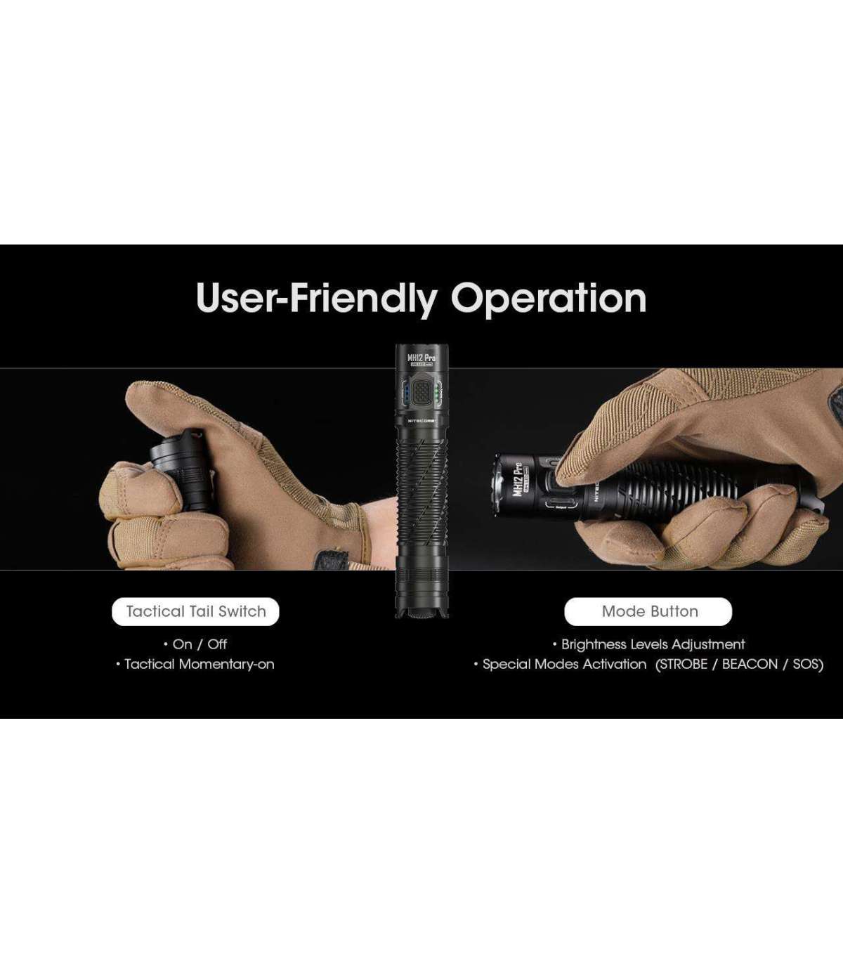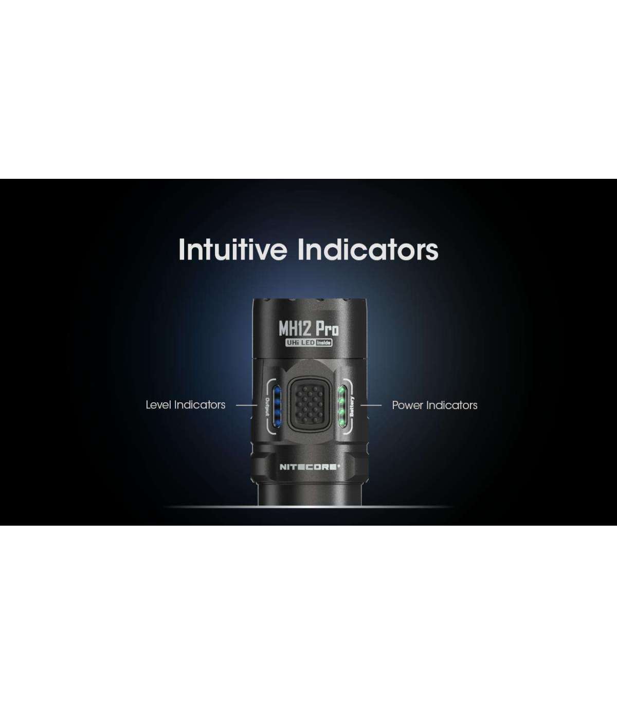 The Nitecore MH12 Pro rechargeable flashlight is incredibly bright yet still compact enough to serve as a duty light to carry every day. With its innovative UHi 40 LED from NiteLab, the MH12 Pro boasts a 3300 lumen output and a 552 yard throw, farther than 4 football fields length added together. You'll be well-prepared for any situation with its five brightness levels, as well as strobe, beacon, and SOS modes. The MH12 Pro features a Tactical Mode with five lighting settings and strobe, while the Daily Mode offers the same settings plus a Beacon and SOS mode. Level indicators beside the mode button will help you identify the current brightness level. Moreover, the MH12 Pro includes a built-in optical sensor that automatically reduces brightness when it detects an obstruction at close range to prevent blinding reflection or overheating.
