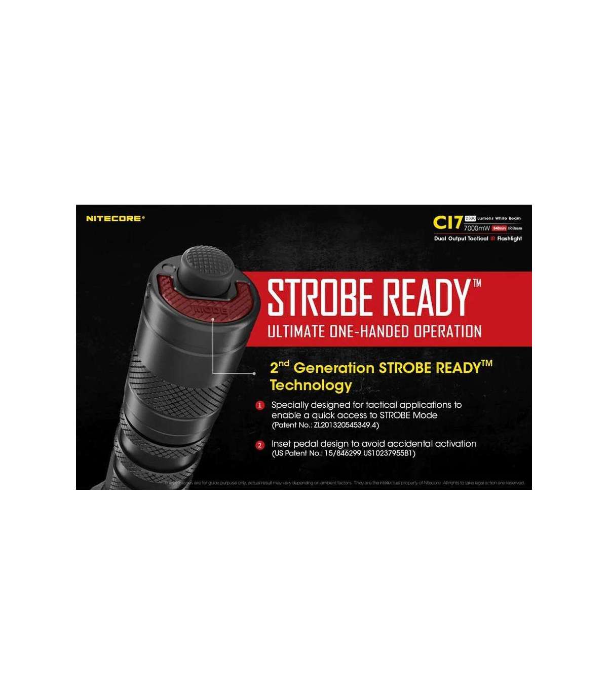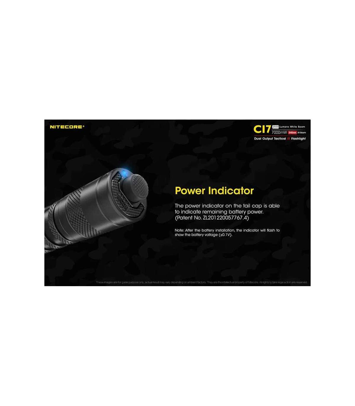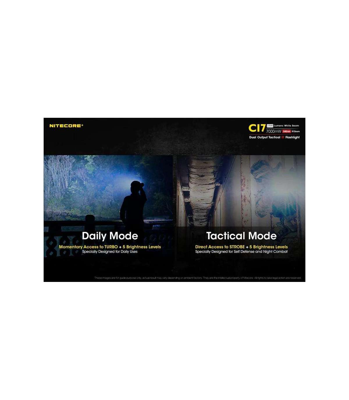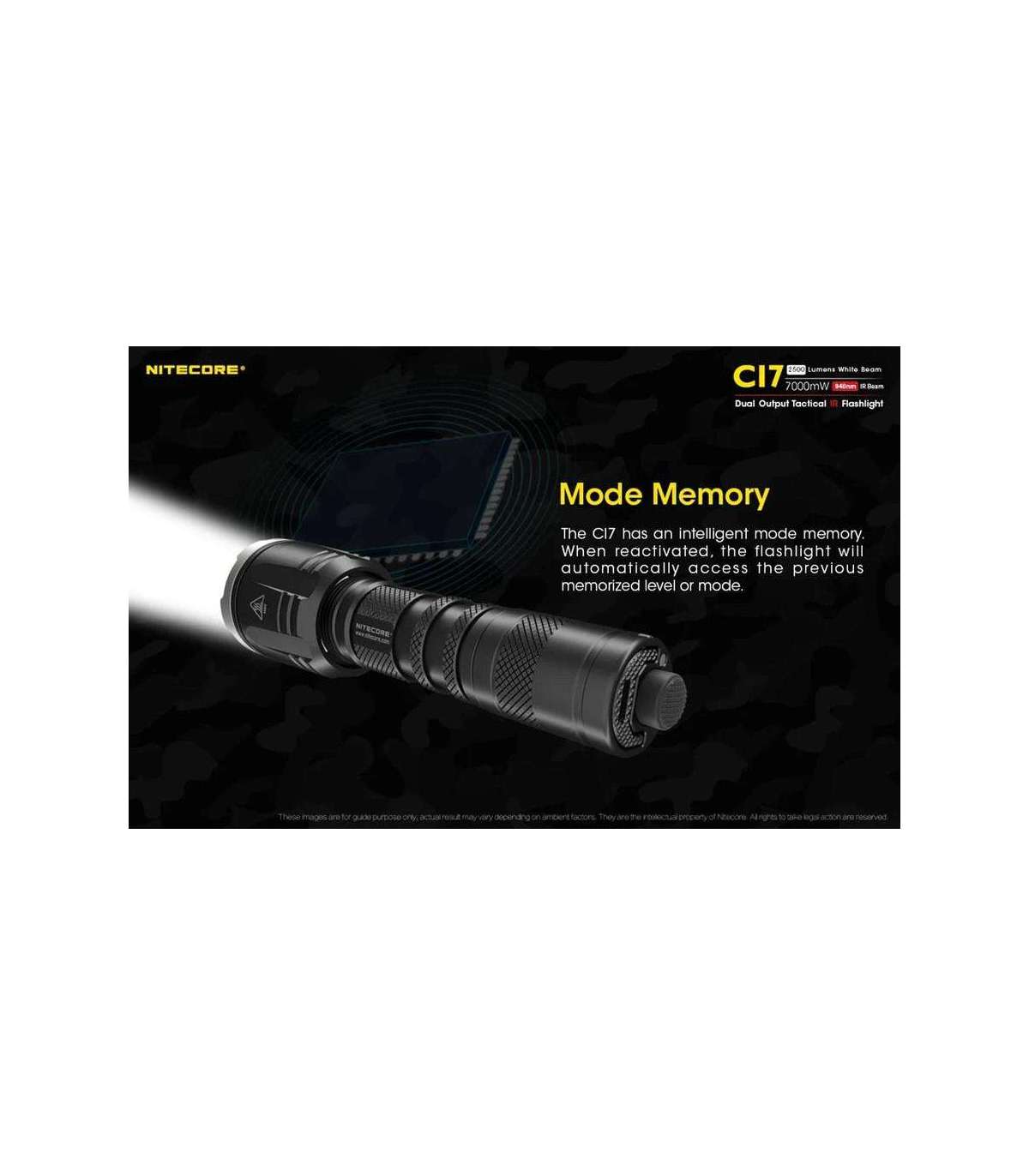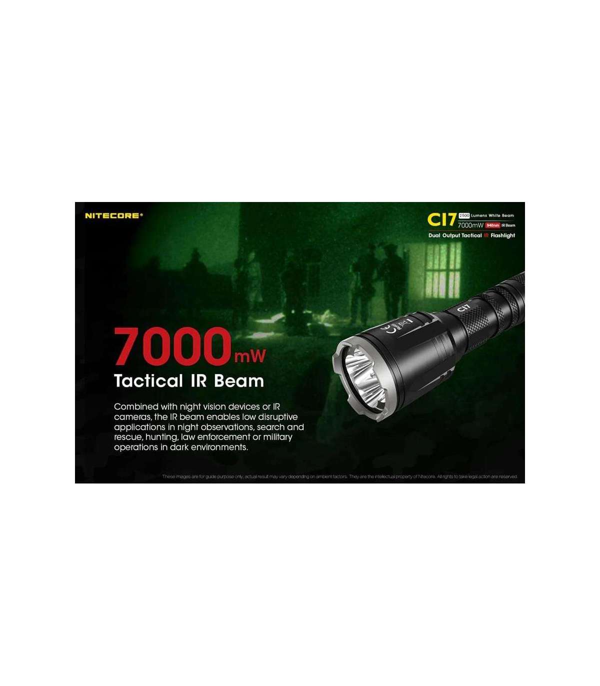 The NITECORE CI7 is the ultimate flashlight for night vision hunting or outdoor operations. This dual-output flashlight pushes an incredibly bright 2500 lumens of light, reaching over 300 yards. Rotating the flashlight head instantly turns the CI7 into an adjustable 7000mw long-range IR illuminator. This 940nm IR light is invisible to the human eye, and can only be detected by night vision or thermal vision. Providing both high power infrared and white light, this light enables you to quickly switch from stealth maneuvers to swift actions, which makes CI7 an indispensable tool for scouting, search and rescue, hunting, and law enforcement. The user-friendly NITECORE CI7 is designed to get you the right kind and amount of light you need when you need it. The end cap tail switch is capable of momentary-on and constant-on for both white and IR light. The improved “Strobe Ready” mode switch provides instant turbo or strobe access and cycles through brightness settings while preventing accidental activation. The CI7 comes with all the standard features you expect on a NITECORE flashlight, IP68 waterproof, mode memory, high-efficiency constant current, and advanced temperature regulation, the CI7 is an ideal flashlight.