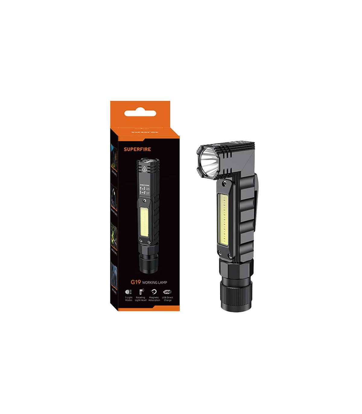 The functional Superfire G19 flashlight is distinguished by its high brightness thanks to 200 lumens, 200-meter light range and 800-capacity battery. With 5 light modes and the ability to use it in different ways, you can easily adjust it to your needs. Its light weight of 104 g and compact size make using its functionality easy and enjoyable. An additional COB lamp placed on the side offers even more possibilities.