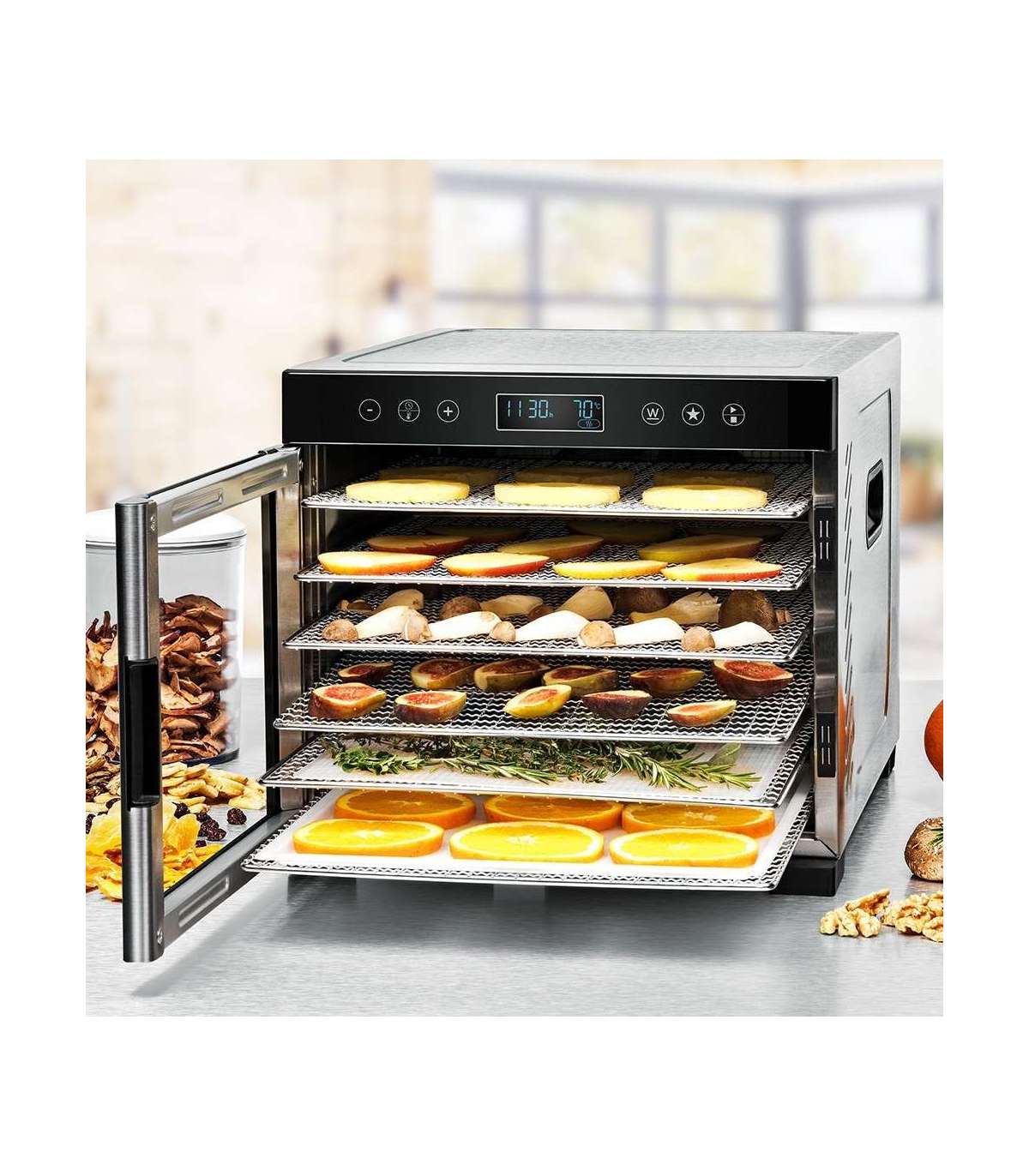 100% naturaalne ja tervislik kuivatamine säilitab praktiliselt kõik mineraalid, vitamiinid ja teised toimeained, mida organism vajab. Säilita õrnalt puuvilju, köögivilju, ürte, seeni, liha, kala... Kuivatiga saab valmistada suupisteteid, jogurti ja müsli lisandieid puu- ja köögiviljakrõpse, tervisliku köögi maitseaineid, garniire.