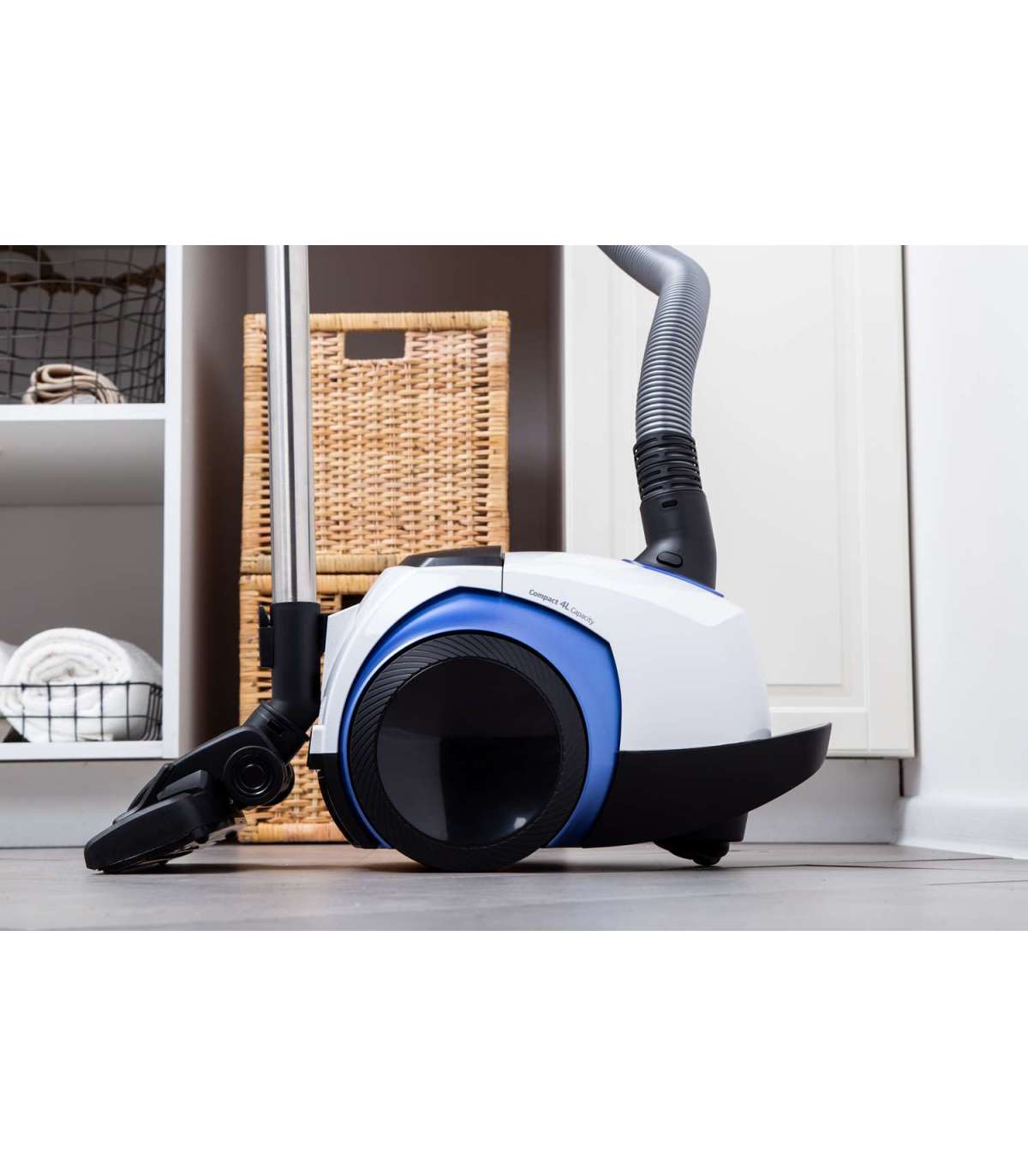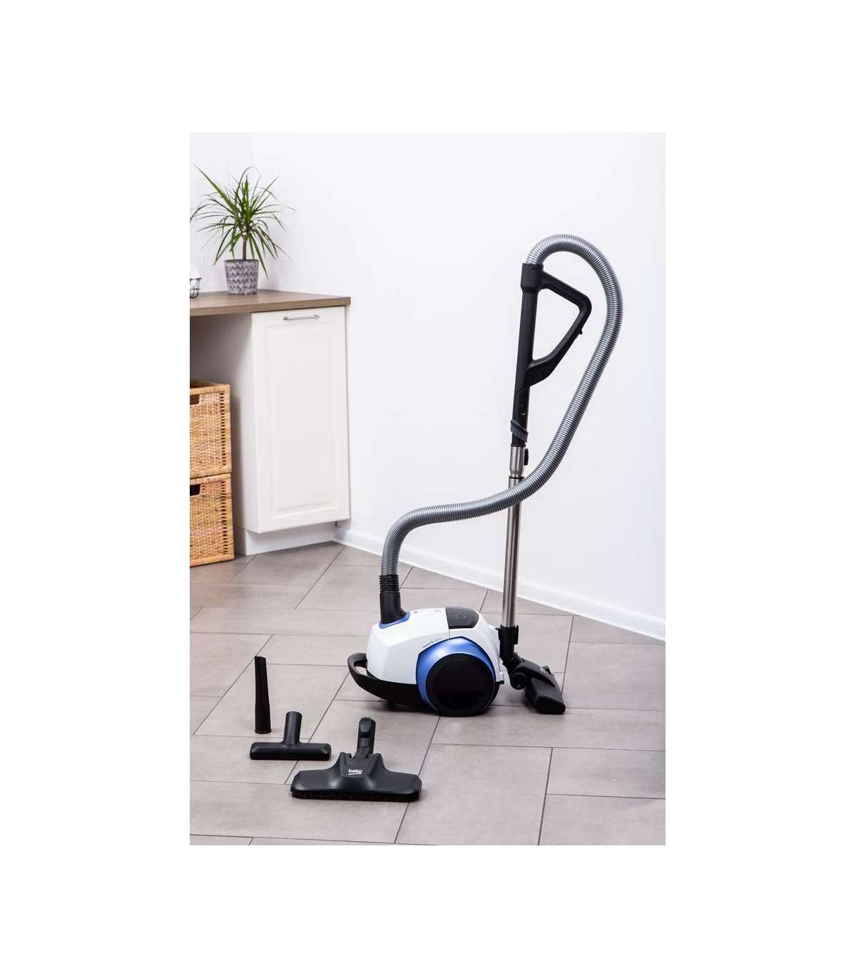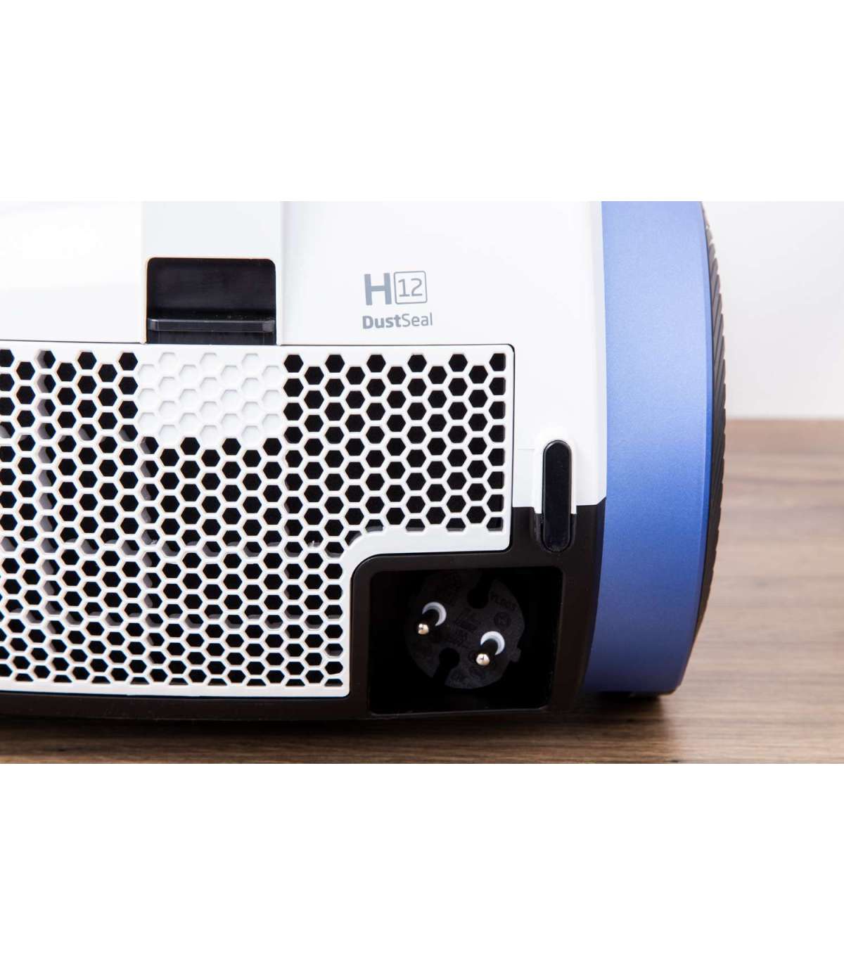 Mugav, käepidemelt juhitava võimsuse reguleerimisega ja suure tolmukoti mahutavusega (4,0 l) tolmuimeja, mootori võimsus 800 W, hügieeniline HEPA12 filter. Universaalhari, piluotsik, parketihari, metallist teleskooptoru, automaatne juhtme tagasikerimine, tööraadius 9 m. Madal müratase: 72 dB. Värv: valge/sinine.     Kõvapõranda puhastustõhusus A HEPA filter HEPA12 Tolmukoguja maht 4,0 l Teleskooptorud Automaatne juhtme kerimine Müratase 72 dB Värv valge Kaal 5,9 kg