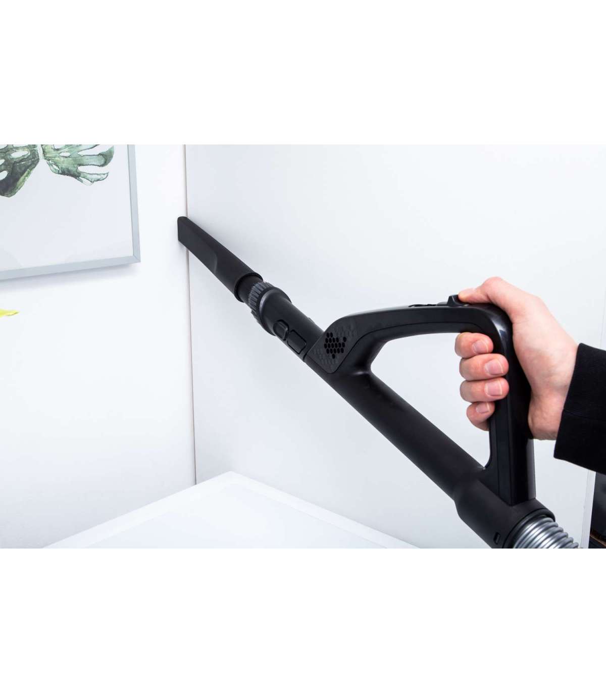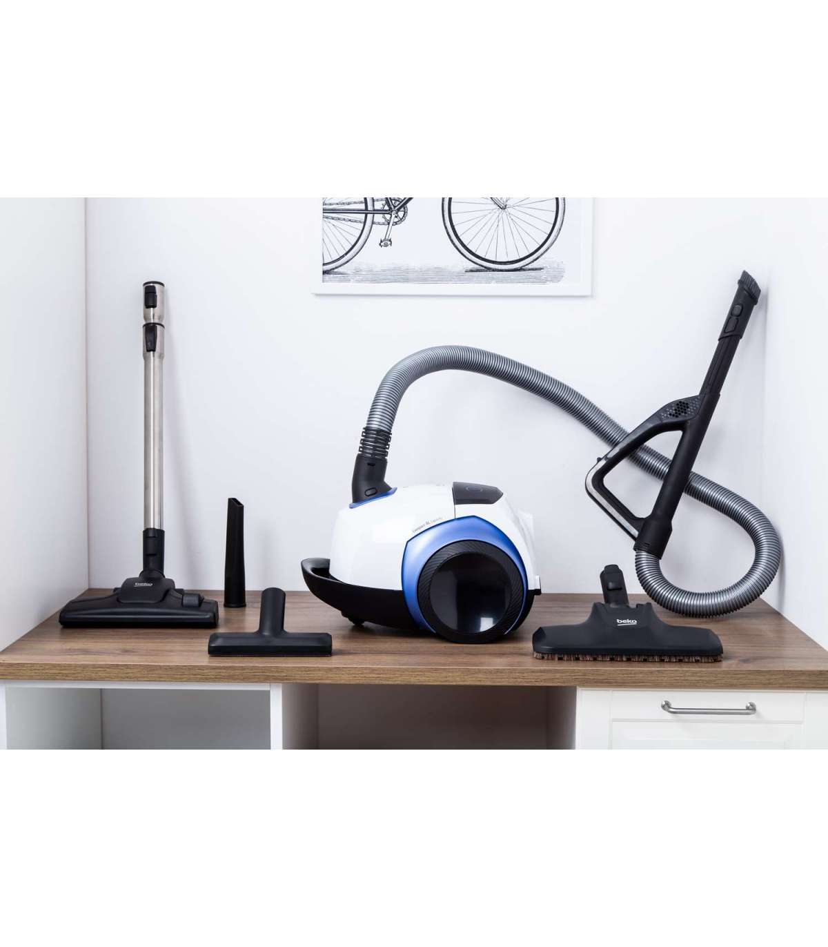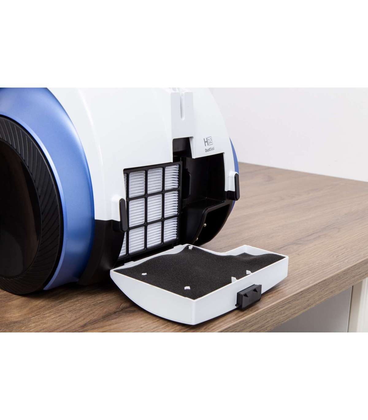 Mugav, käepidemelt juhitava võimsuse reguleerimisega ja suure tolmukoti mahutavusega (4,0 l) tolmuimeja, mootori võimsus 800 W, hügieeniline HEPA12 filter. Universaalhari, piluotsik, parketihari, metallist teleskooptoru, automaatne juhtme tagasikerimine, tööraadius 9 m. Madal müratase: 72 dB. Värv: valge/sinine.     Kõvapõranda puhastustõhusus A HEPA filter HEPA12 Tolmukoguja maht 4,0 l Teleskooptorud Automaatne juhtme kerimine Müratase 72 dB Värv valge Kaal 5,9 kg