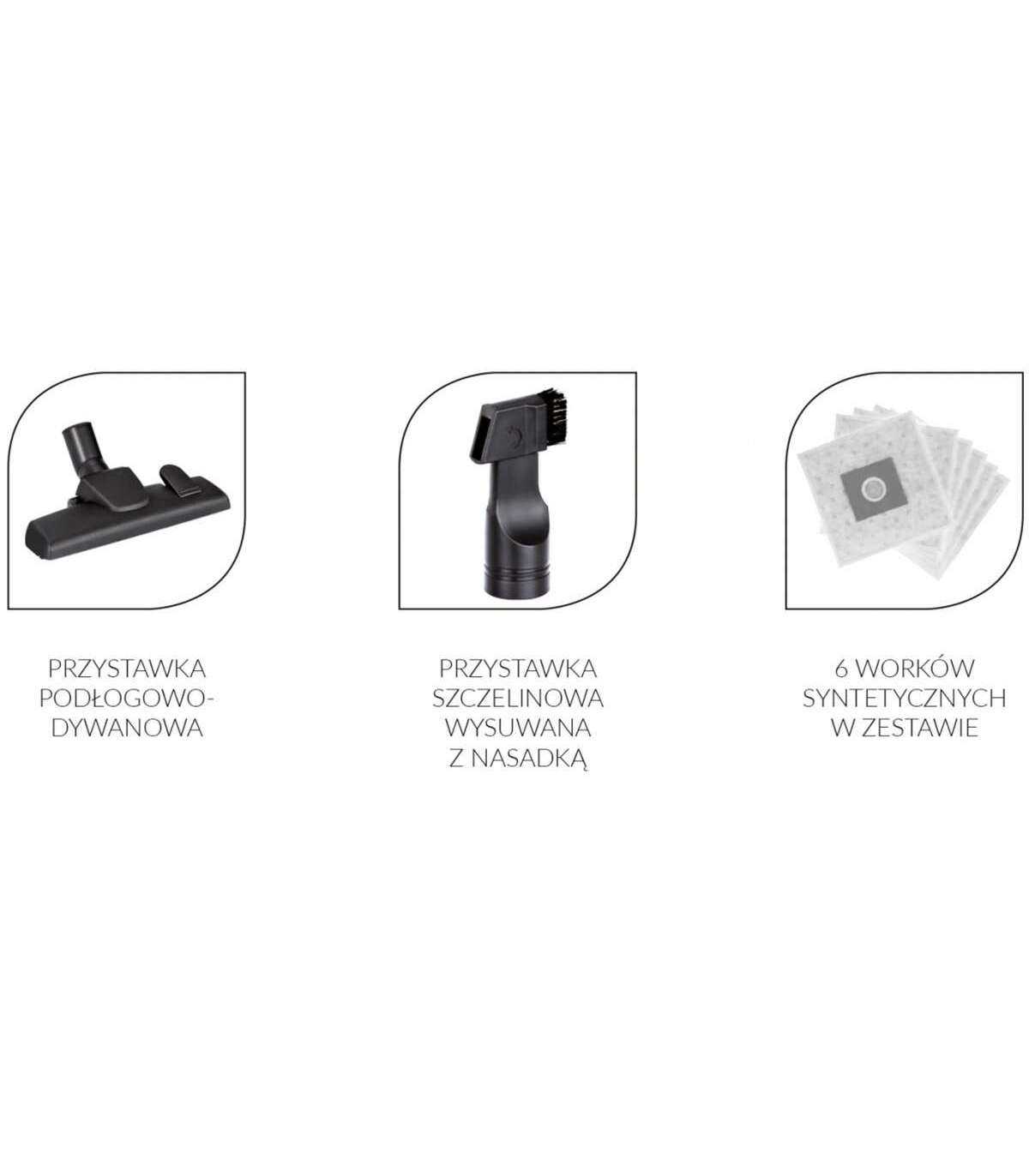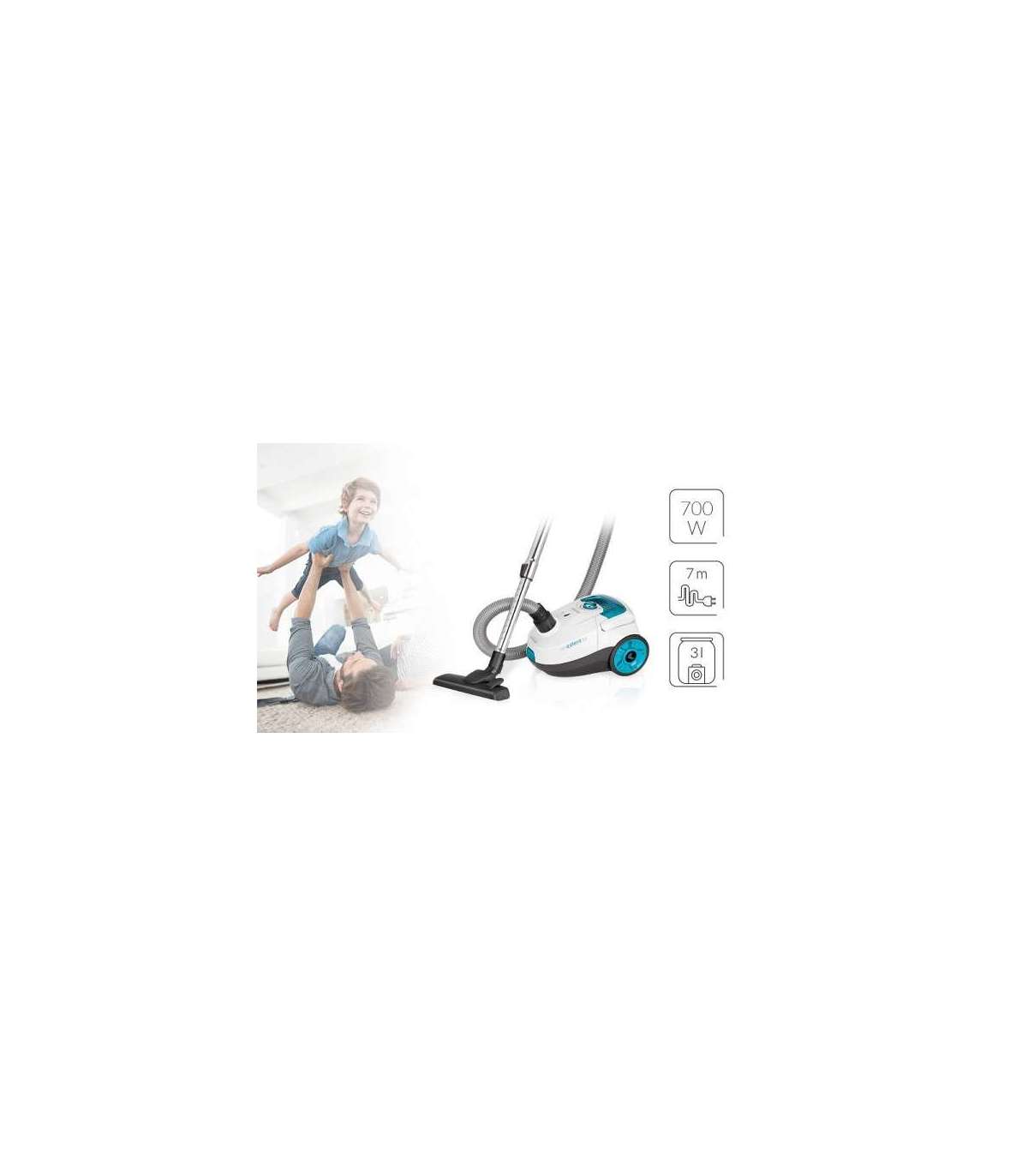 5-astmeline õhufiltrisüsteem 3,0-liitrine mikrofiltriga tolmukott HEPA 13 filter 2 käsnfiltrit vahtfilter reguleeritav imemisvõimsus tolmukoti täituvuse taseme inddikaator metallist teleskooptoru vertikaalne ja horisontaalne hoiustamisasend 360° pööratav voolikupesa lihtsaks manööverdamiseks kandesang 4,2 m toitejuhe 7,0 m tööraadius põranda ja vaiba otsik pikendatav piluotsik toide: 220–240V 50/60Hz võimsus: 700W