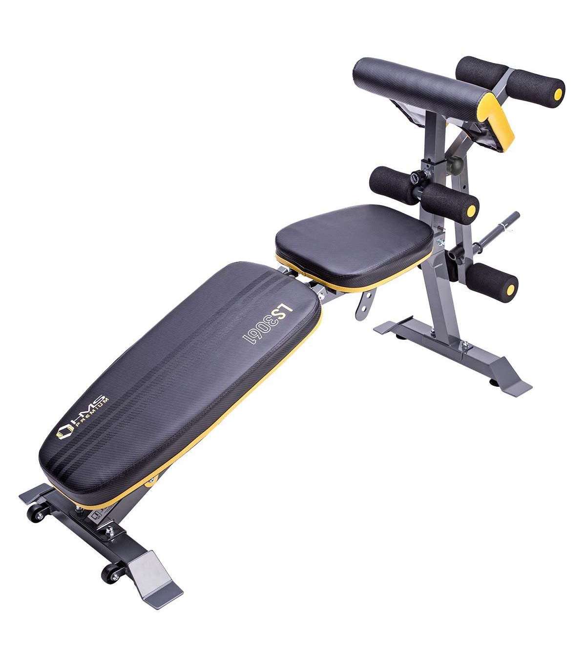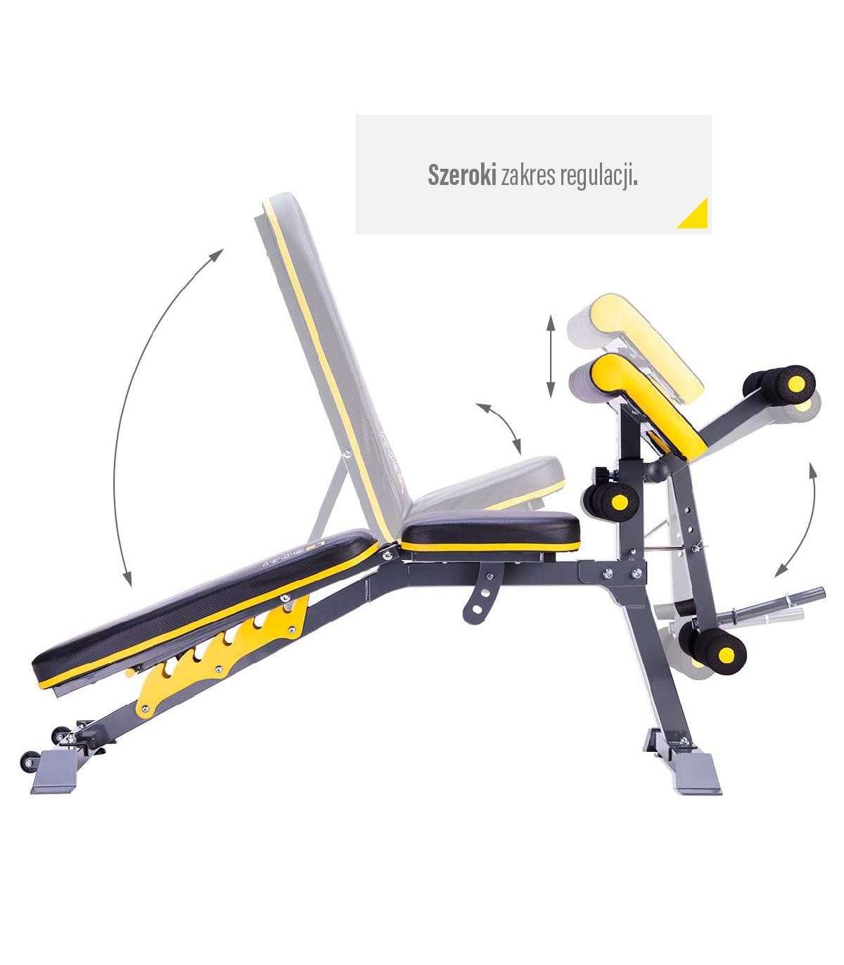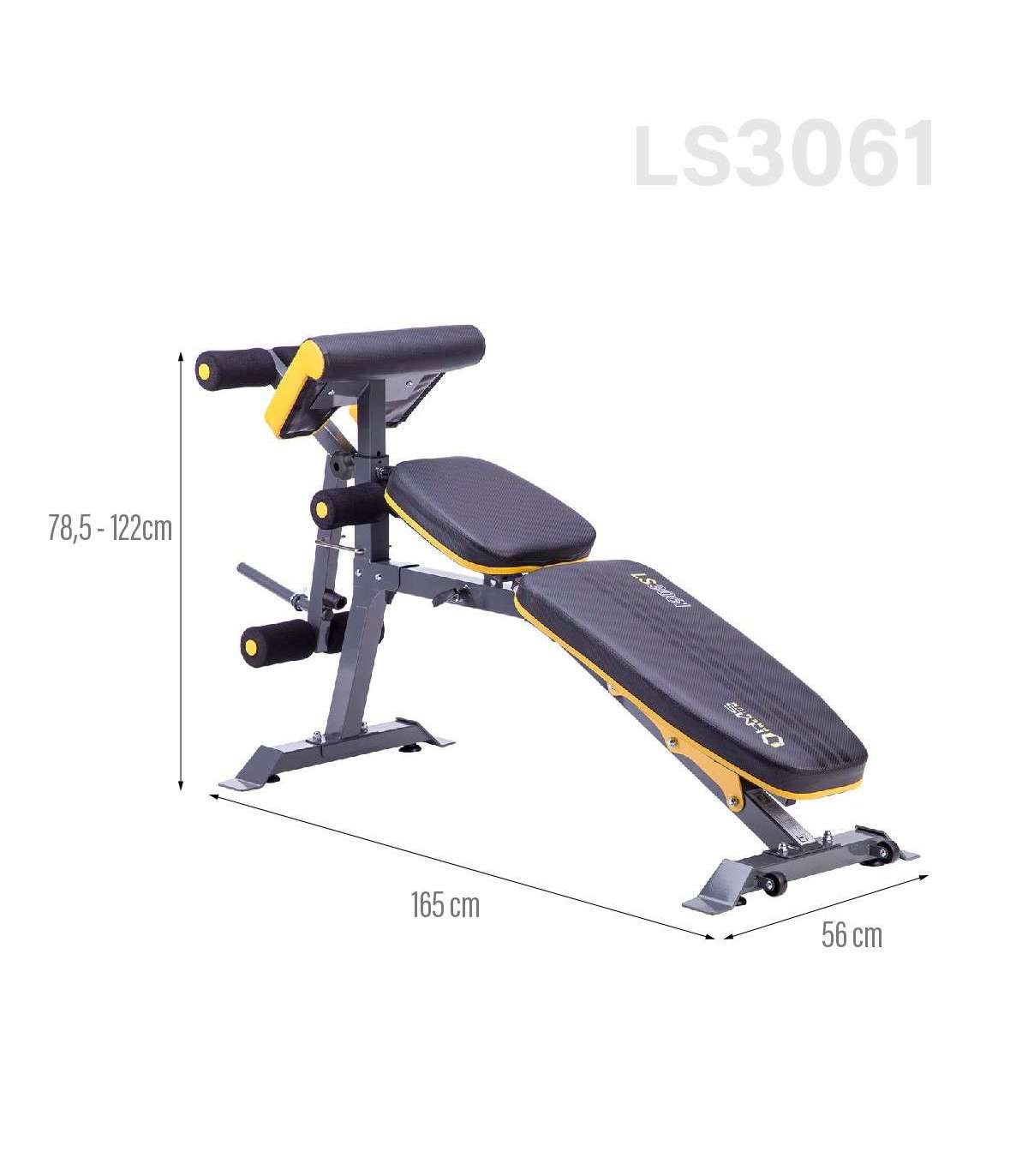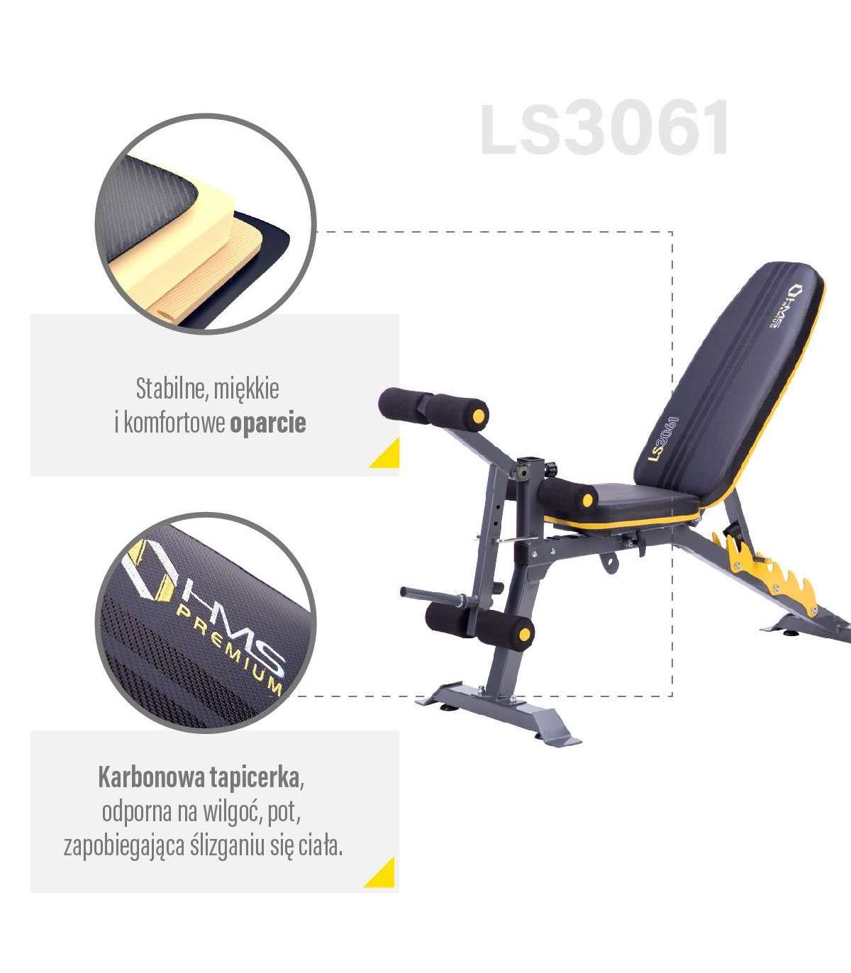 LS3061 HMS PREMIUM is a bench with a prayer bar designed for training with barbells or dumbbells.4 in 1 benchThe bench offers plenty of workout options. Its structure makes it cooperates with a rack perfectly well, as well as it is great for training with dumbbells. Range of adjustment of the backrest angle makes the exercised muscle is fully extended. It is possible to perform exercises for the chest and shoulders. The backrest set diagonally down enables sit-ups. The leg holder guarantees comfort and safety while performing this exercise, engaging abdominal muscles. The bench is equipped with a prayer bar, which increases the range of exercise options by the biceps training. After the prayer bar has been dismounted we gain the ability to perform leg training. Using the leg press one can perform exercises for quadriceps muscles. By placing the bench in a horizontal position, lying on your stomach and hooking your feet you can perform leg bends with a load, thus engaging the quadriceps.Comfort and convenienceSolid board provides stability to the backrest while a soft sponge offers comfort and convenience during a workout. Thickness of the sponge is very important as it has a direct impact on the ideal position of the body. Modern carbon upholstery is resistant to the moisture and the sweat and it prevents the body from slipping during an exercise. It is also very pleasant to touch.Many adjustment possibilitiesThe bench has a wide range of adjustment of the backrest, seat and height of the prayer bar. Such extensive maneuverability of the bench position makes one can freely adjust it to specific height and to a specific exercise.Stylish designThe bench is comfortable and functional, but also stylish. Combination of the black carbon material with yellow embroidered elements gives a great visual effect characteristic for the HMS brand PREMIUM.LS3061 HMS PREMIUM is a must-have item on your home gym equipment list.Specification:Material: steel, foam, wood, PVCDimensions:Length: 165 cmWidth: 56 cmHeight: 78,5 - 122 cmBackrest:Length: 75 cmWidth: 33.5 cmThickness: 6.5 cmSeat:Length: 36.5 cmWidth: 32.5 cmThickness: 6.5 cmPreacher:Length: 28 cmWidth: 41 cmThickness: 5.5 cmHeight: 85 – 97 cmLoad sleeve:Length: 18 cmDiameter: 25 mmAdjustments:Backrest: 6 levels + total slantSeat: 3 levelsPreacher: 4 levels, every 4 cmProfileSize: 50 x 50 mmThickness: 1.3 mmMaximum load (with user): 270 KGMaximum load on the legs: 180 KGProduct weight: 20 kgRemarks:Not intended for commercial use24 months warrantyImporter: Abisal Ltd. | Poland | 41-807 Zabrze | Pyskowicka Street 17 | e-mail: abisal@abisal.plAbisal Ltd.. declares that the products sold by the company are safe and meet the requirements contained in the Act on General Product Safety of December 12, 2003. (Journal of Laws of December 31, 2003)