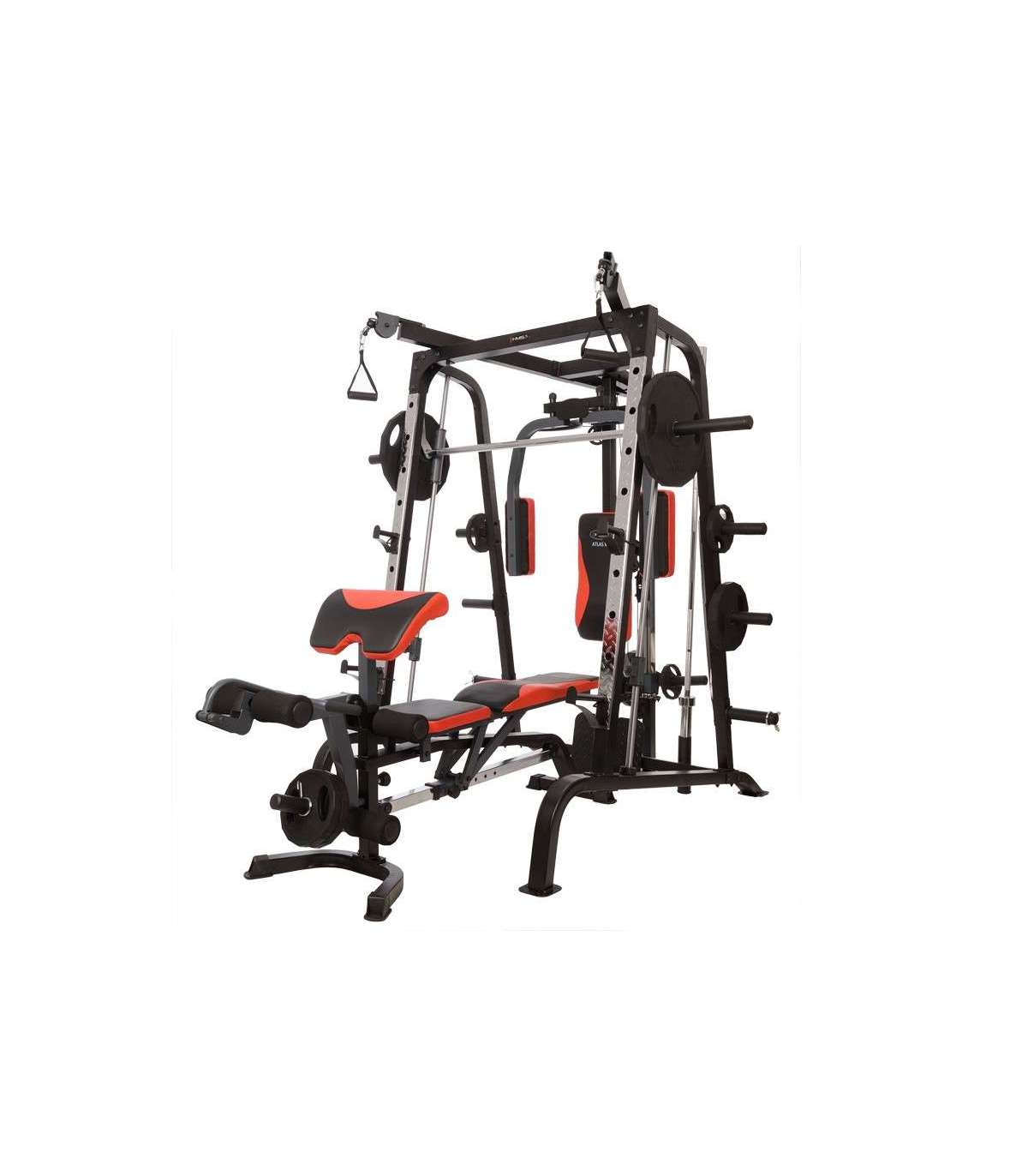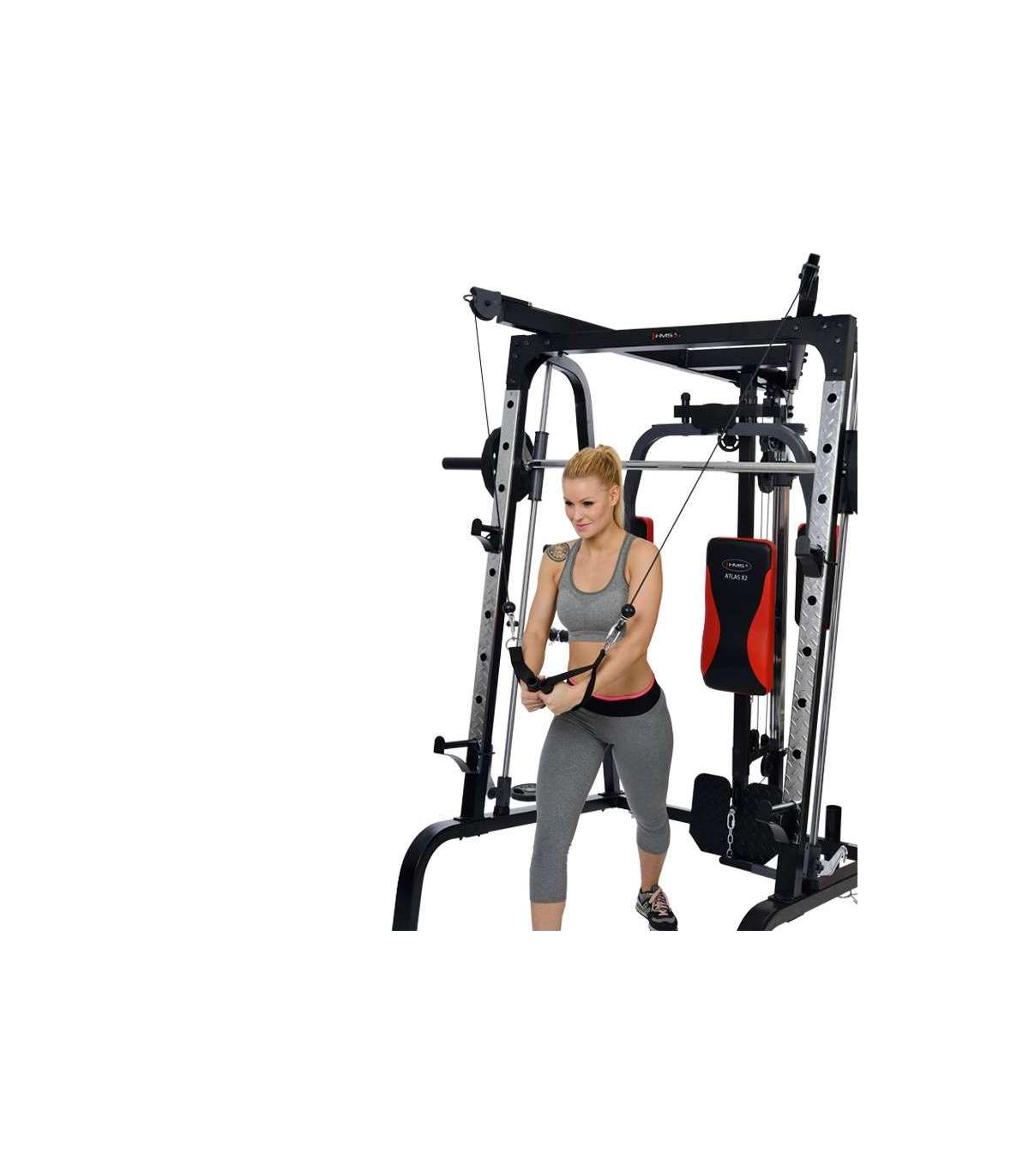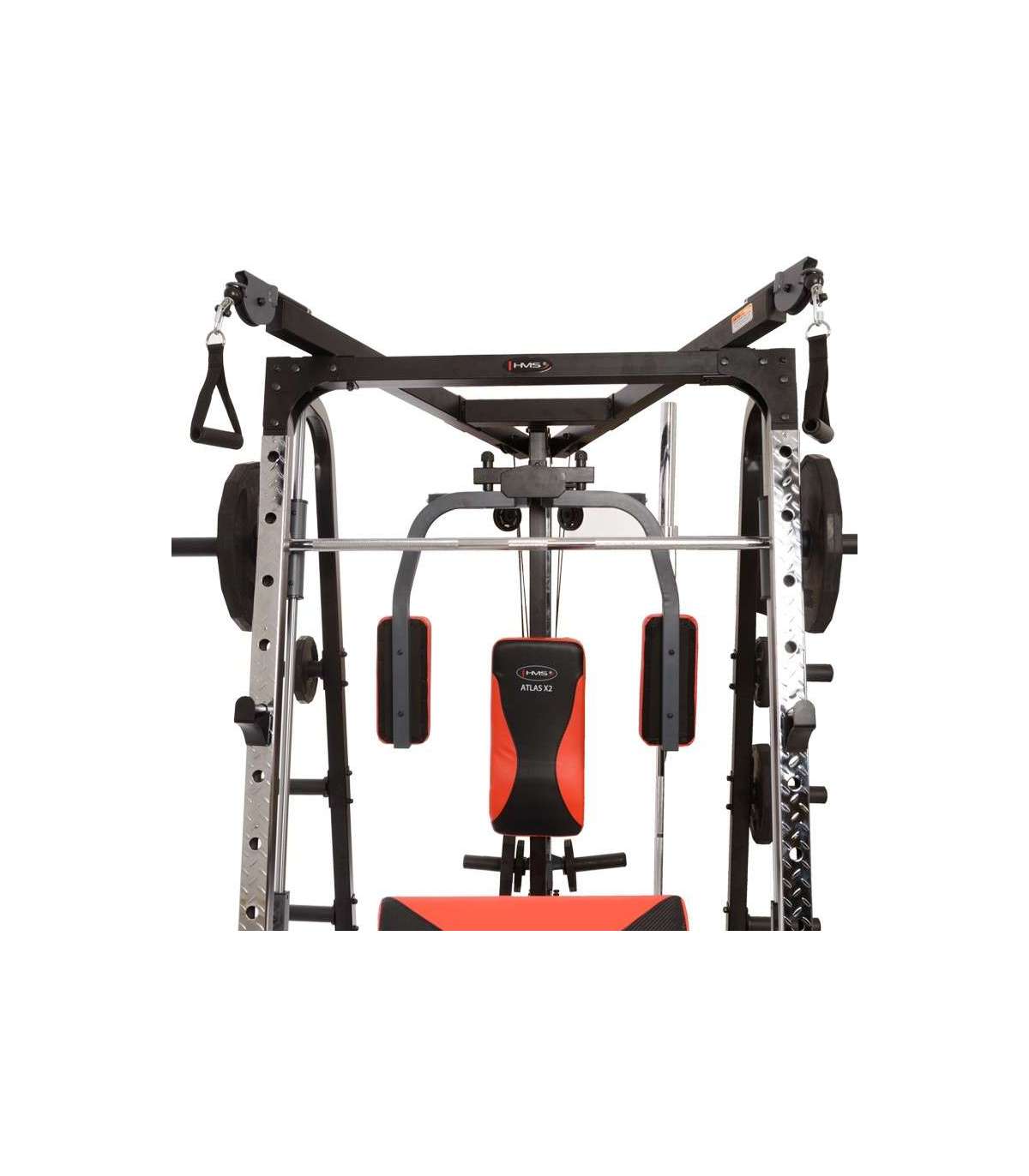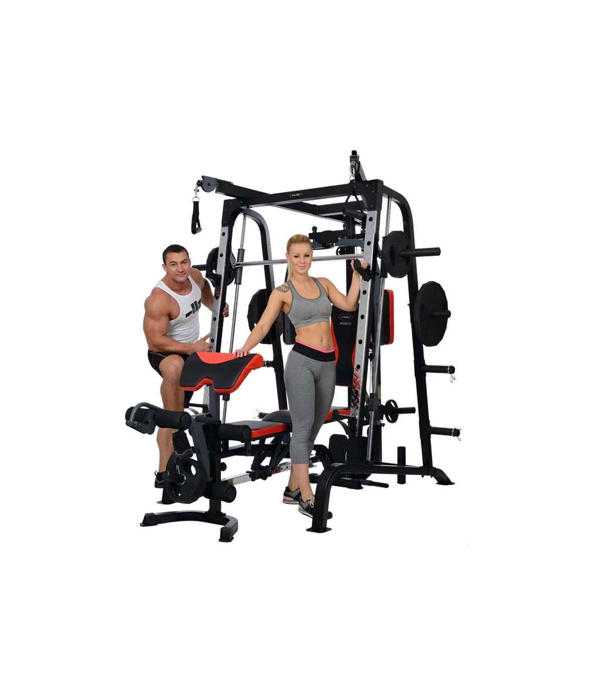 X2 HMS hone gym is amodern Smith machine. This multi-functional design will satisfy even the most demanding users.Atlas HMS X2 is a device for comprehensive training of the whole body. It is extensive equipment allows harmoniously develop both the upper and lower parts of the muscle. It’s up to the user to decide how to build a set of exercises to find the optimal formula.Smith machine Atlas HMS X2 consists of the most important instruments for the development of muscles. The main one is Smith machine, which due to the high quality bearings, runs extremely smoothly and quietly. More than that, they are: vertical butterfly, high pulleys, low pulley, leg developer station and preacher curl station. Such a wide range of instruments combined with the possibility of using free weights, making Atlas X2 HMS ideal device for people seriously thinking about systemic development of the muscles of the body.The central element of the Smith machine is multifunctional, solid bench – to conduct training in a standing position just pull it out. It is largely responsible for the comfort of the user, therefore, it is equipped with a multistage adjustment mechanism of the seat and backrest. For user comfort we equipped it also in durable sponge and a modern and durable upholstery with carbon fiber pattern.High quality Smith machine Atlas HMS X2 ensures trouble-free operation for a long time. Starting from the frame constructed from durable, powder-coated steel, through upholstery finish, the system of pulleys and rope tensioning device meets the highest technical and aesthetic standards. We recommend it to all people looking for a versatile and durable device for home use.Exercises for muscles:pectoralsback musclesabdominalsdeltoid musclesarms muscleslegs musclesEquipment:Smith machinevertical butterflywide-grip high pulleyhigh-pulley curlslow pulleyleg developer stationpreacher curl stationSpecification:Dimensions:length: 242 cm length without bench: 167 cmwidth: 205 cmheight: 219 cm frame: 60 × 2 × 1731 mmBar:length: 196 cmdiameter: 25 mmBearing in every pulleyLinear bearings in the mechanism of the Smith machineType of loading: free weightHooks for free weights, diameters 50 and 25 mmMultifunctional, solid benchModern and durable upholsteryCable tension adjustmentSupport system: 9 levelsSupport for the barAnkle strapPackages: 3 szt.Finish: powder-coated steelFrame color: blackMaximum load (weights + user weight): 272 kgMaximum weights on leg developer: 45kgMaximum weights on cross-over, lat pull: 90kgMaximum user weight: 135 kgTotal weight: 168 kgRemarks:24 months warrantyImporter: Abisal Ltd. | Poland | 41-807 Zabrze | Pyskowicka Street 17 | e-mail: abisal@abisal.plAbisal Ltd.. declares that the products sold by the company are safe and meet the requirements contained in the Act on General Product Safety of December 12, 2003. (Journal of Laws of December 31, 2003)