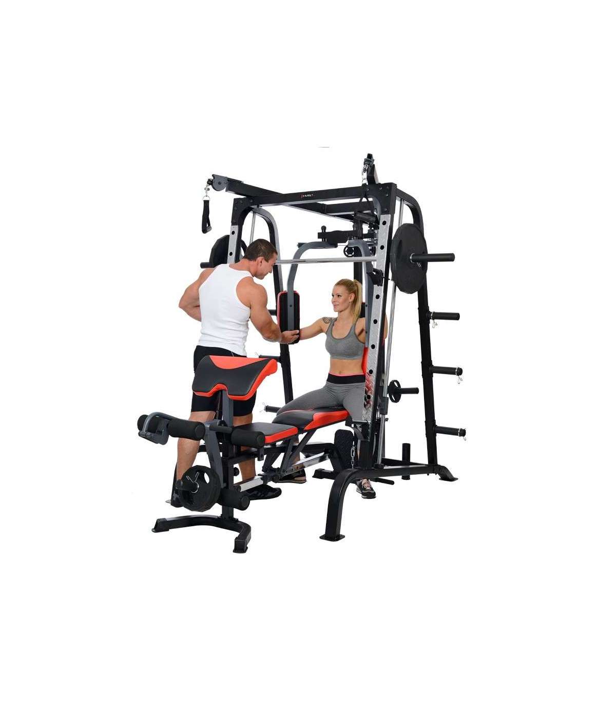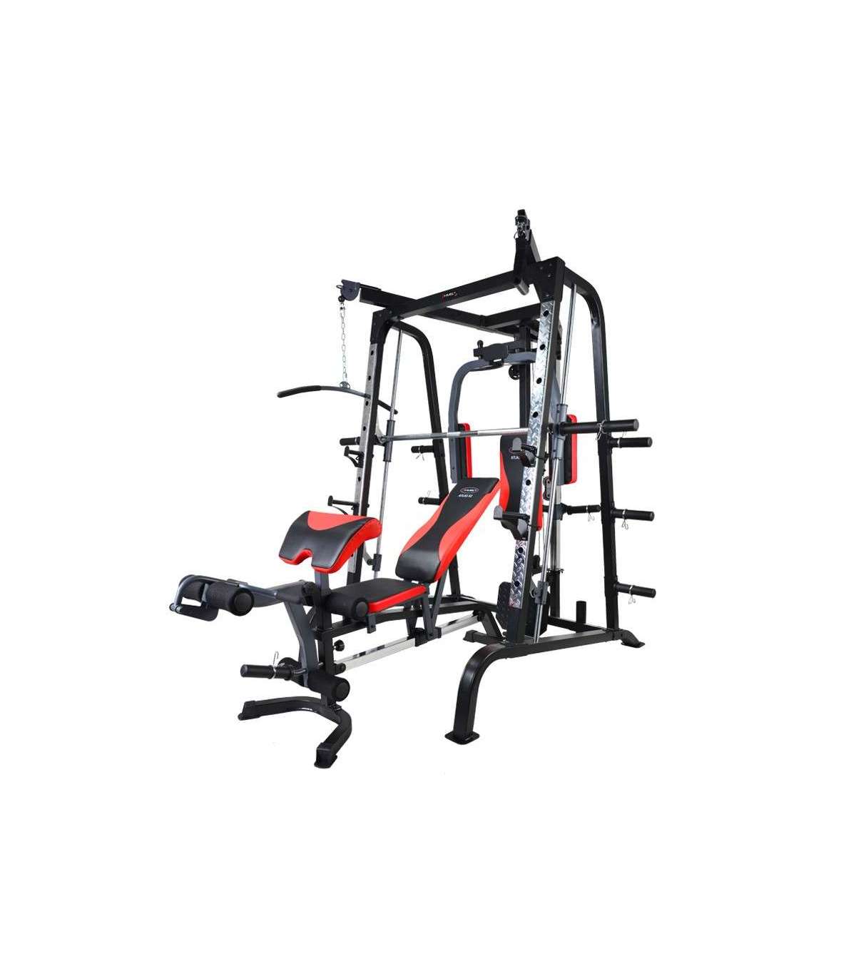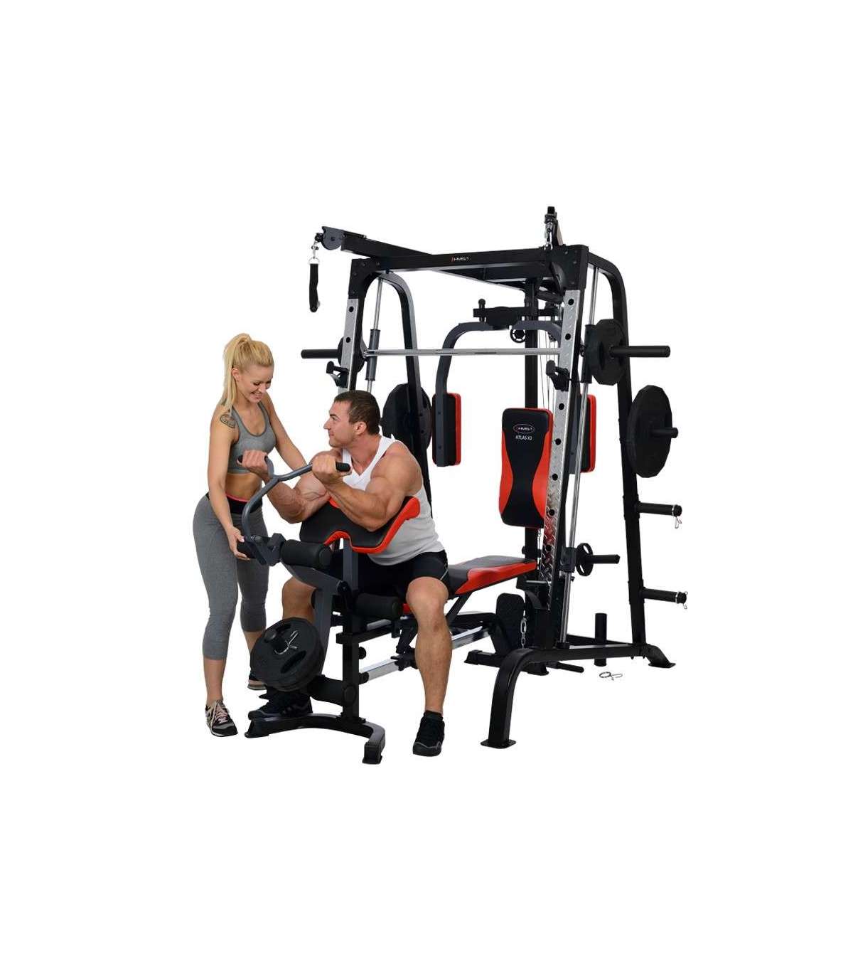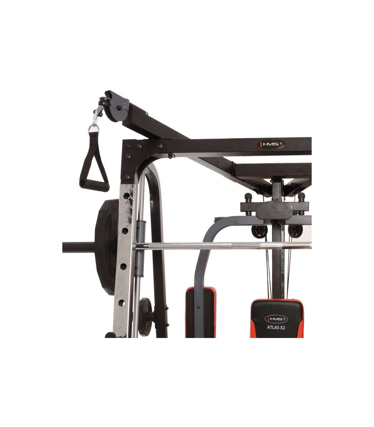 X2 HMS hone gym is amodern Smith machine. This multi-functional design will satisfy even the most demanding users.Atlas HMS X2 is a device for comprehensive training of the whole body. It is extensive equipment allows harmoniously develop both the upper and lower parts of the muscle. It’s up to the user to decide how to build a set of exercises to find the optimal formula.Smith machine Atlas HMS X2 consists of the most important instruments for the development of muscles. The main one is Smith machine, which due to the high quality bearings, runs extremely smoothly and quietly. More than that, they are: vertical butterfly, high pulleys, low pulley, leg developer station and preacher curl station. Such a wide range of instruments combined with the possibility of using free weights, making Atlas X2 HMS ideal device for people seriously thinking about systemic development of the muscles of the body.The central element of the Smith machine is multifunctional, solid bench – to conduct training in a standing position just pull it out. It is largely responsible for the comfort of the user, therefore, it is equipped with a multistage adjustment mechanism of the seat and backrest. For user comfort we equipped it also in durable sponge and a modern and durable upholstery with carbon fiber pattern.High quality Smith machine Atlas HMS X2 ensures trouble-free operation for a long time. Starting from the frame constructed from durable, powder-coated steel, through upholstery finish, the system of pulleys and rope tensioning device meets the highest technical and aesthetic standards. We recommend it to all people looking for a versatile and durable device for home use.Exercises for muscles:pectoralsback musclesabdominalsdeltoid musclesarms muscleslegs musclesEquipment:Smith machinevertical butterflywide-grip high pulleyhigh-pulley curlslow pulleyleg developer stationpreacher curl stationSpecification:Dimensions:length: 242 cm length without bench: 167 cmwidth: 205 cmheight: 219 cm frame: 60 × 2 × 1731 mmBar:length: 196 cmdiameter: 25 mmBearing in every pulleyLinear bearings in the mechanism of the Smith machineType of loading: free weightHooks for free weights, diameters 50 and 25 mmMultifunctional, solid benchModern and durable upholsteryCable tension adjustmentSupport system: 9 levelsSupport for the barAnkle strapPackages: 3 szt.Finish: powder-coated steelFrame color: blackMaximum load (weights + user weight): 272 kgMaximum weights on leg developer: 45kgMaximum weights on cross-over, lat pull: 90kgMaximum user weight: 135 kgTotal weight: 168 kgRemarks:24 months warrantyImporter: Abisal Ltd. | Poland | 41-807 Zabrze | Pyskowicka Street 17 | e-mail: abisal@abisal.plAbisal Ltd.. declares that the products sold by the company are safe and meet the requirements contained in the Act on General Product Safety of December 12, 2003. (Journal of Laws of December 31, 2003)