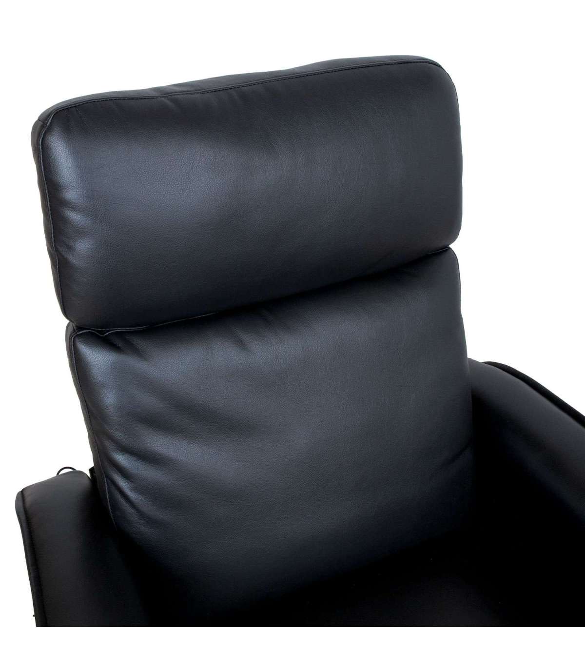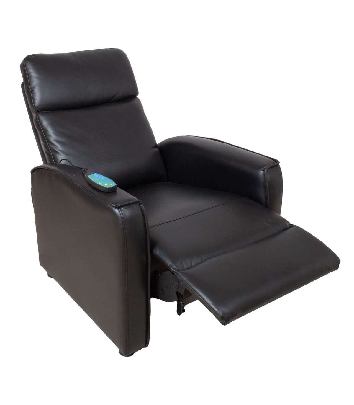 Massaa˛itool STANTON push back recliner, must kunstnahk. Recliner tüüpi tugitooli selja- ja jalatoe asendit on võimalik muuta manuaalse push back mehhanismi abil. Sellise mehhanismi tüübi puhul puudub nupp või kang tugitooli asendi reguleerimiseks. Mehhanism käivitub, kui seljatoele avaldada survet. Toolil on puldiga juhitav massaa˛ifunktsioon. Võimalik on valida mitme erineva intensiivsusega programmi vahel. Kattematerjal: pehme kunstnahk 15% PU, 85% polüester. Polsterdus: taaskasutatud polüuretaanvaht 60kg/m³. Tooli üldmõõdud on 74x90xH102cm. Istme laius 50cm, istme sügavus 53cm, istme kõrgus 45cm. Seljatoe kõrgus 67cm. Käetoe kõrgus maast 60cm.