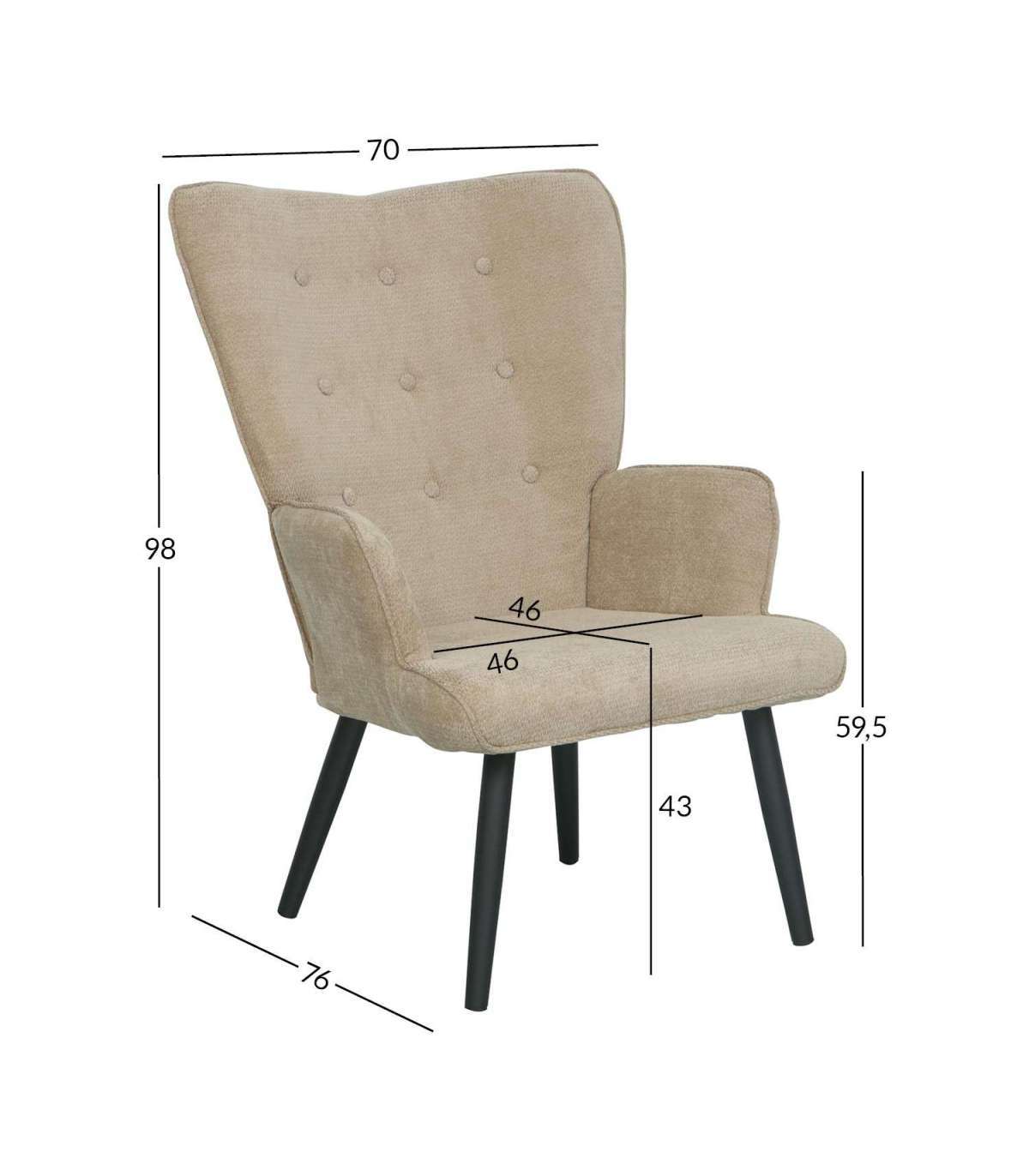 Istme laius 46 cm, istme sügavus 46 cm, istme kõrgus 43 cm. Käetoe kõrgus maast 59,5 cm.