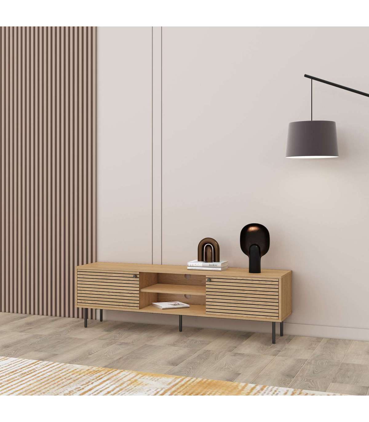 TV laud on valmistatud tammedekooriga melamiinplaadist.