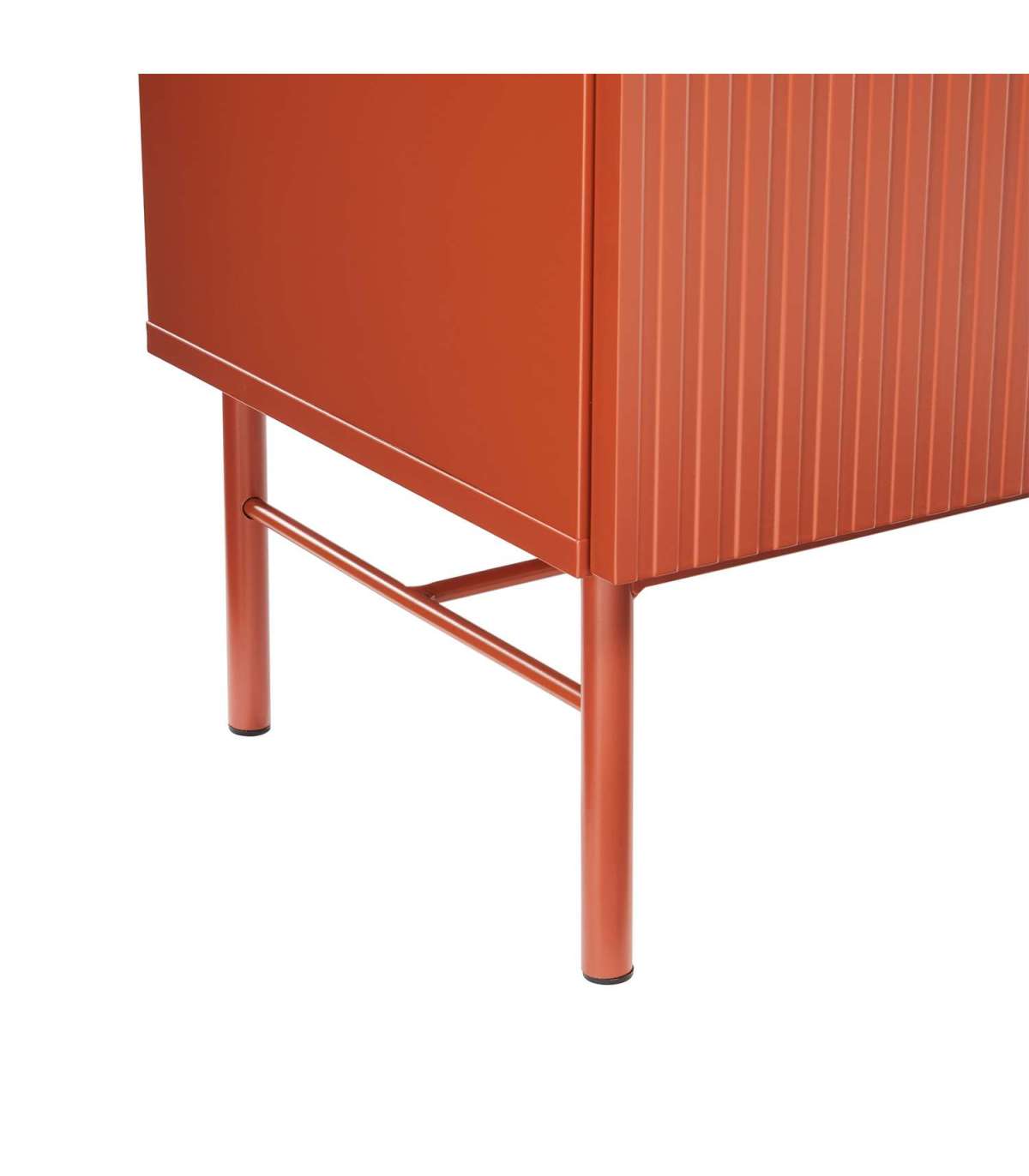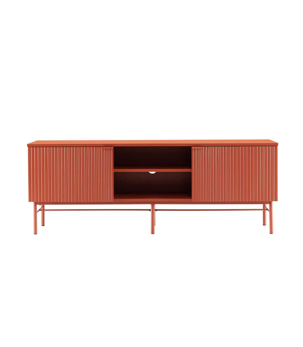 TV laud SEQUENCE 2-ukse ja avatud riiuliga 150x40xH55cm, sügispruun. TV laua korpus on valmistatud MDF plaadist. Reljeefse pinnaga triibulised uksepaneelid annavad lauale omanäolise ja trendika välimuse. TV laud on viimistletud vastupidava polüuretaanvärviga. Metallist alusraam ja jalad on viimistletud pulbervärviga.