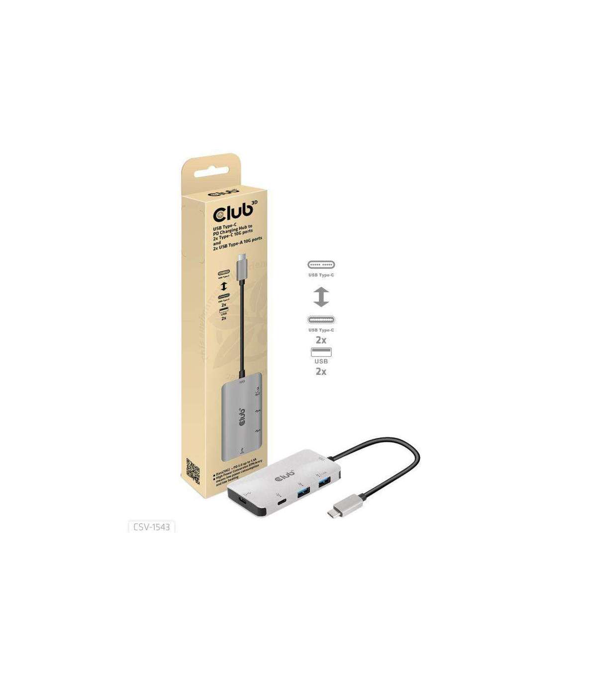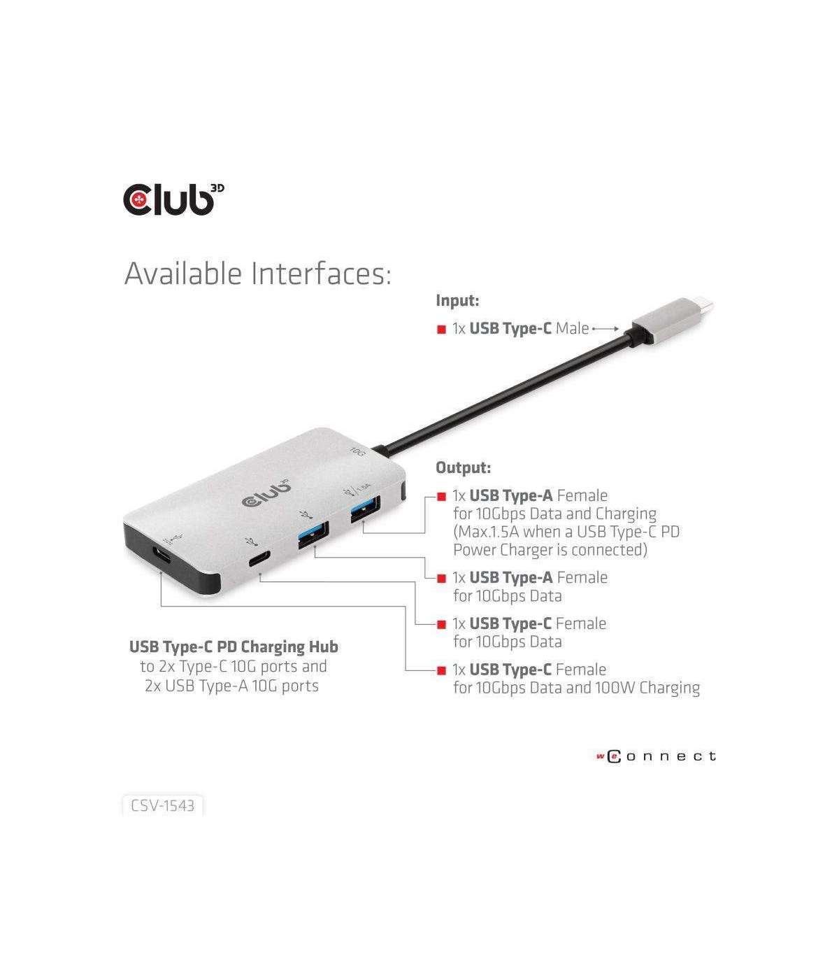 The Club 3D CSV-1543 is an USB Type-C PD Charging Hub to 2x Type-C 10G ports and 2x USB Type-A 10G ports. The two USB Type-A ports are designed for transmitting data and one of the two USB Type-A ports can provide 1.5A charging for the connected USB Type-A devices (mobile phones, tablets, U-disk, etc). One of the two USB Type-C ports is designed for transmitting data and charging for the connected USB Type-C device, the other USB Type-C port supports both data and PD3.0 charging. It can work on any USB Type-C host (PC, notebook, tablet, Mobile phone, etc) that supports Power Delivery 3.0.High Power Conversion Efficiency means low power consumption and low heating 98.2%@Vin=5V; 92.5% @Vin=20V.Advanced Power Management. The output power will guarantee uninterrupted working of USB Type-A SSD and U Disk when the Vin is in 5; 20V, so the connected USB device will not get disconnected while plugging in and out the PD Charger from the USB Type-C charging port. Supported USB device current is as follows: 1.5A @PD3.0 device Note: 1) When the current of the connected USB device is higher than the above listed current, the USB device will get disconnected while plugging the PD Charger and reconnect in a few seconds
